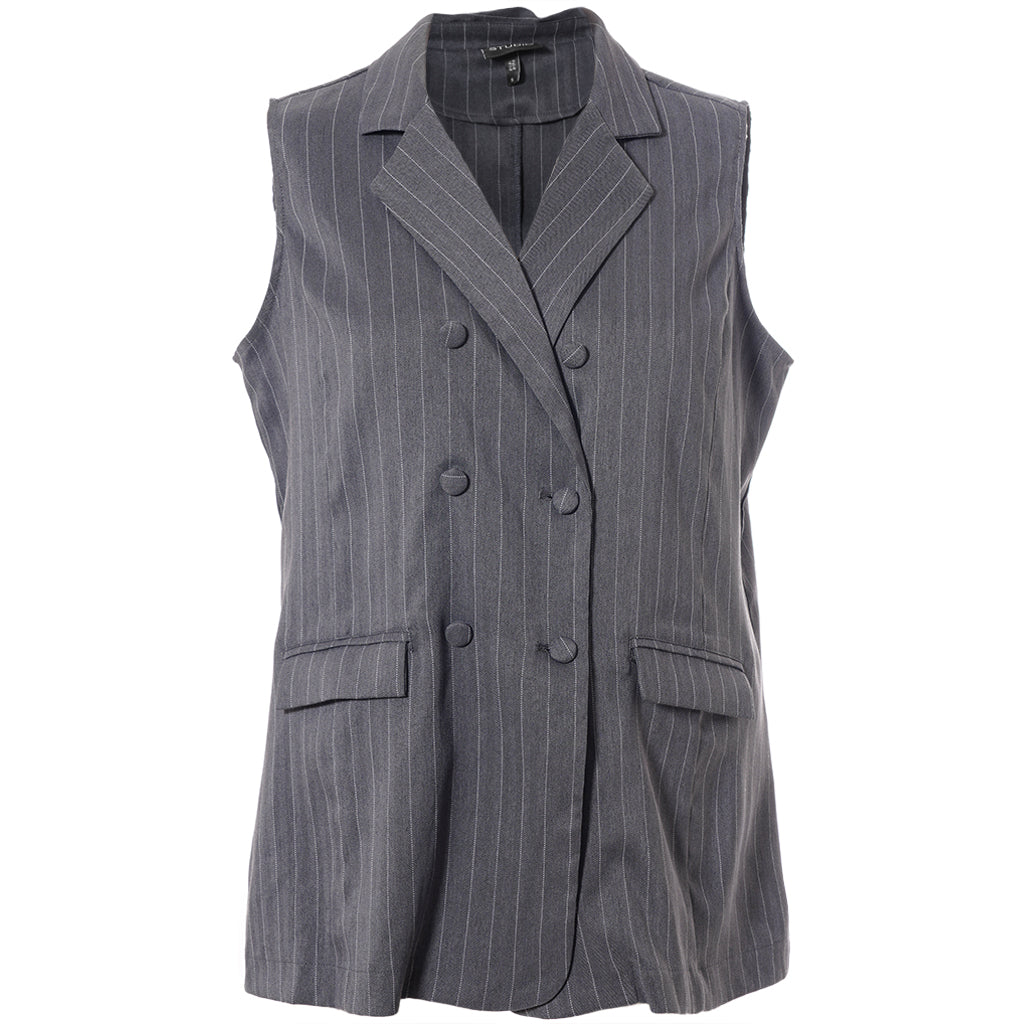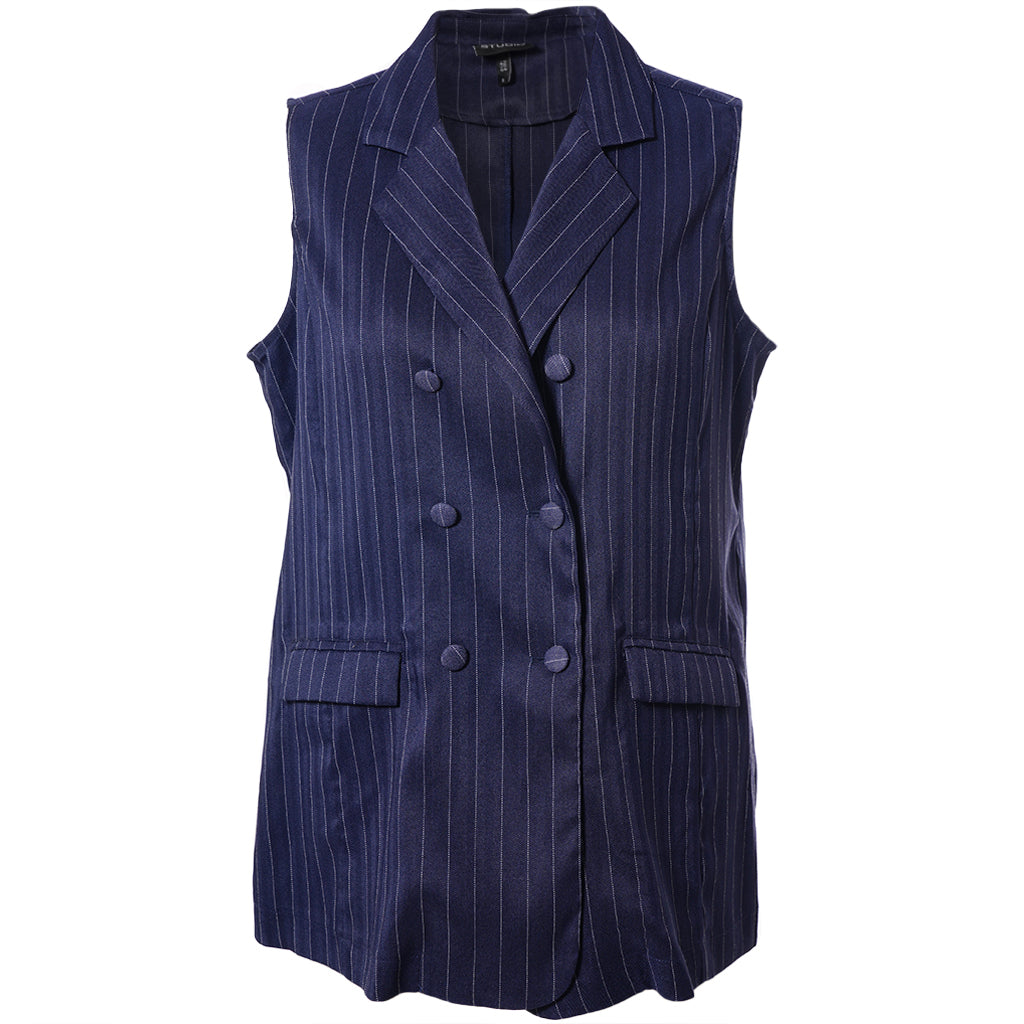 Denne elegante vest fra Studio tilføjer et sofistikeret touch til enhver garderobe med sit tidløse, nålestribede design. Vesten er skabt med en skræddersyet silhuet, der fremhæver en stilfuld pasform, og de dobbeltradet knapper på fronten understreger det eksklusive habit-look, som er perfekt til både hverdag og festlige anledninger.