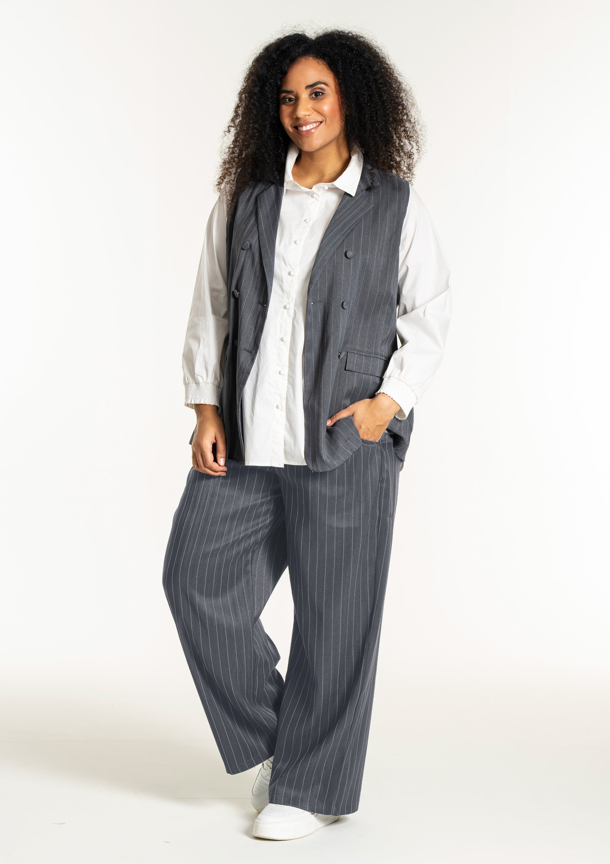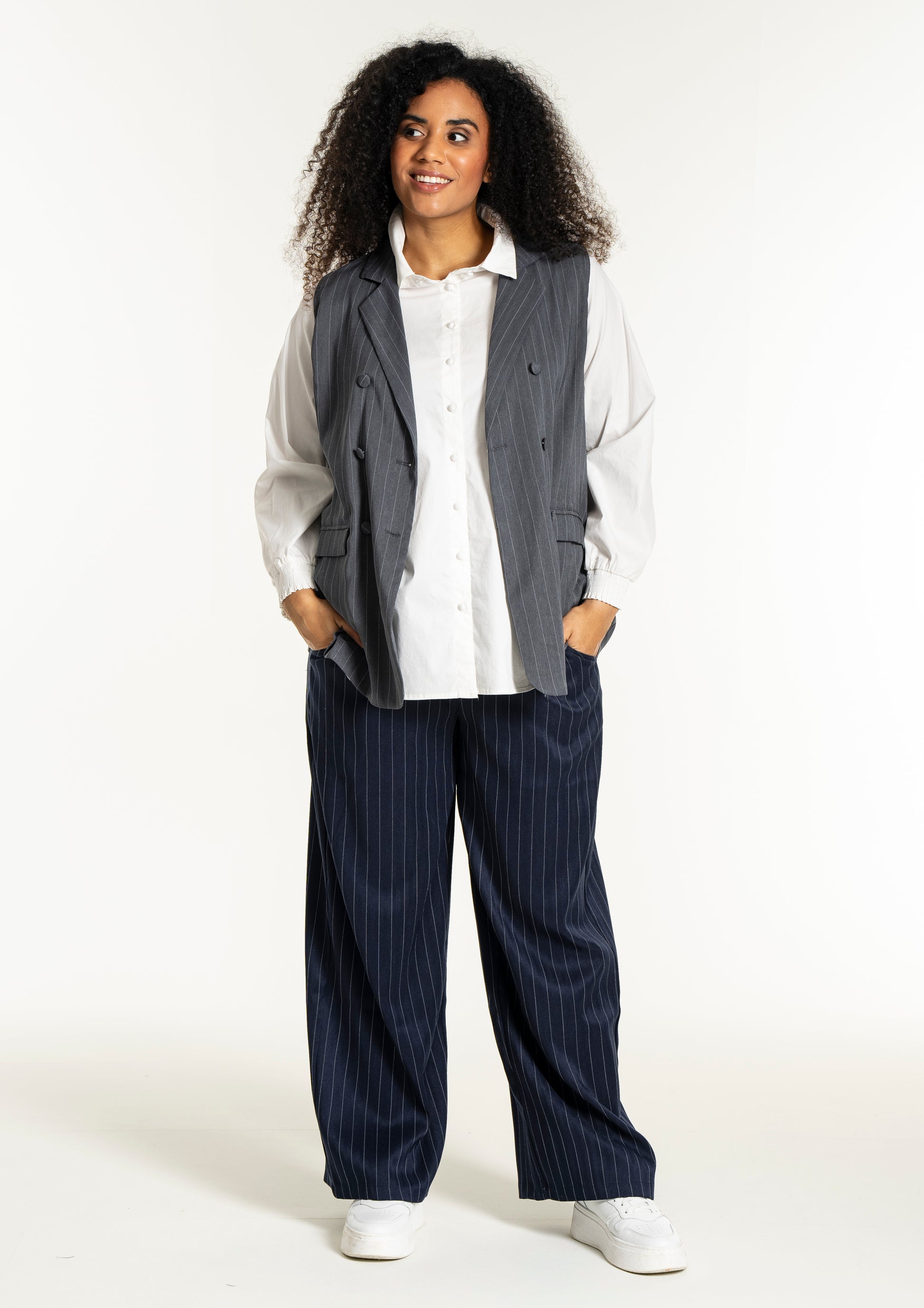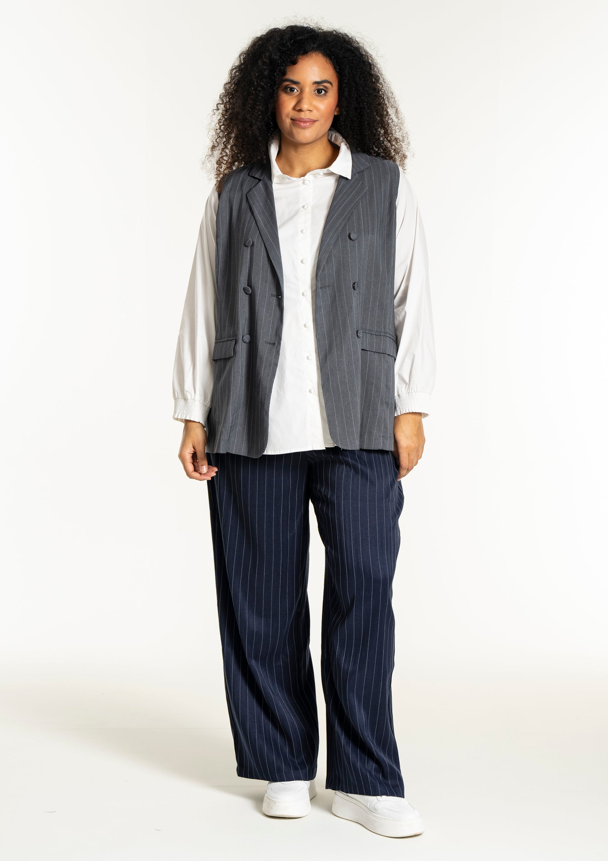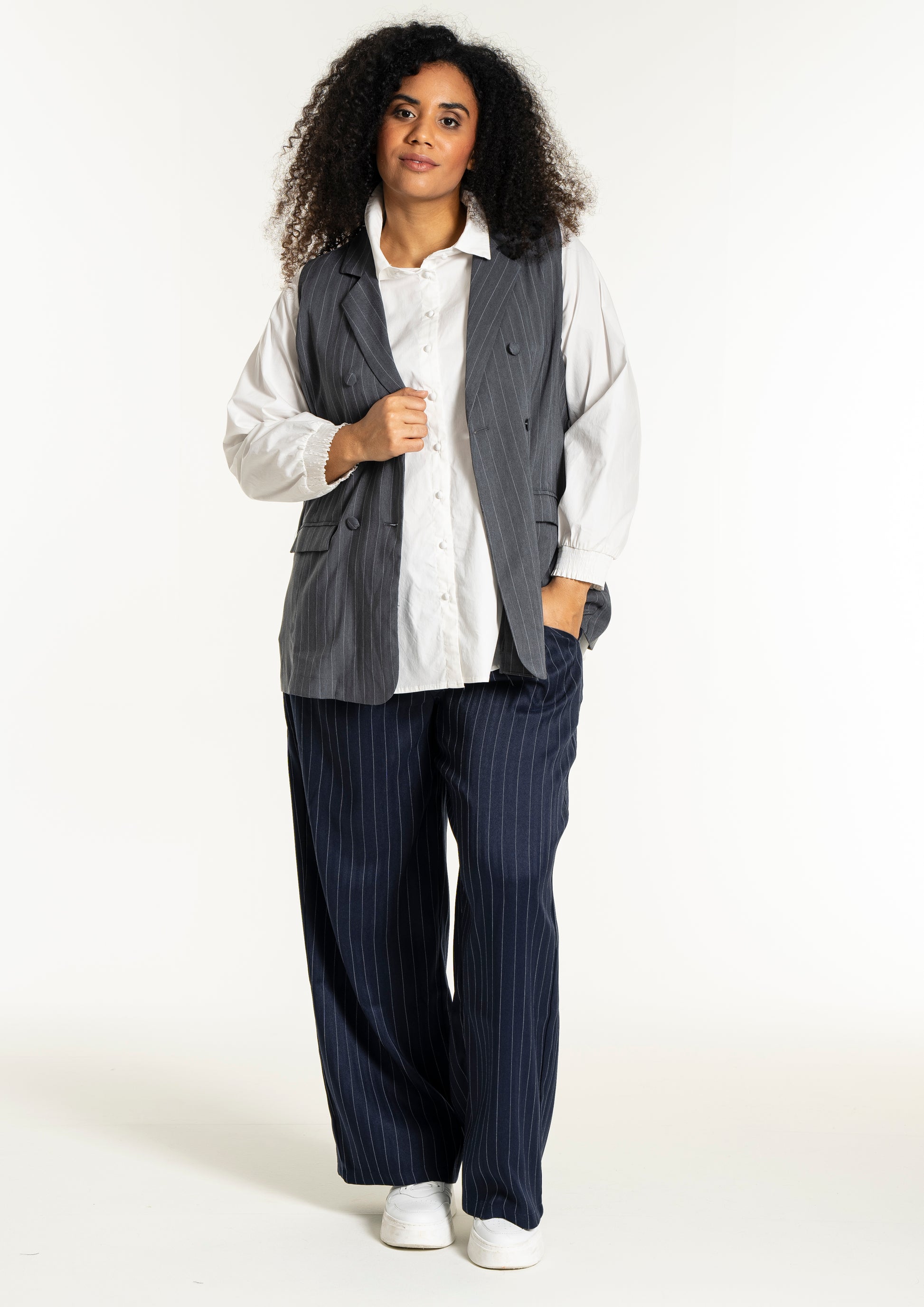 Modellen har et flatterende snit med en længde, der falder pænt ned over hofterne, hvilket ses på billedet hvor den bæres åbent over en hvid overdel for et afslappet udtryk. Du kan style denne vest i plus size med en enkel skjorte for et formelt kontorlook, eller kombinere den med et par smarte bukser til kvinder for at skabe et fuldendt sæt. De dekorative klapper foran giver et ekstra detaljerigt finish, der bryder de rene linjer på en smagfuld måde og tilføjer struktur til designet.
