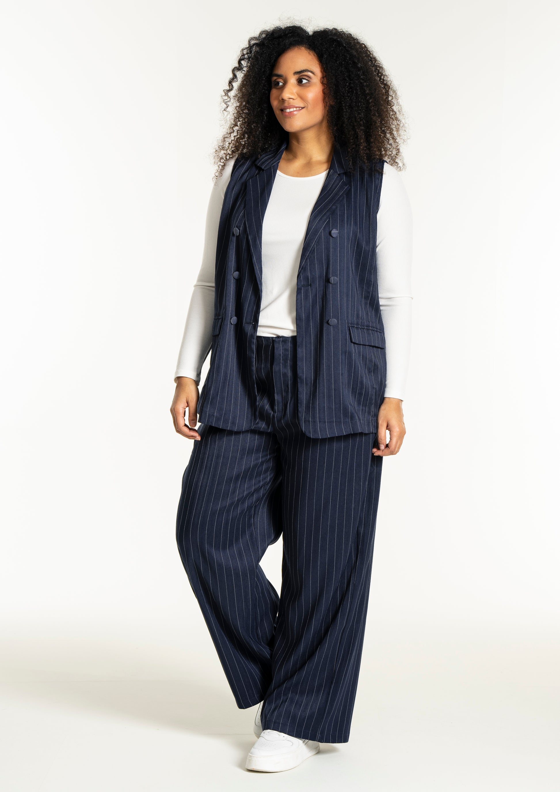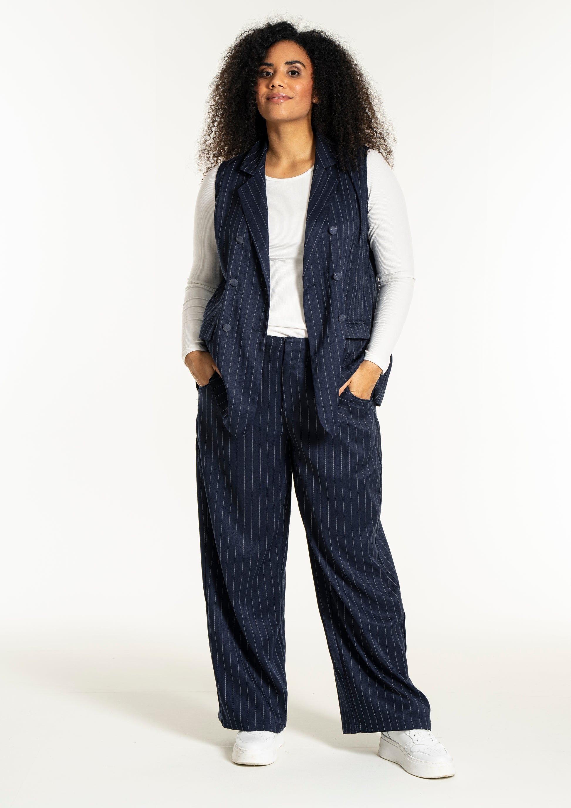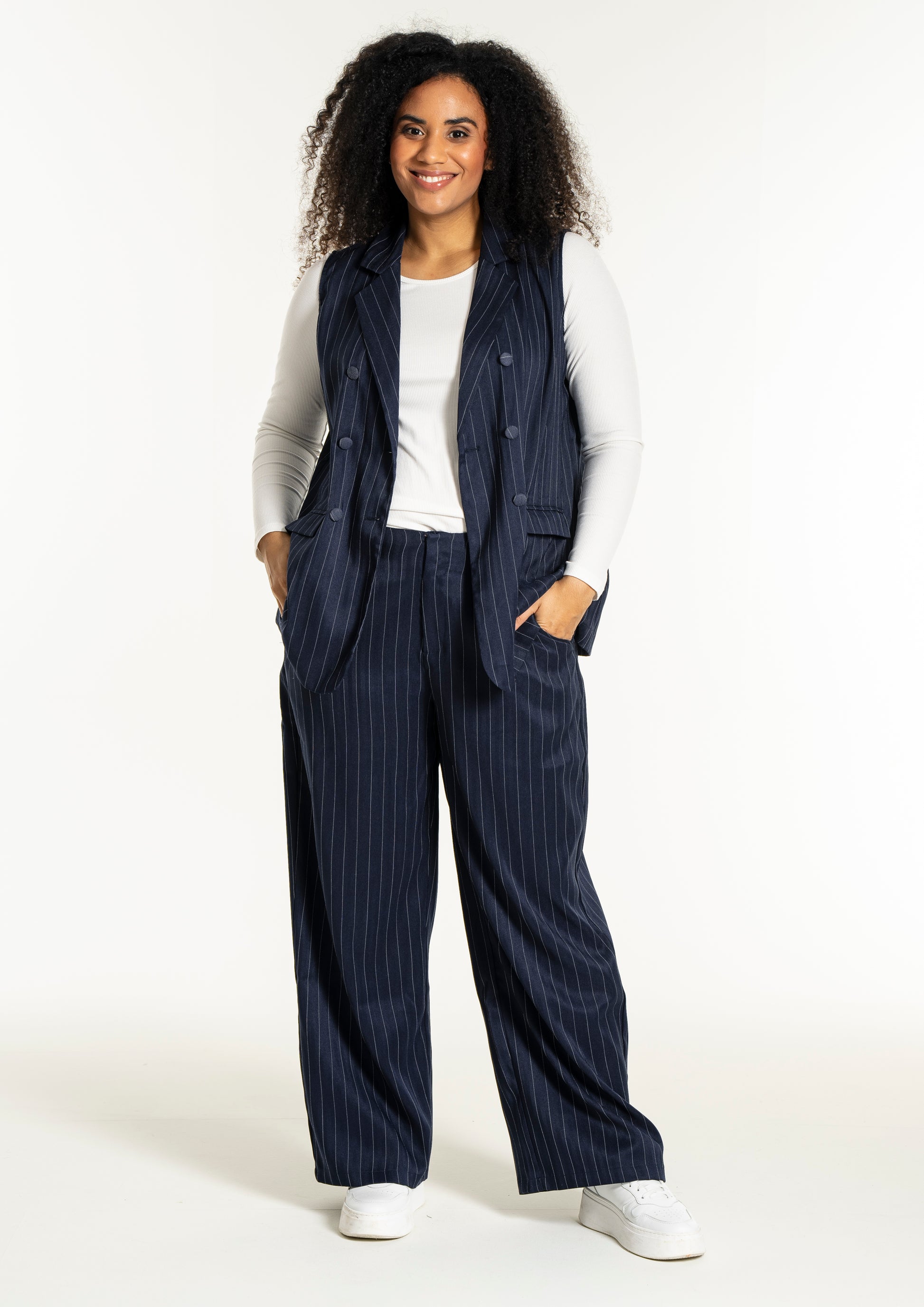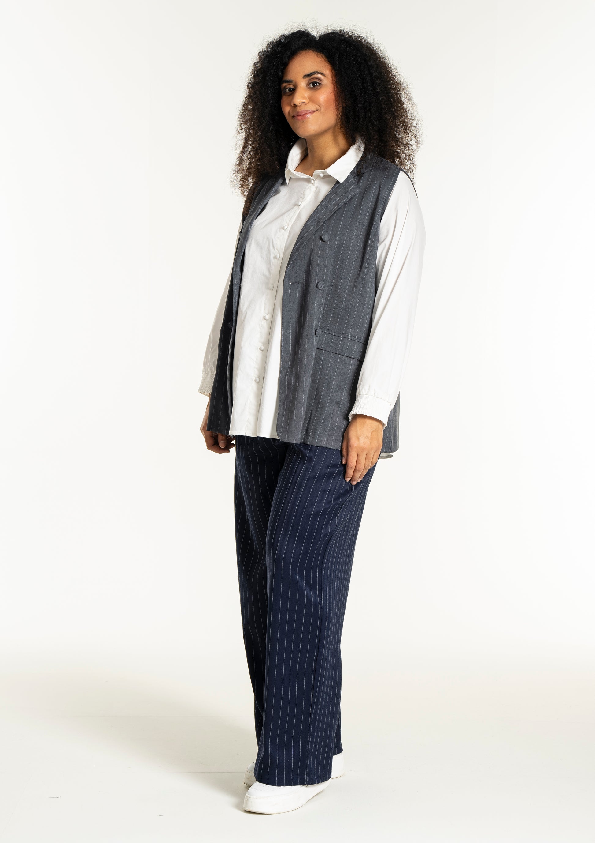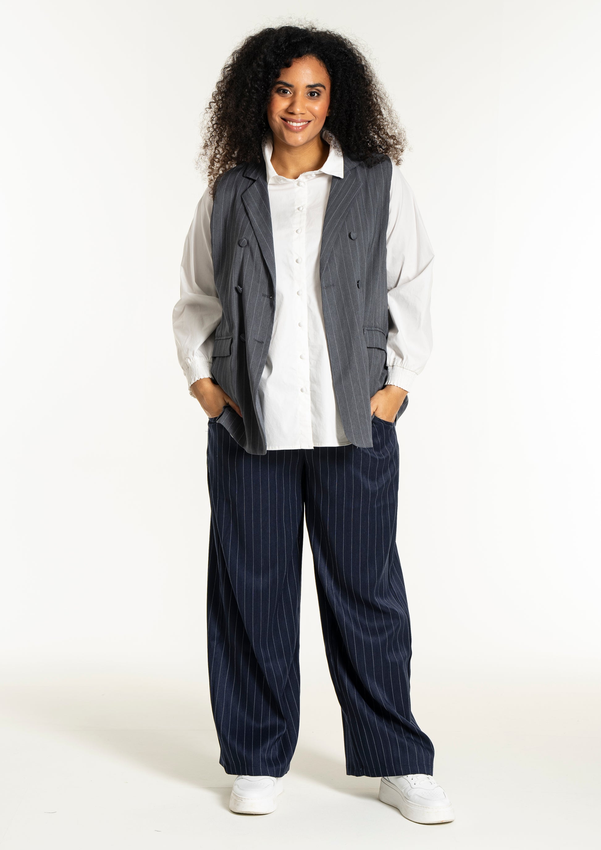 Modellen har et flatterende snit med en længde, der falder pænt ned over hofterne, hvilket ses på billedet hvor den bæres åbent over en hvid overdel for et afslappet udtryk. Du kan style denne vest i plus size med en enkel skjorte for et formelt kontorlook, eller kombinere den med et par smarte bukser til kvinder for at skabe et fuldendt sæt. De dekorative klapper foran giver et ekstra detaljerigt finish, der bryder de rene linjer på en smagfuld måde og tilføjer struktur til designet.