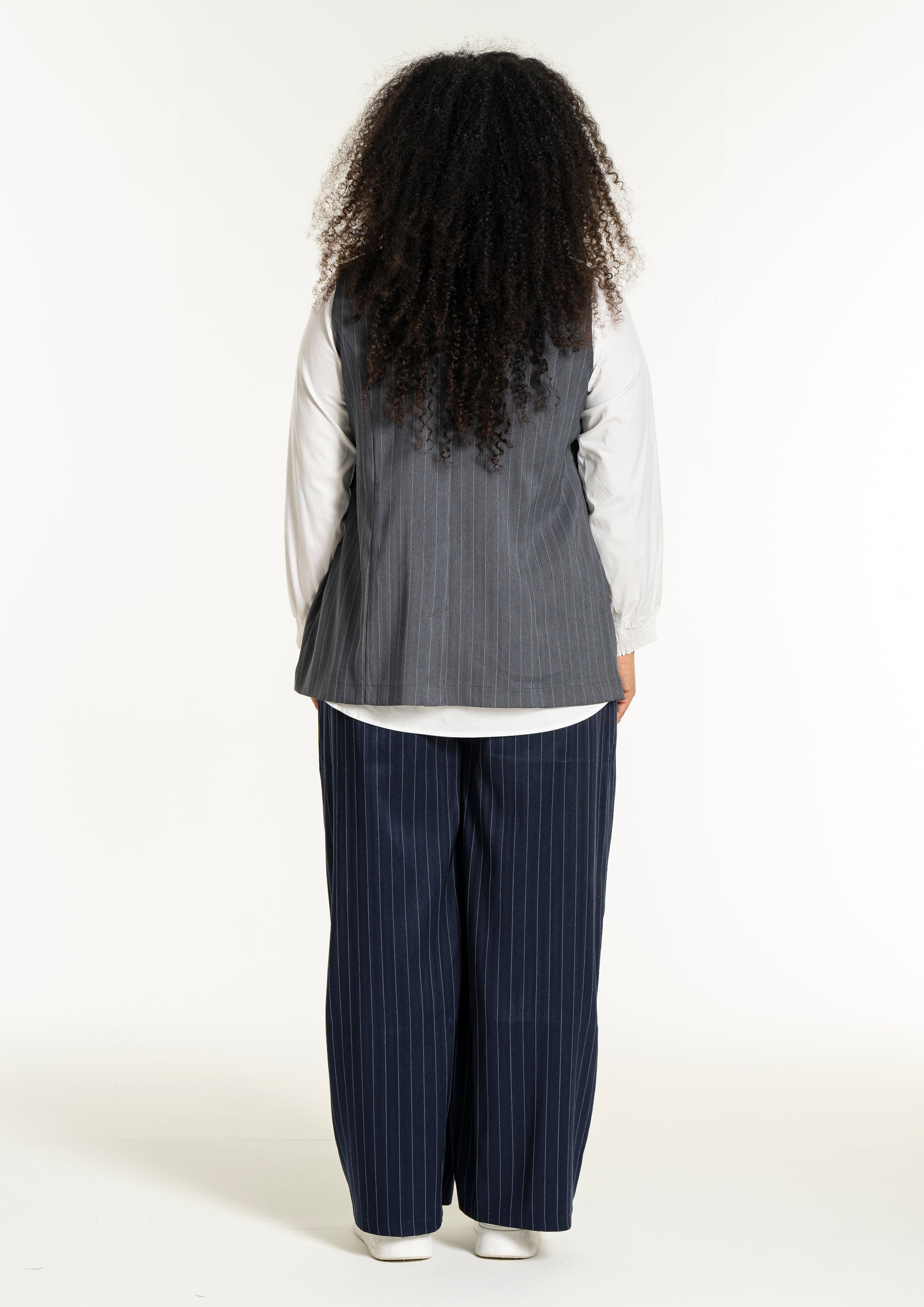 Materialet består af en nøje sammensat blanding, hvor indholdet af viskose og elastan sikrer både blødhed og en smule stræk for optimal bevægelighed gennem dagen. Den klassiske grå nuance med fine hvide striber gør den utrolig alsidig og nem at sammensætte med resten af din garderobe, uanset om du ønsker et skarpt business-look eller et moderne lag-på-lag outfit.