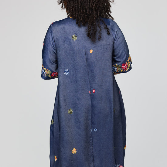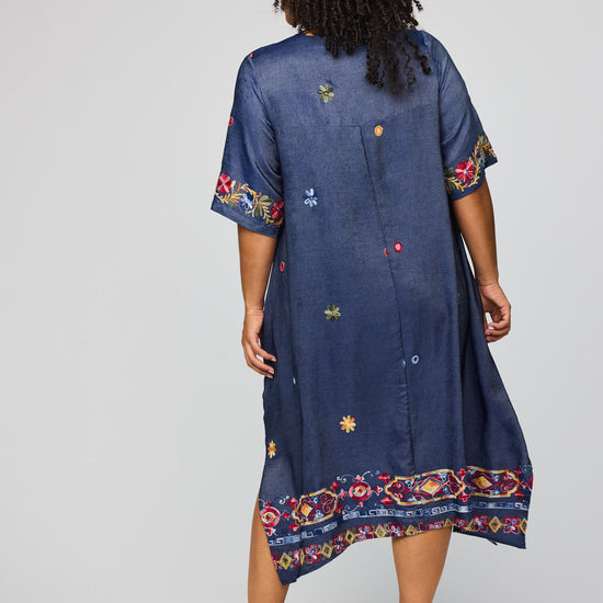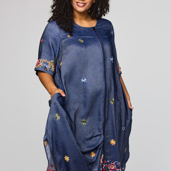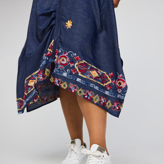 Denne SNoella Dress fra Studio byder på et skønt bohemeinspireret udtryk med sin flotte blå denimfarve og farverige detaljer. Kjolen er udsmykket med et dekorativt print af små blomster og geometriske borter i røde og gule nuancer, der giver liv til designet, mens den gennemgående lynlås foran tilføjer lidt kant.