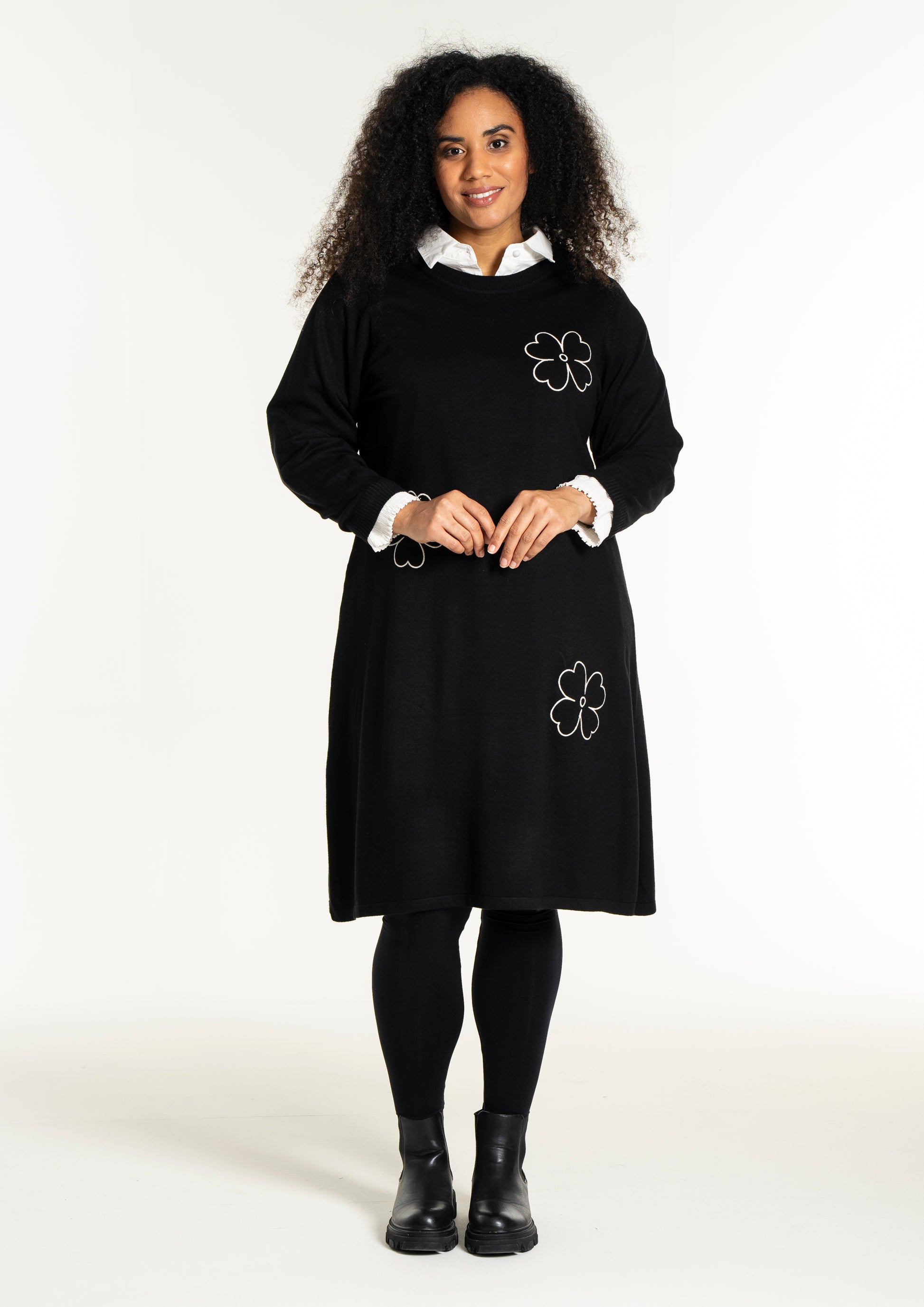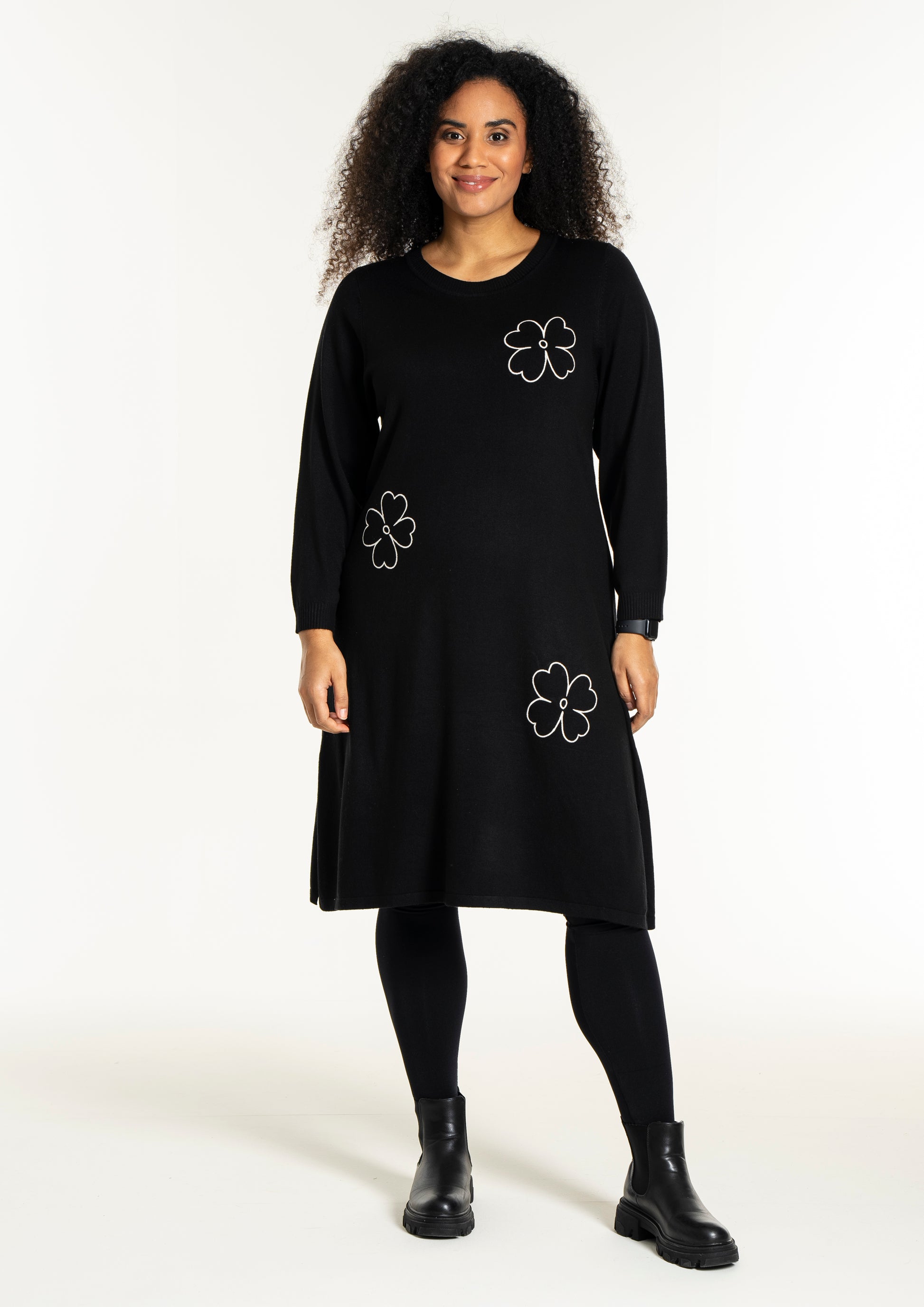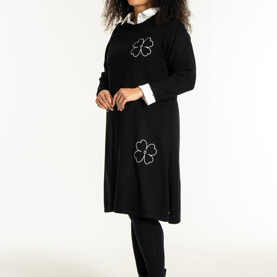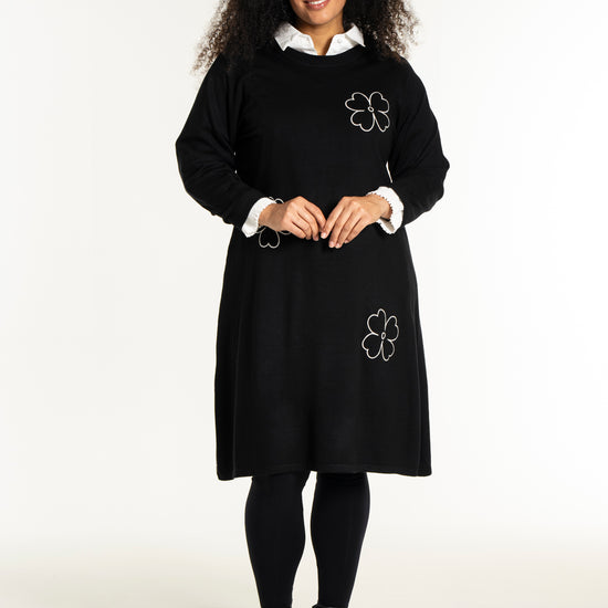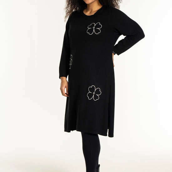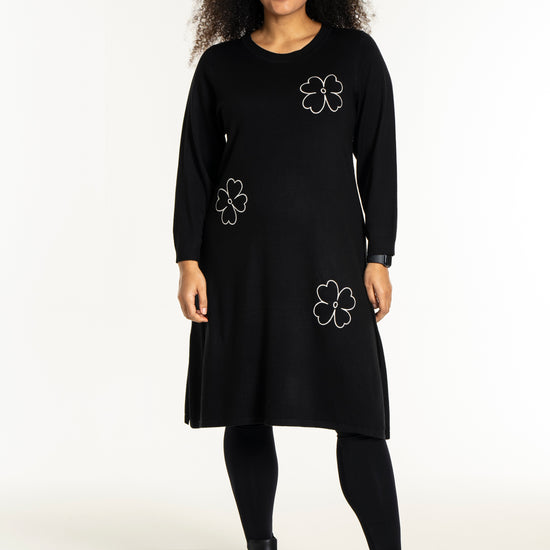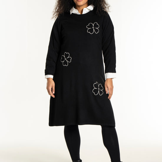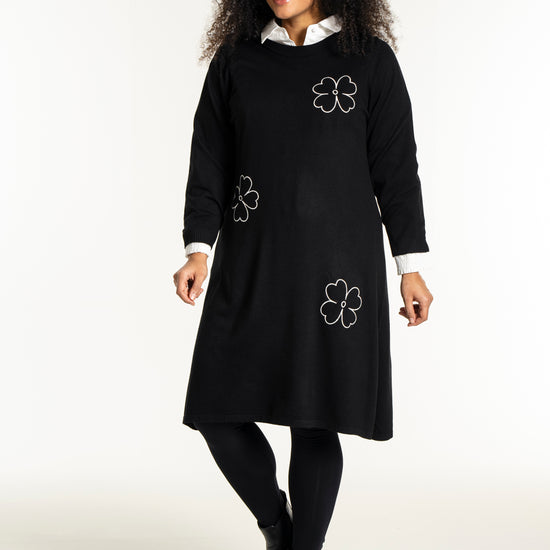 De dekorative blomsterdetaljer på bryst, ærme og nederdel giver kjolen et feminint twist. Style den med strømpebukser eller leggings fra vores plus size leggings eller udforsk flere plus size kjoler for at finde din favorit. En ideel kjole til dig, der ønsker både komfort, kvalitet og et moderne look.