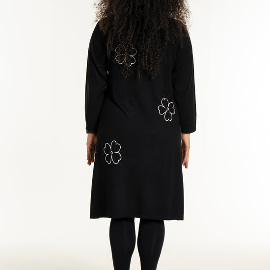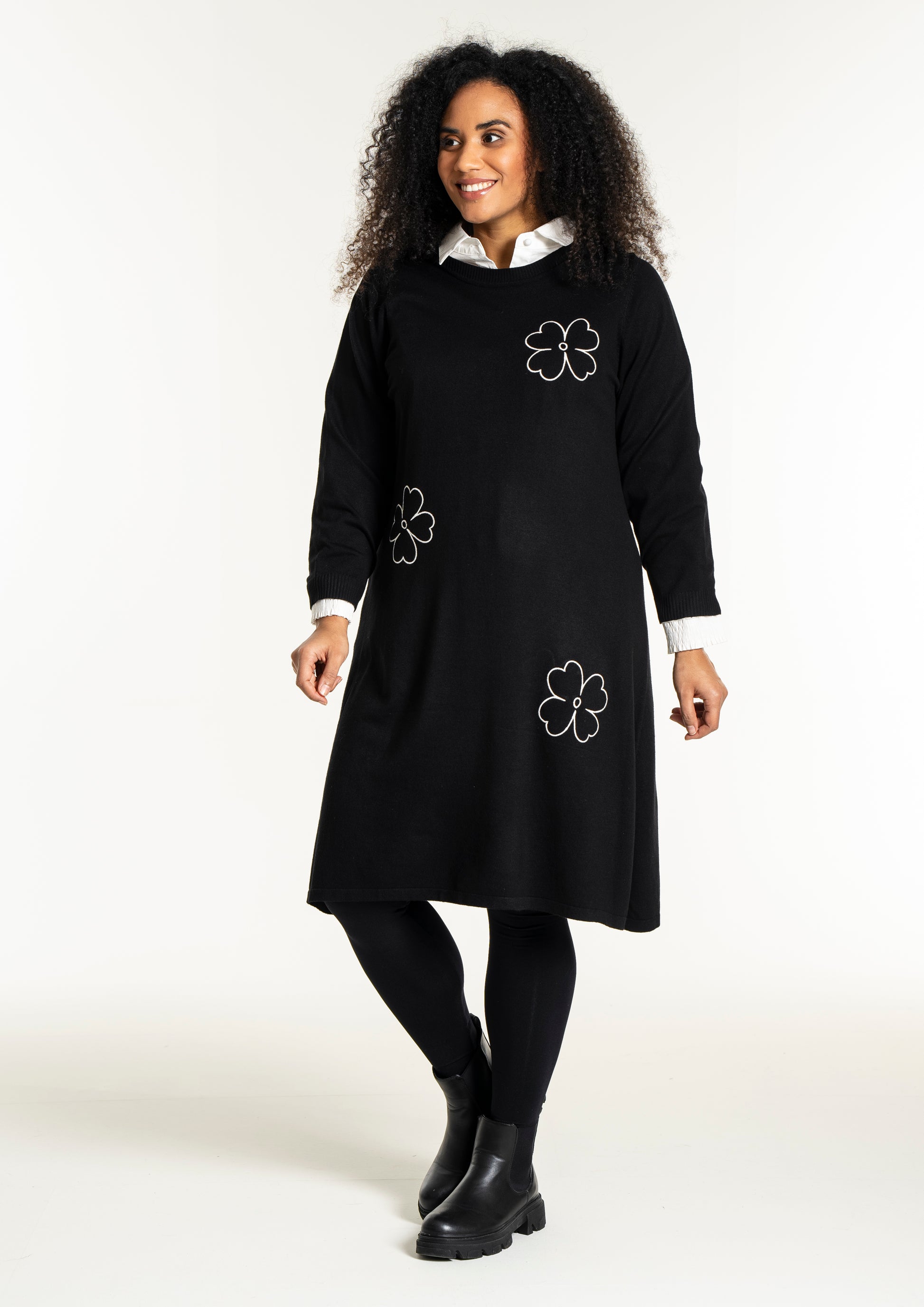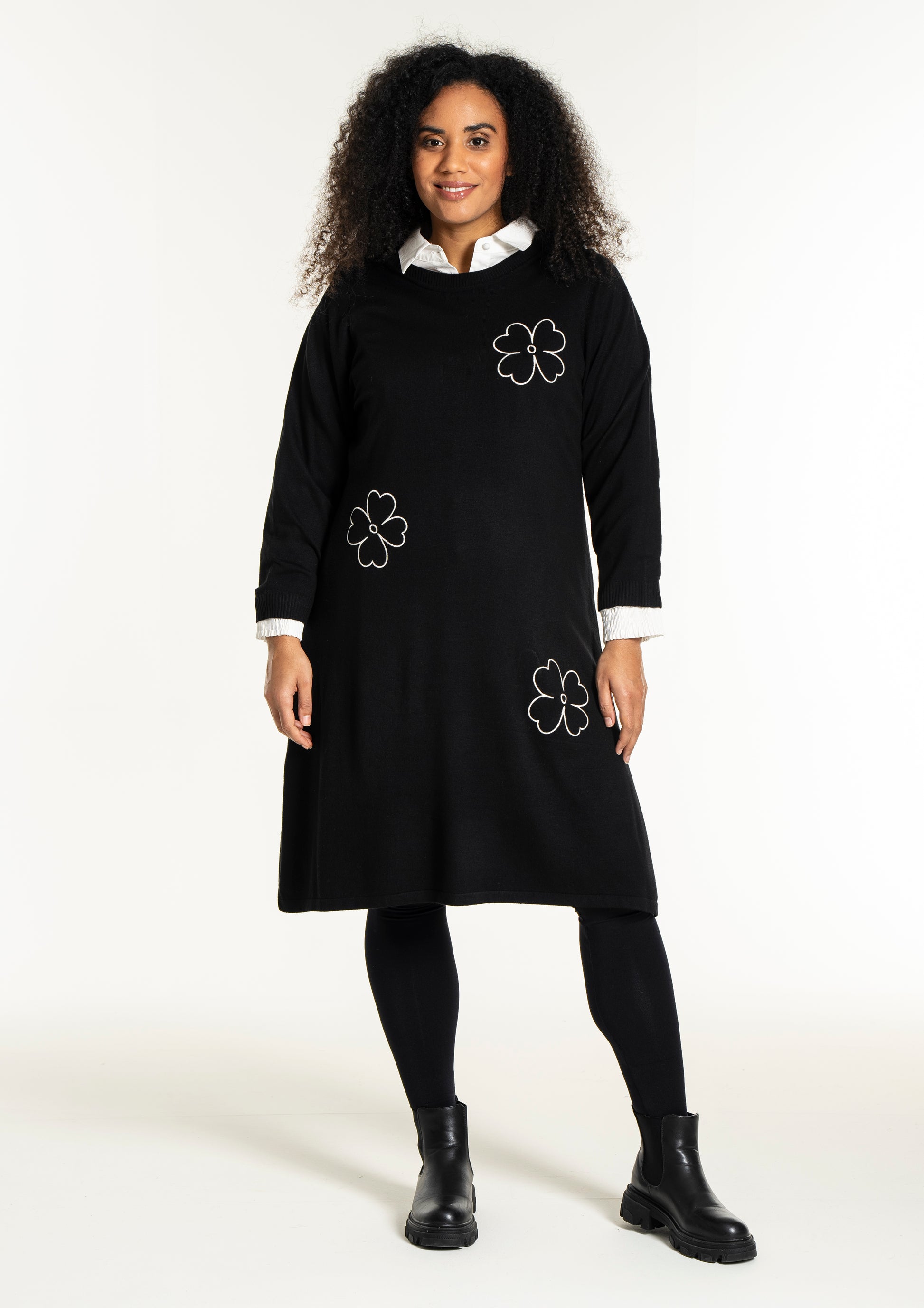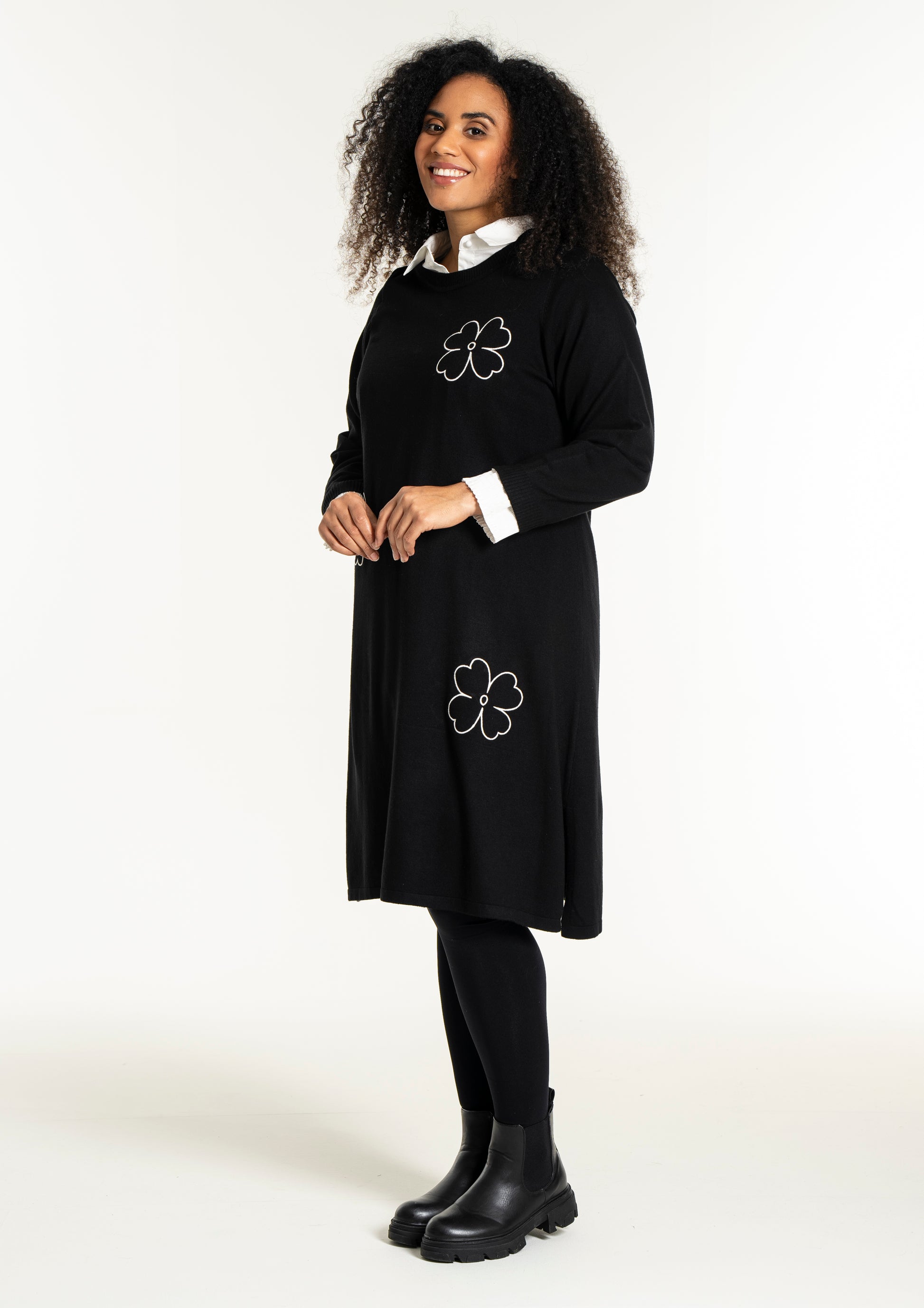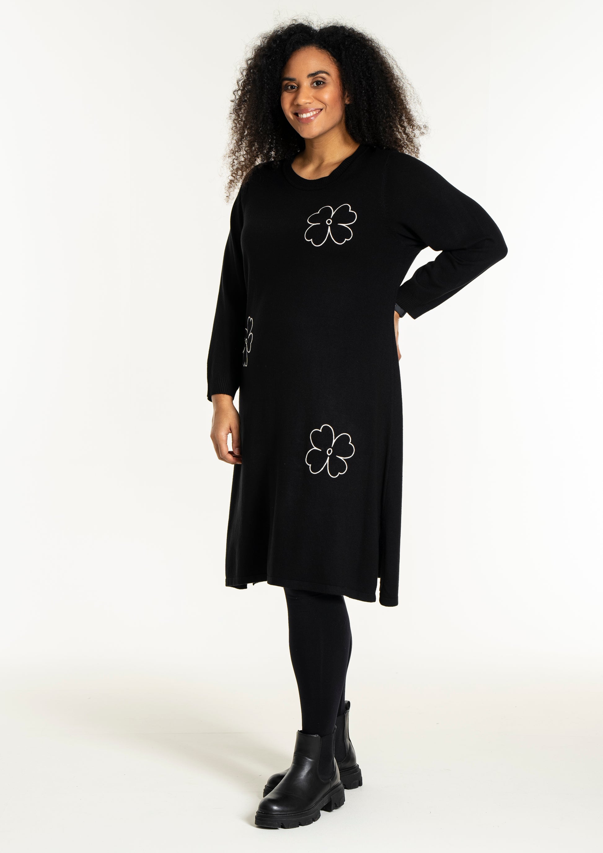 De dekorative blomsterdetaljer på bryst, ærme og nederdel giver kjolen et feminint twist. Style den med strømpebukser eller leggings fra vores plus size leggings eller udforsk flere plus size kjoler for at finde din favorit. En ideel kjole til dig, der ønsker både komfort, kvalitet og et moderne look.