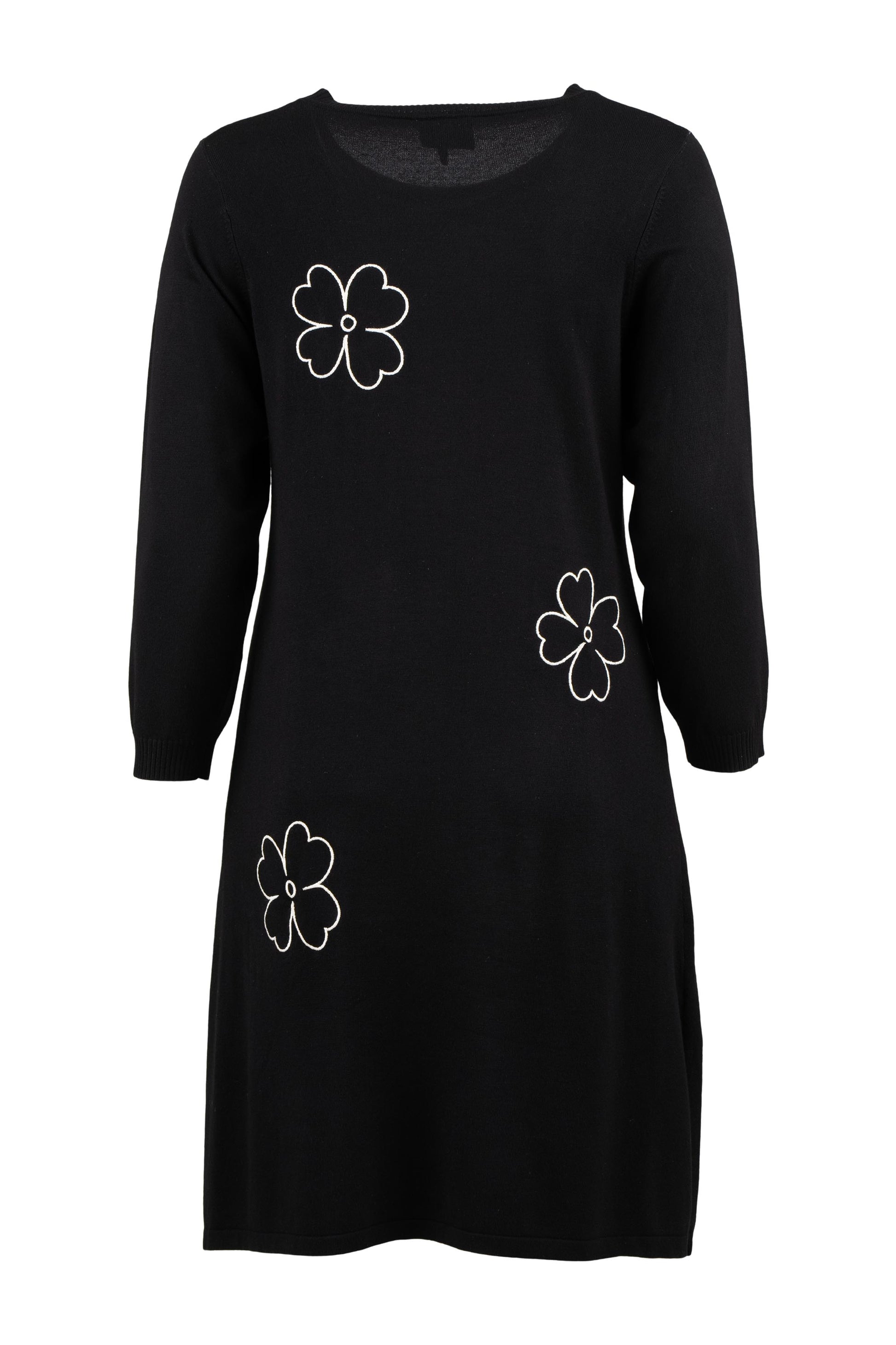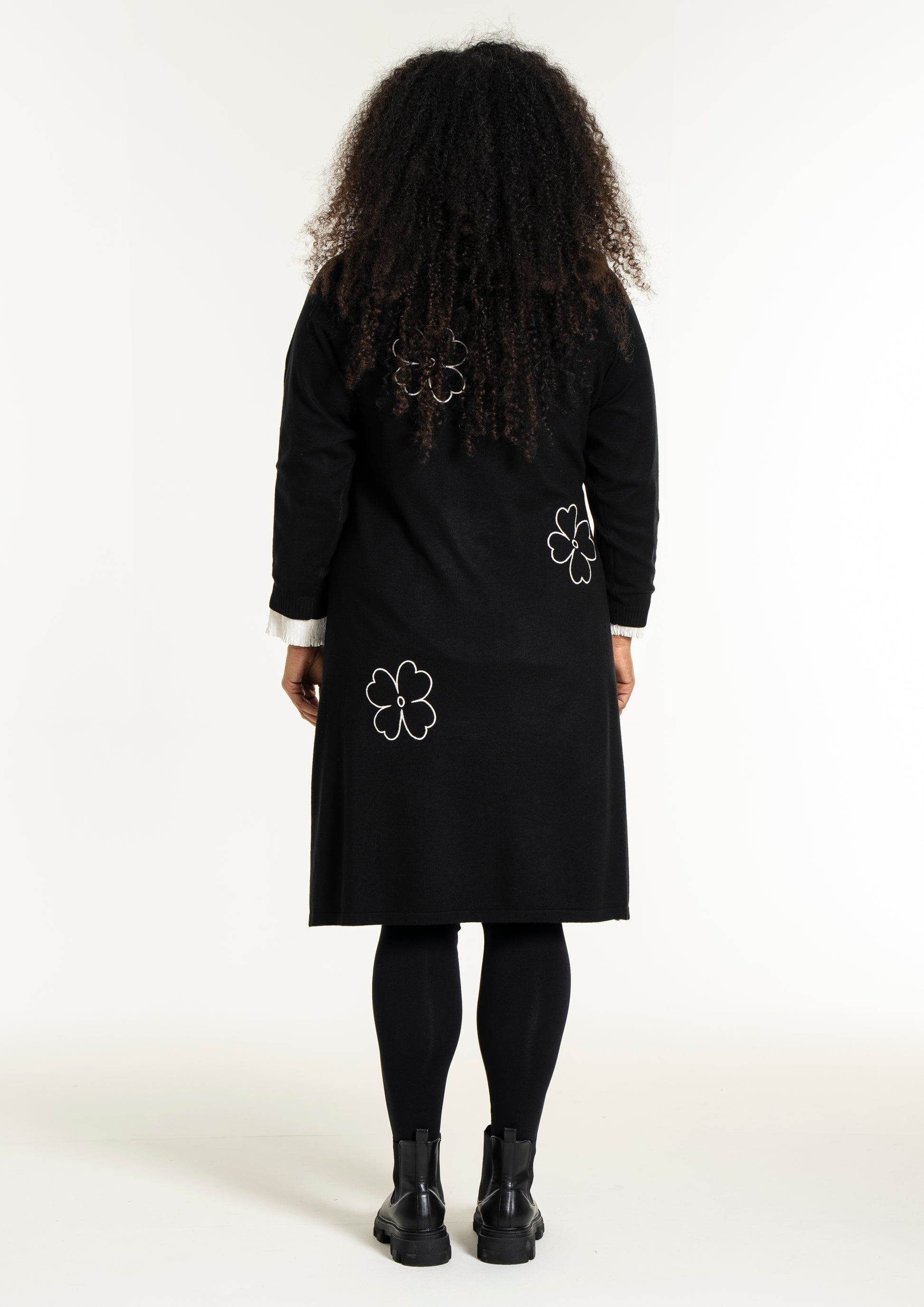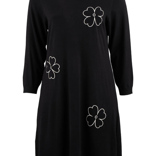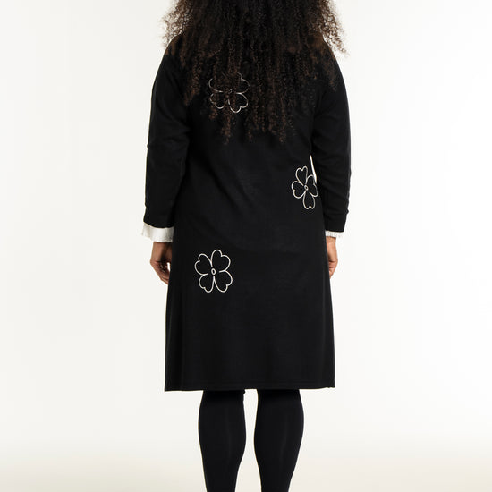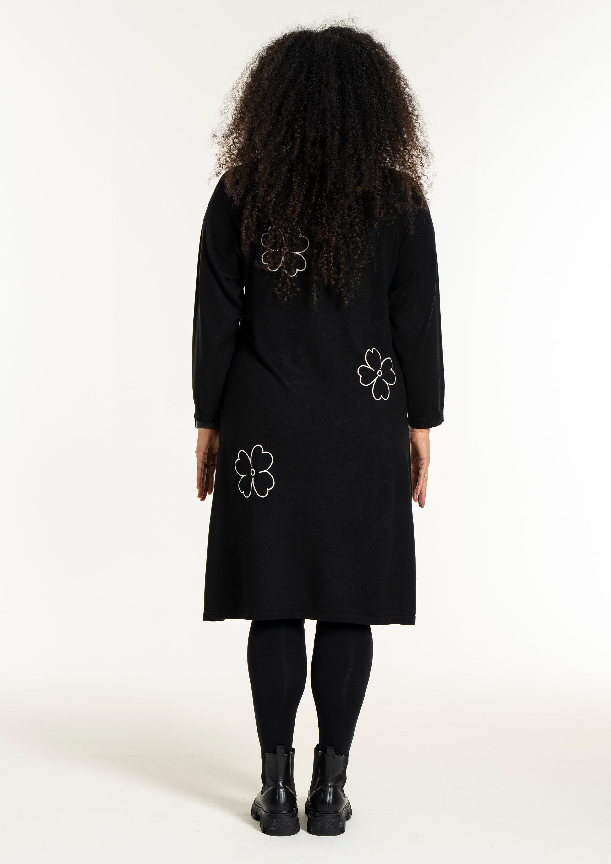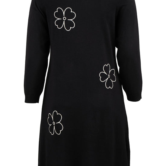 De dekorative blomsterdetaljer på bryst, ærme og nederdel giver kjolen et feminint twist. Style den med strømpebukser eller leggings fra vores plus size leggings eller udforsk flere plus size kjoler for at finde din favorit. En ideel kjole til dig, der ønsker både komfort, kvalitet og et moderne look.