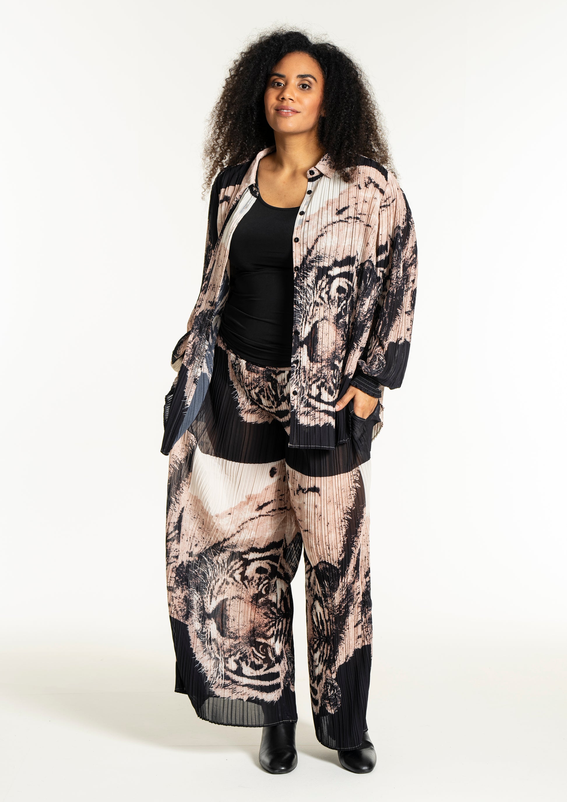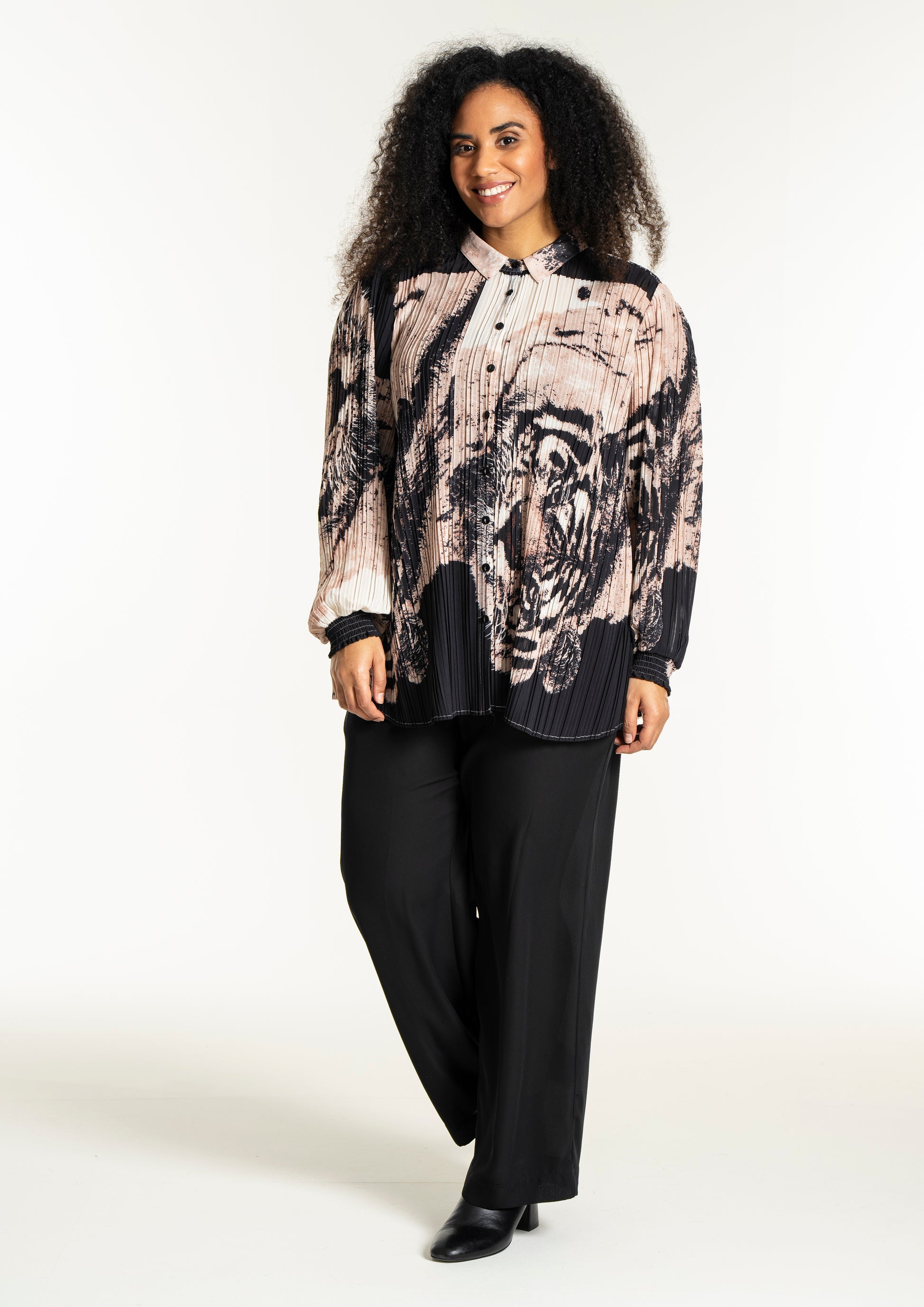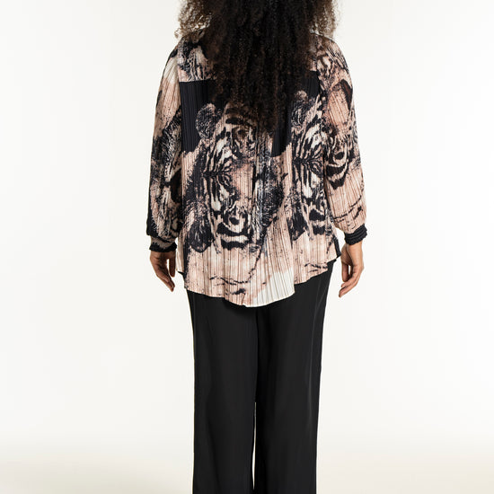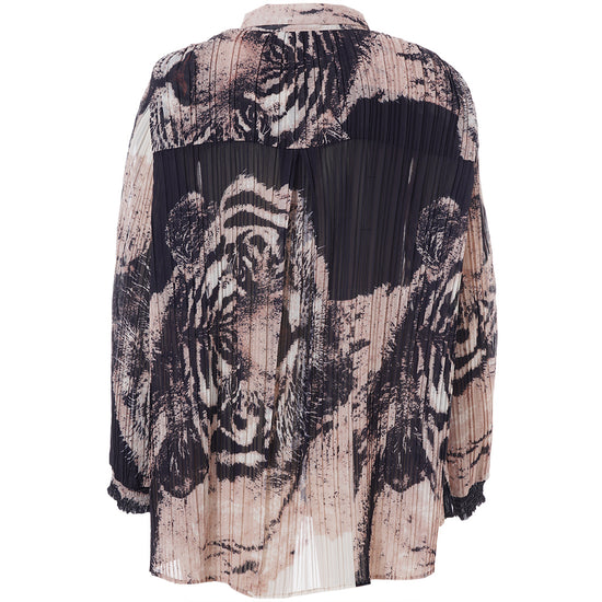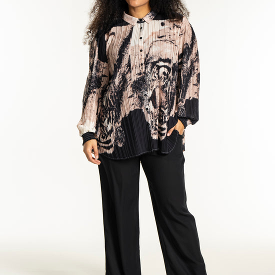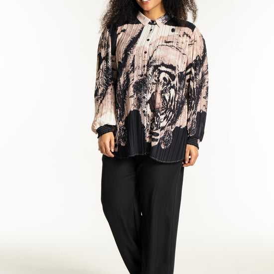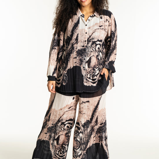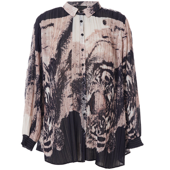 Oplev en skjorte, der kombinerer kunstnerisk flair med komfort og stil. Denne smukke, plisserede skjorte fra Studio er designet i et iøjnefaldende print med tigeransigter i en kunstnerisk collageeffekt. Farverne i sort, beige og off-white skaber en elegant kontrast, der gør skjorten til et statement-piece i enhver garderobe.