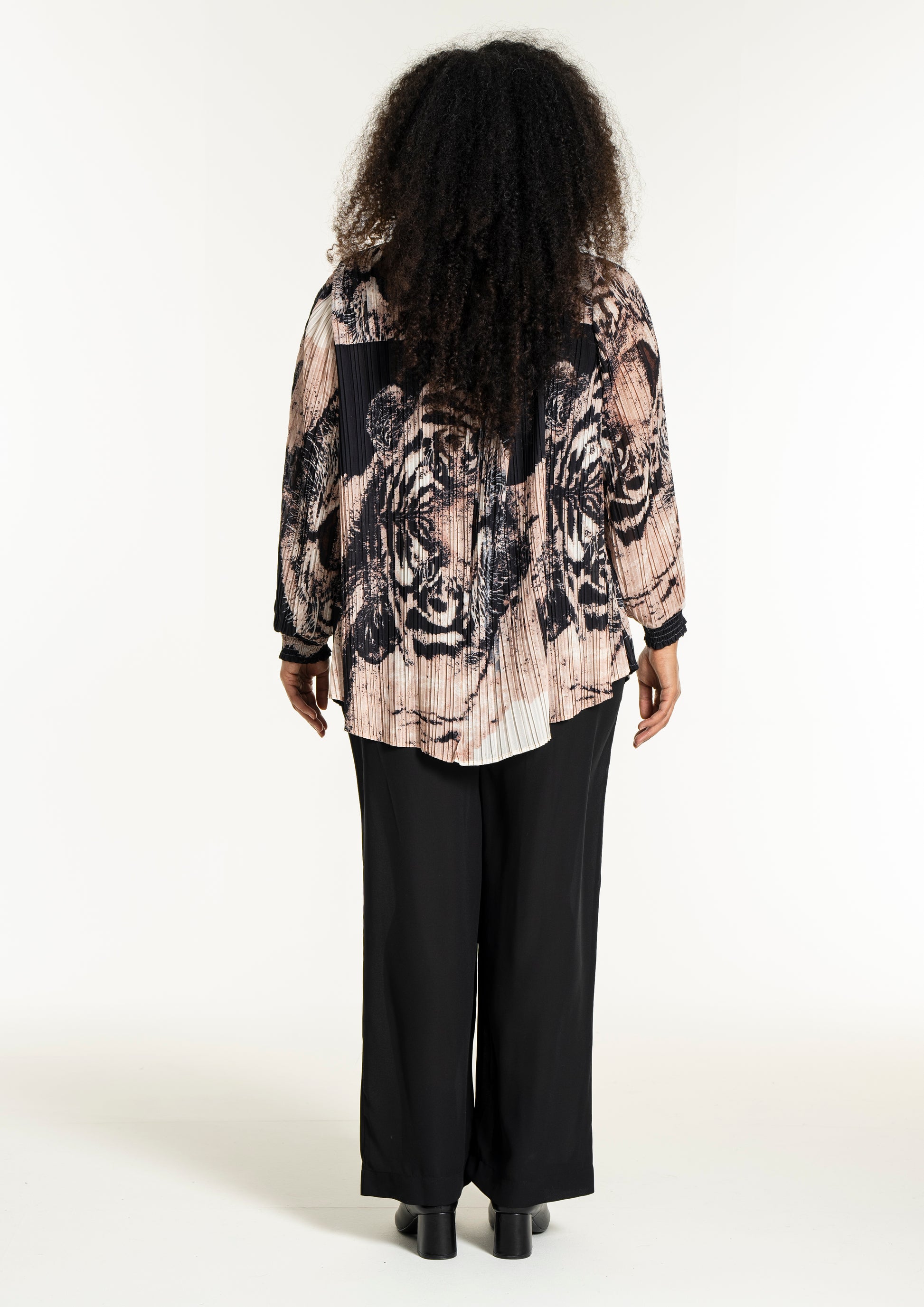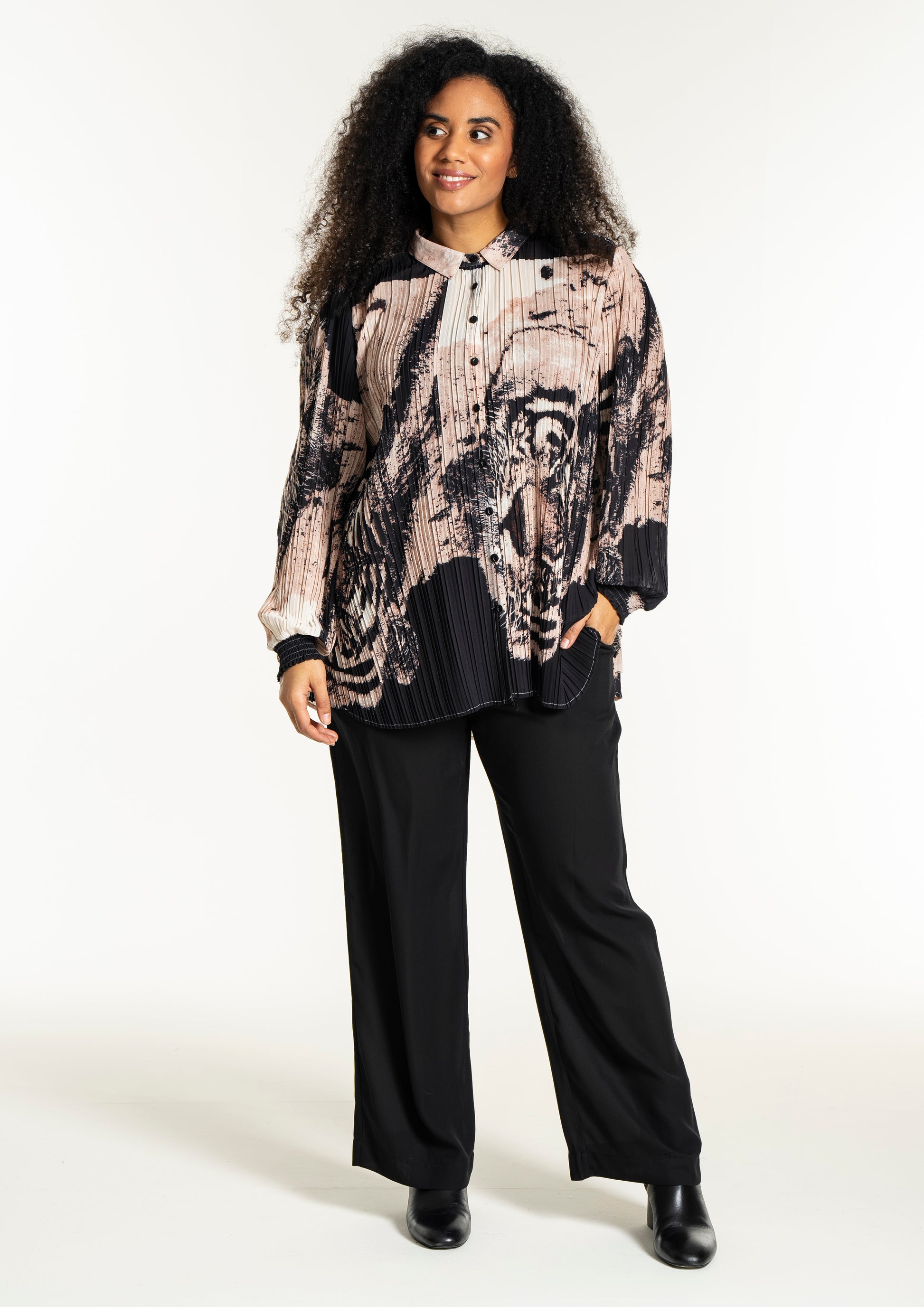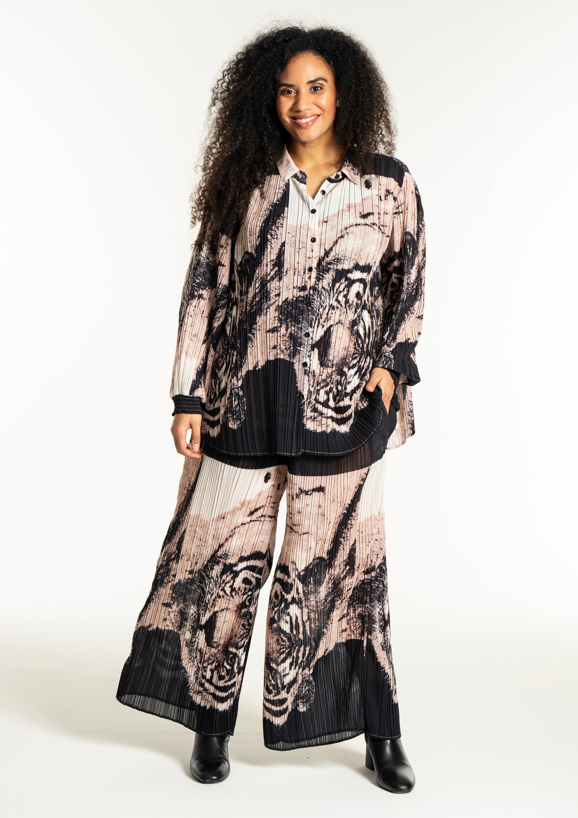 Oplev en skjorte, der kombinerer kunstnerisk flair med komfort og stil. Denne smukke, plisserede skjorte fra Studio er designet i et iøjnefaldende print med tigeransigter i en kunstnerisk collageeffekt. Farverne i sort, beige og off-white skaber en elegant kontrast, der gør skjorten til et statement-piece i enhver garderobe.