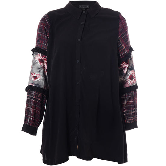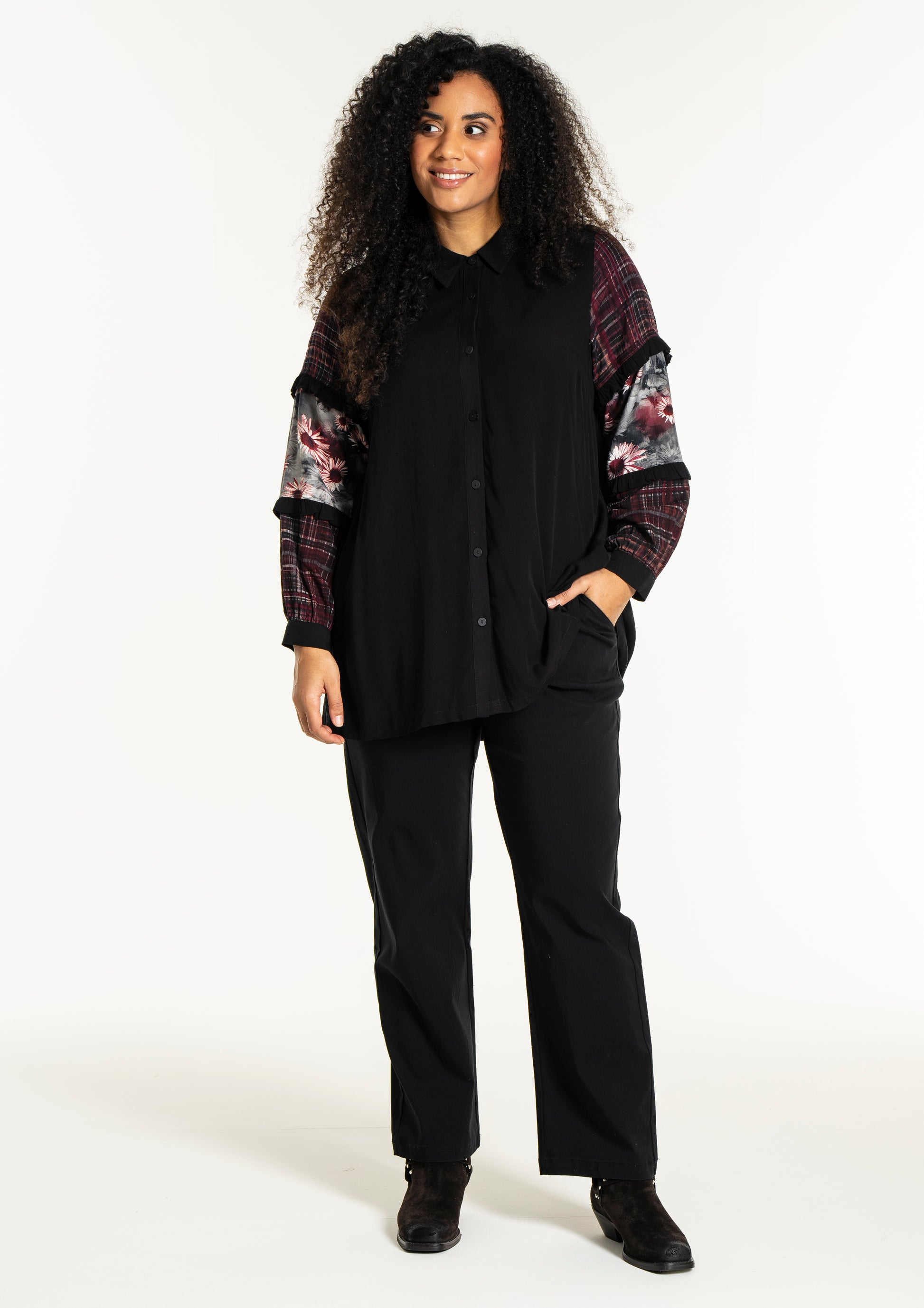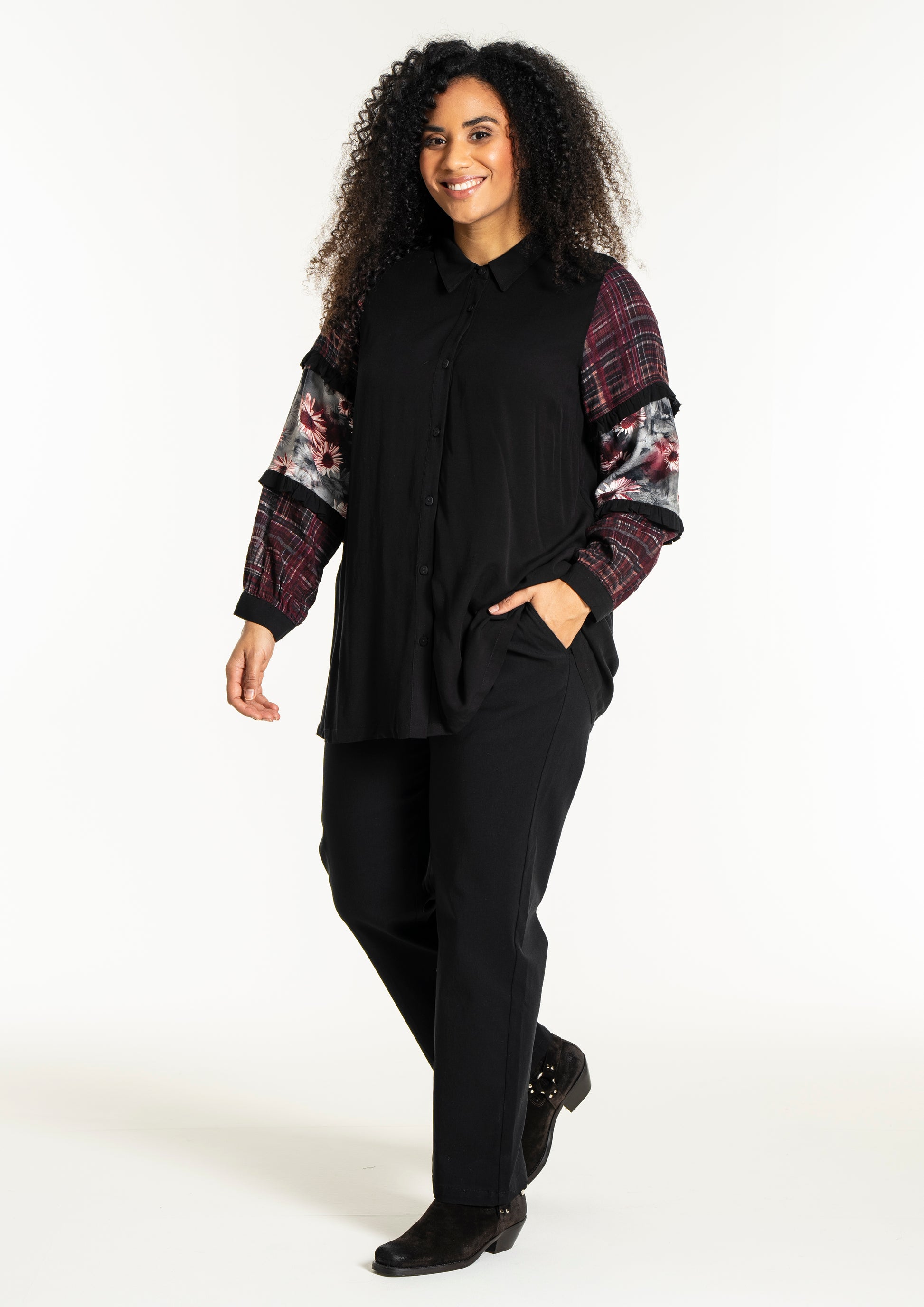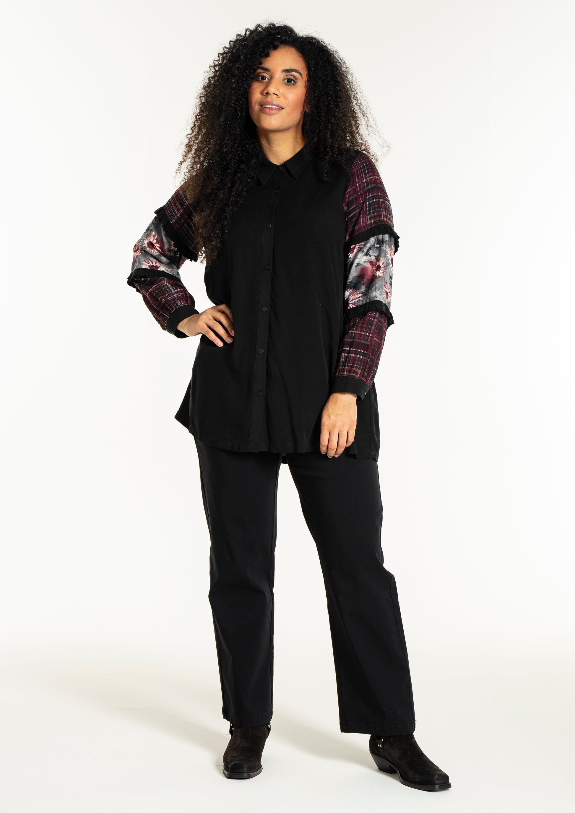Tilføj et unikt præg til din garderobe med denne smukke skjorte fra Studio. Lavet af 100% viskose i kroppen, mens ærmerne kombinerer 70% bomuld og 30% viskose for en patchwork-effekt. Skjorten har en klassisk krave og en frontknaplukning, der giver et tidløst look. De lange ærmer har manchetter og små flæsedetaljer, som tilføjer et feminint touch med kant.
