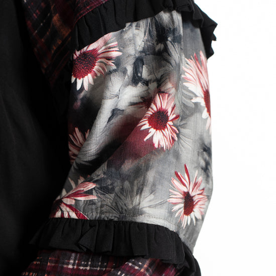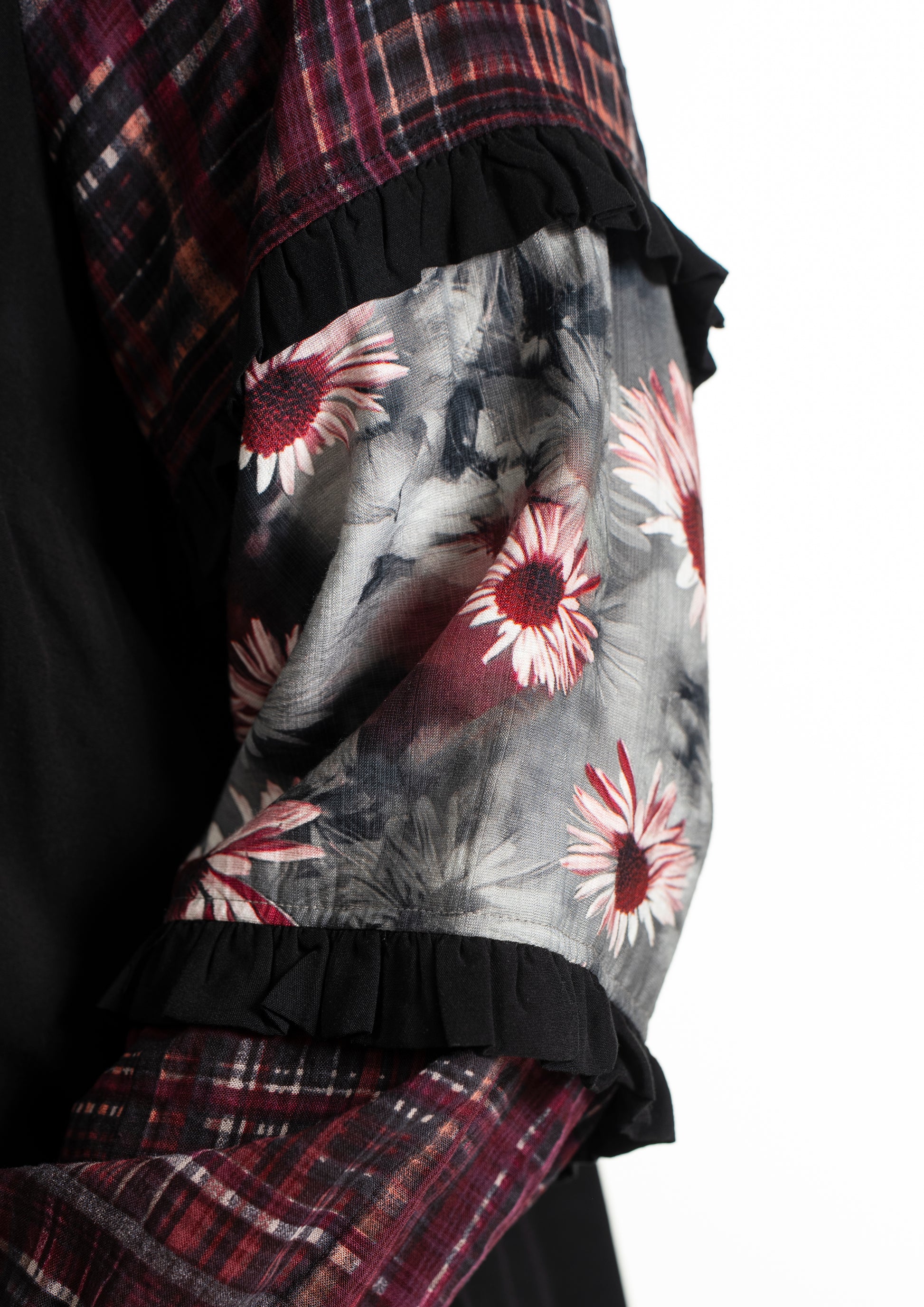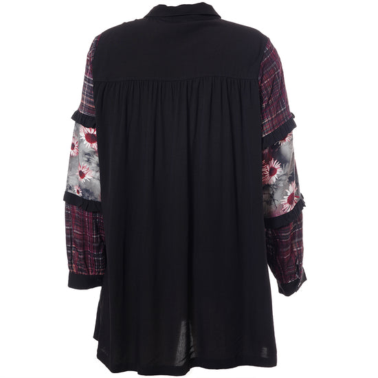 Fås i størrelserne S, M, L og XL, hvor størrelse S har en halv brystvidde på 61 cm og en længde på 78 cm. Skjorten er i en flot multifarvet kombination af rød og sort, hvilket gør den til et alsidigt valg til både hverdag og festlige lejligheder.