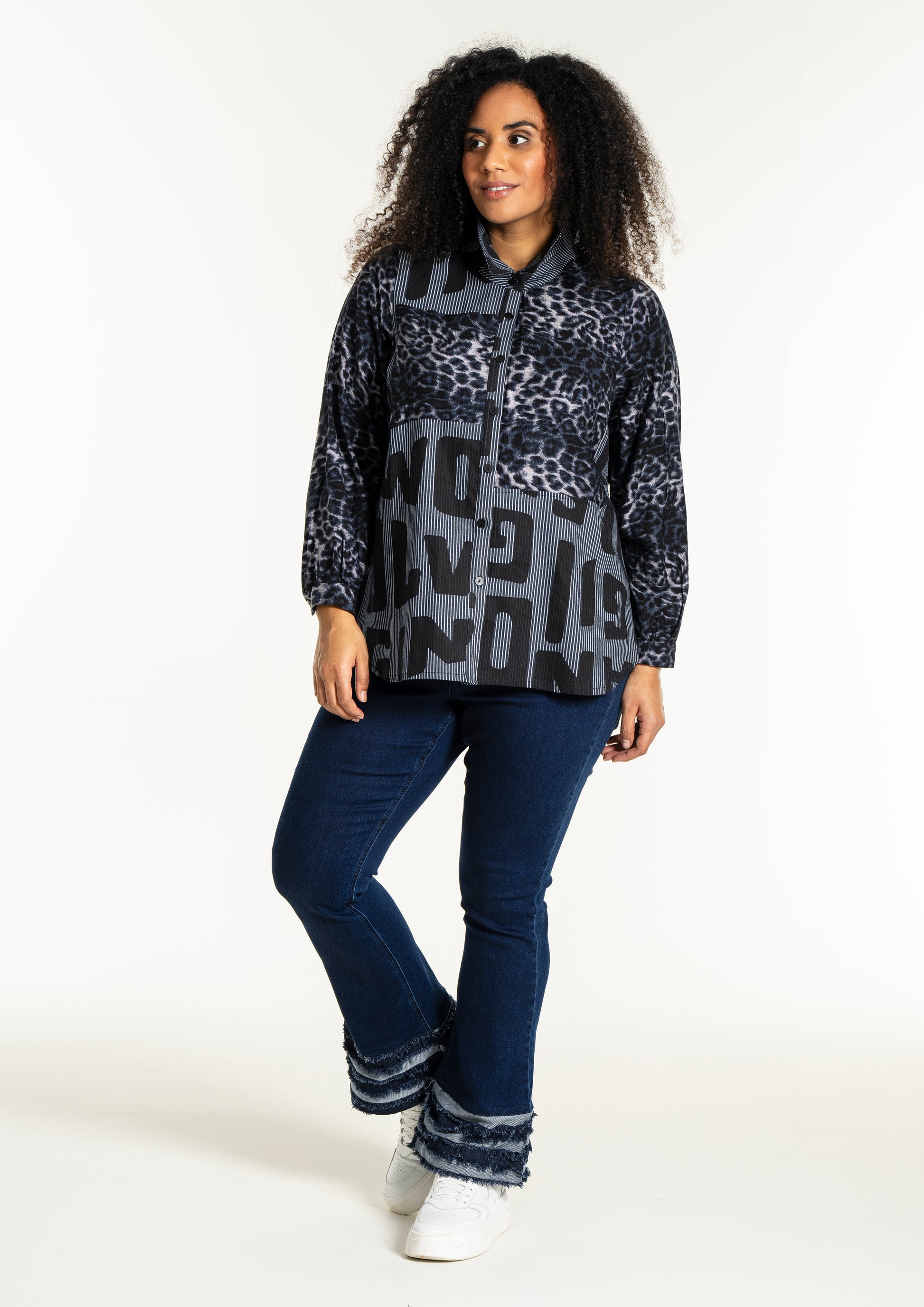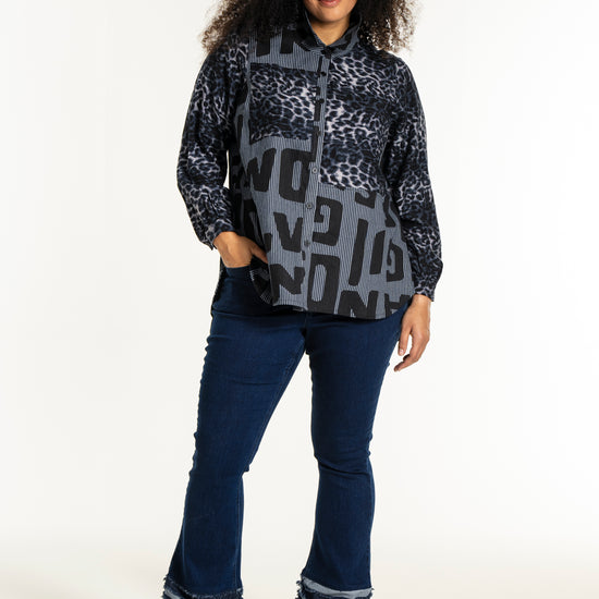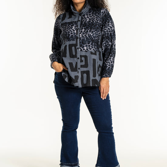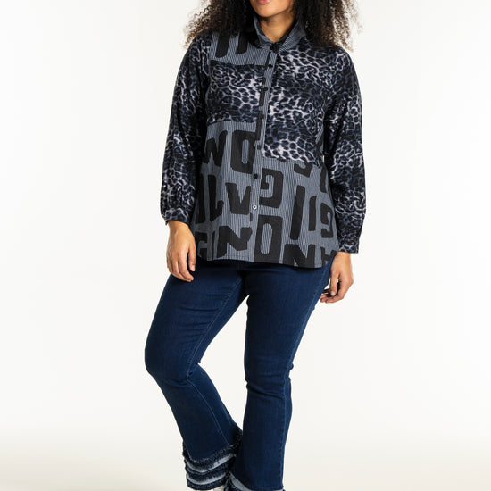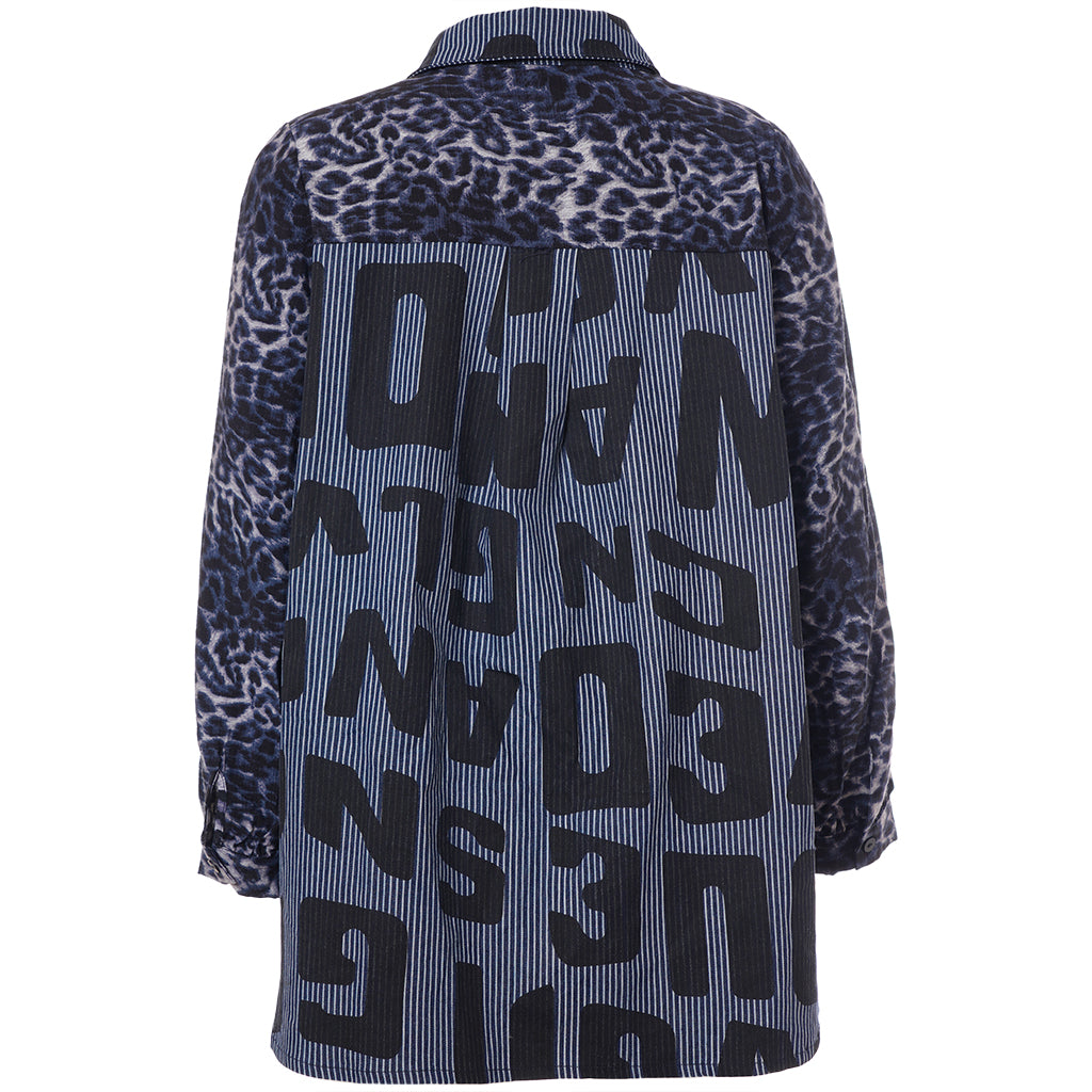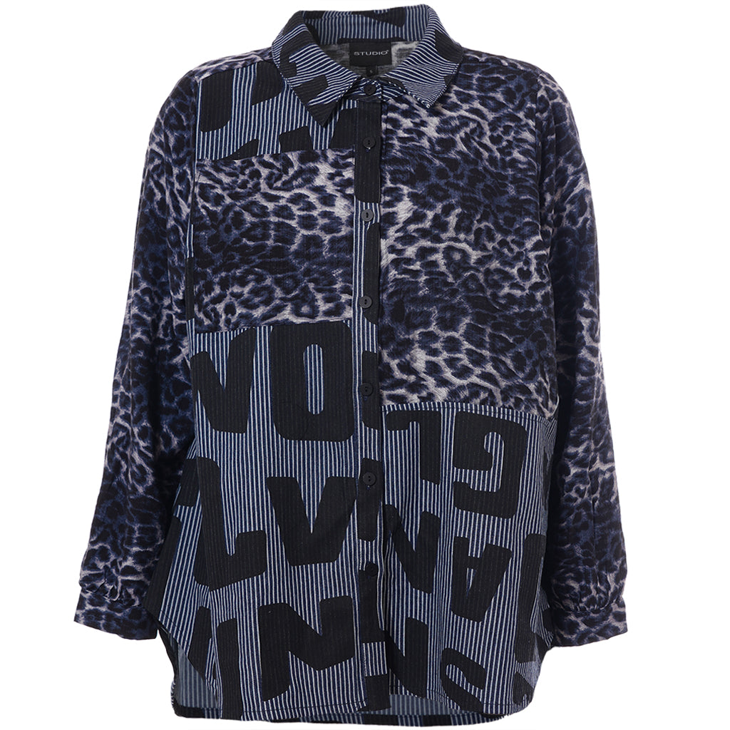Gør din garderobe unik med denne moderne skjorte fra Studio. Med en dristig kombination af forskellige prints, herunder et leopardmønster i viskose og store bogstaver, skaber denne skjorte et iøjnefaldende statement. Designet i mørkeblå og sorte toner, tilbyder skjorten en afslappet pasform, perfekt til både hverdagsbrug og specielle lejligheder.