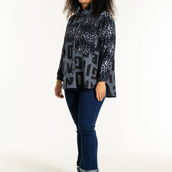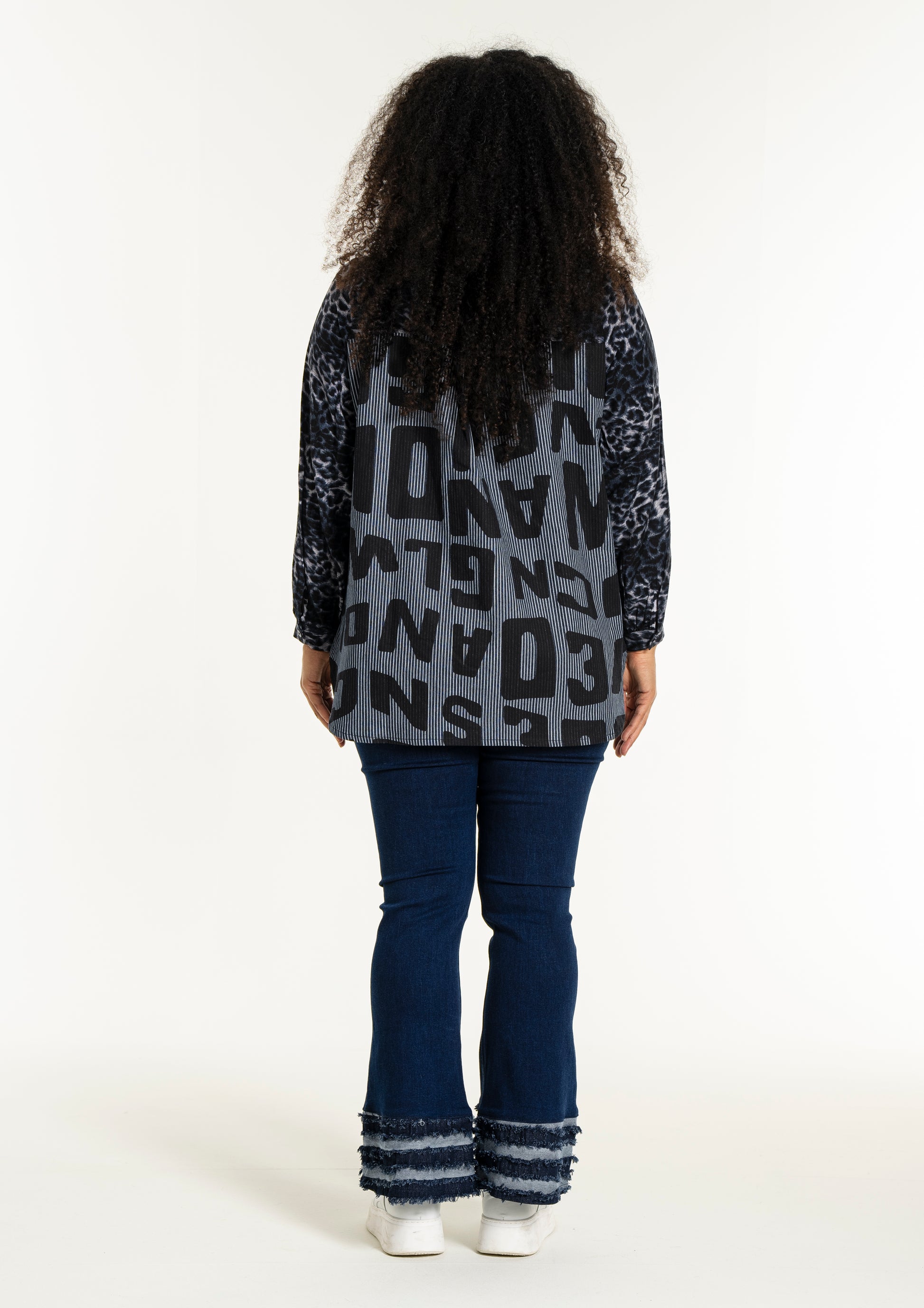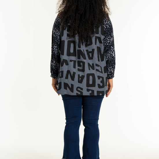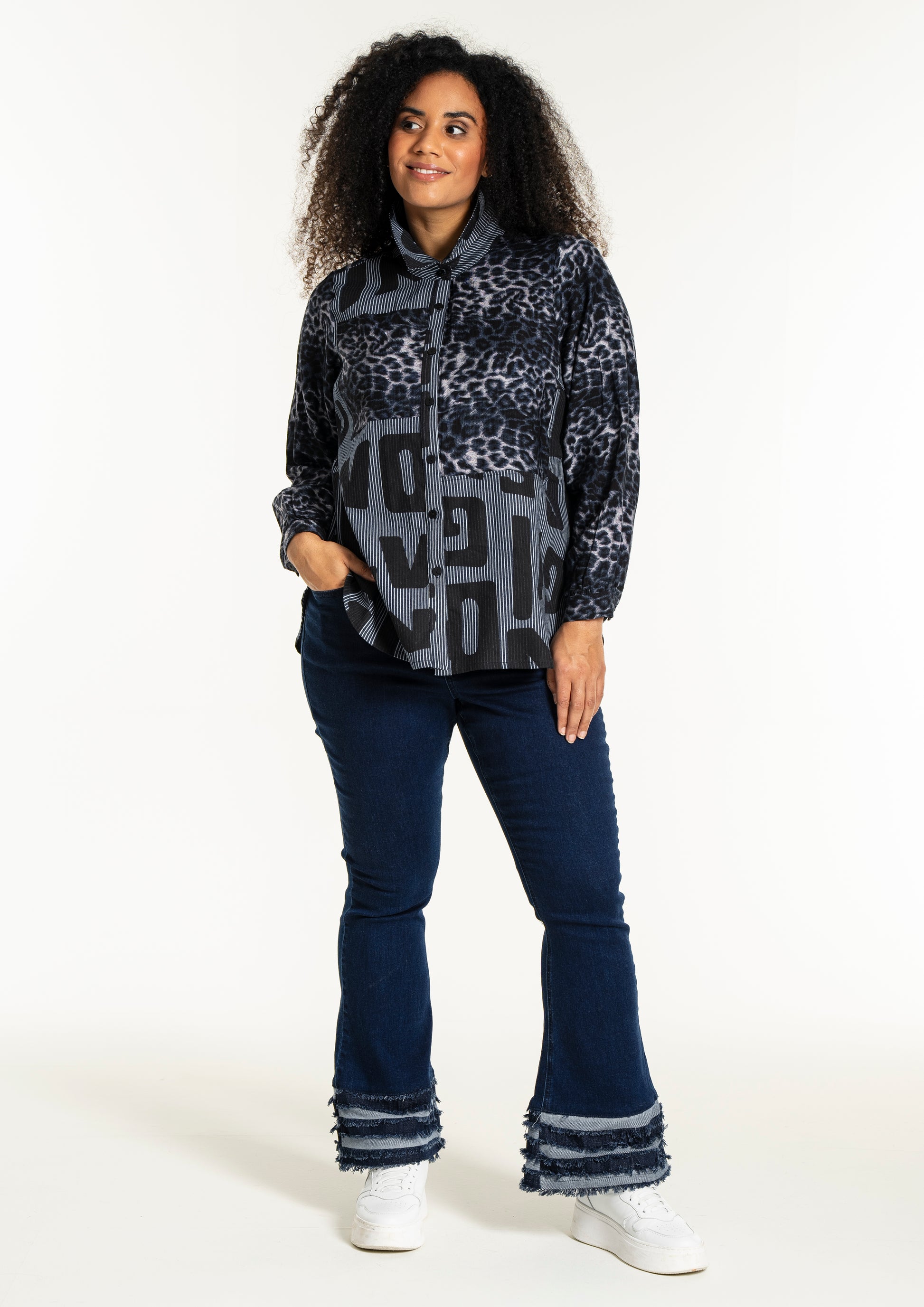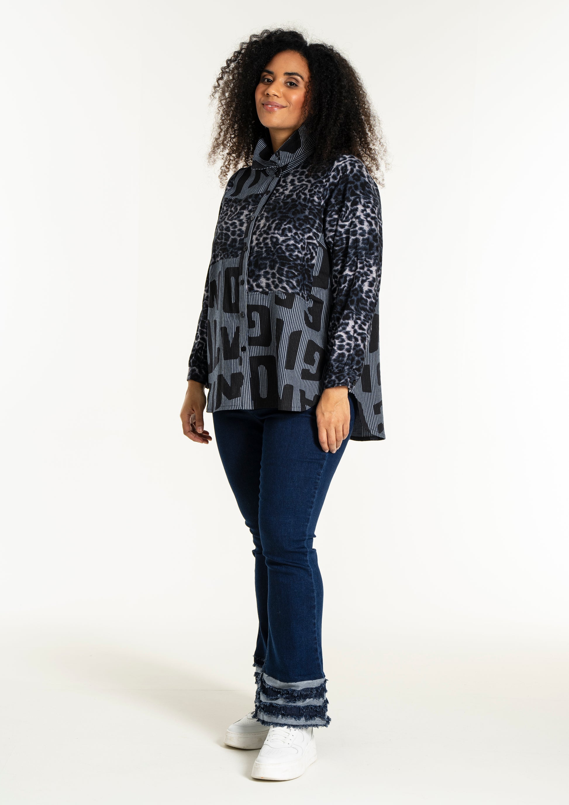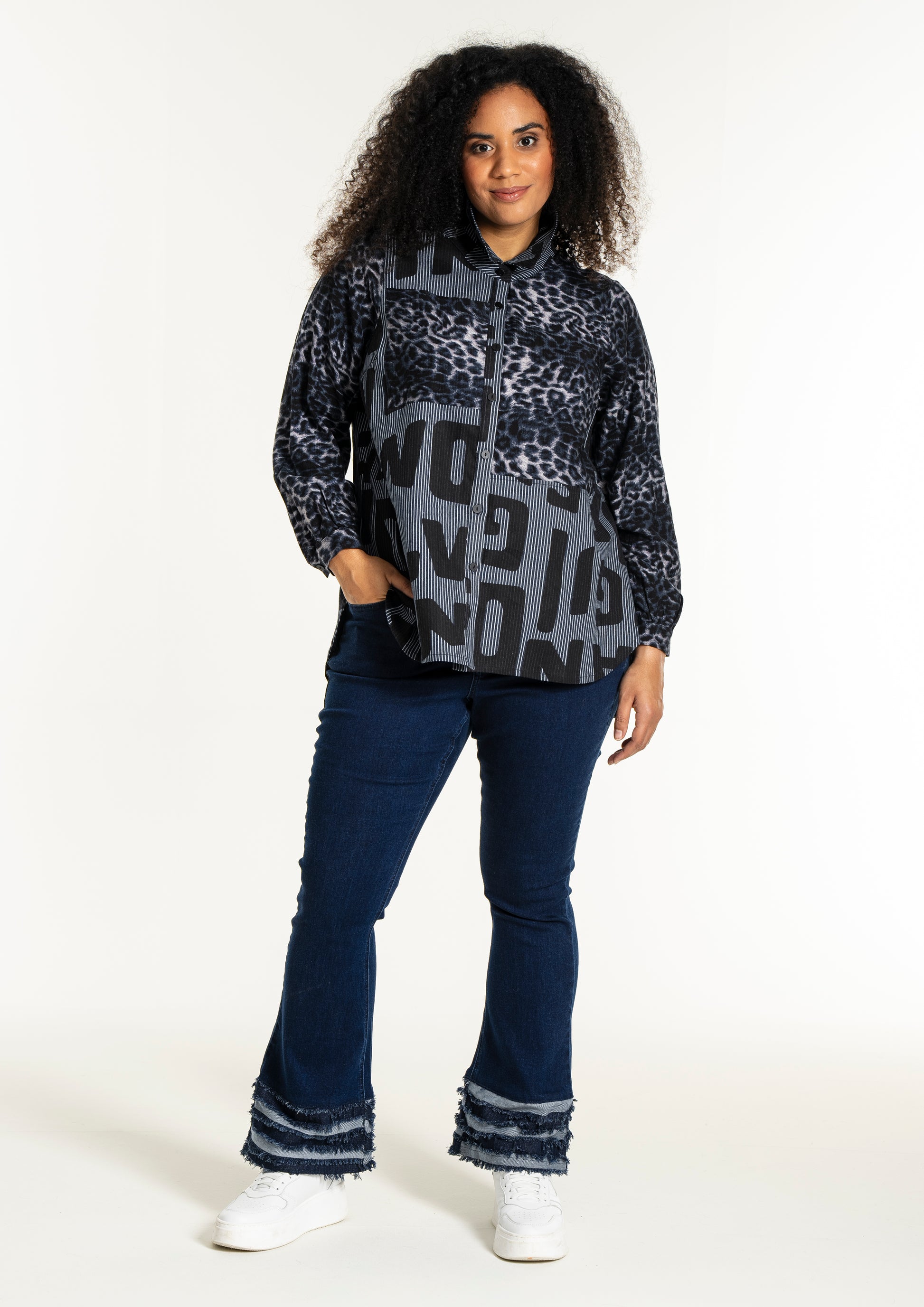 Gør din garderobe unik med denne moderne skjorte fra Studio. Med en dristig kombination af forskellige prints, herunder et leopardmønster i viskose og store bogstaver, skaber denne skjorte et iøjnefaldende statement. Designet i mørkeblå og sorte toner, tilbyder skjorten en afslappet pasform, perfekt til både hverdagsbrug og specielle lejligheder.