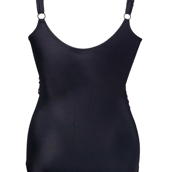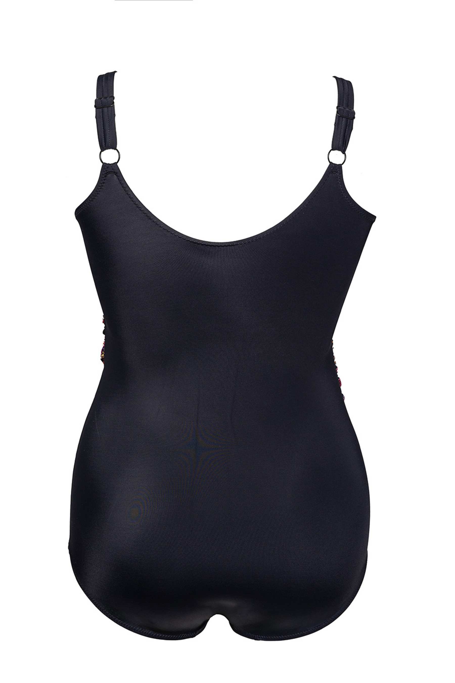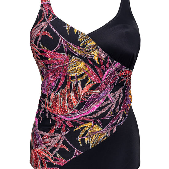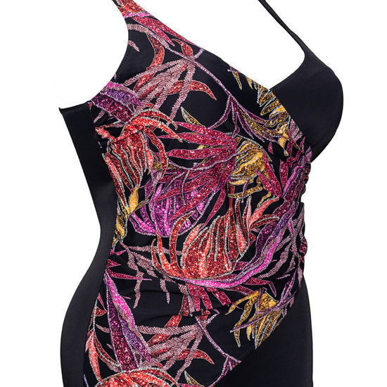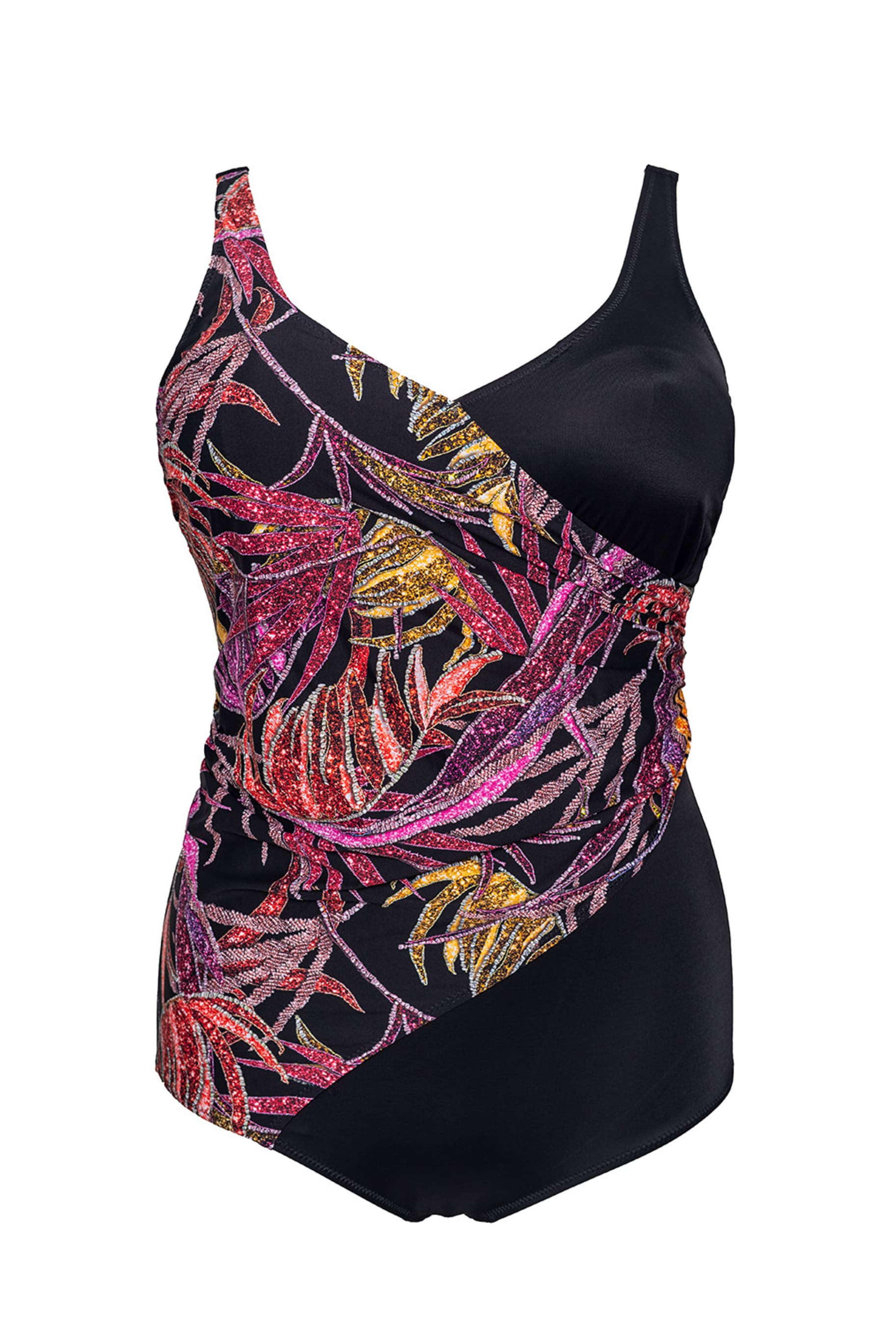 Denne smukke badedragt fra Plaisir kombinerer et klassisk sort design med et livligt og eksotisk bladprint i lyserøde, lilla og gyldne nuancer. Det asymmetriske snit skaber en flot slå-om effekt over barmen og maven, hvilket giver en utrolig klædelig silhuet, der fremhæver dine former på fineste vis.