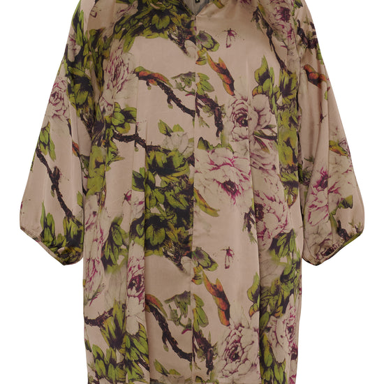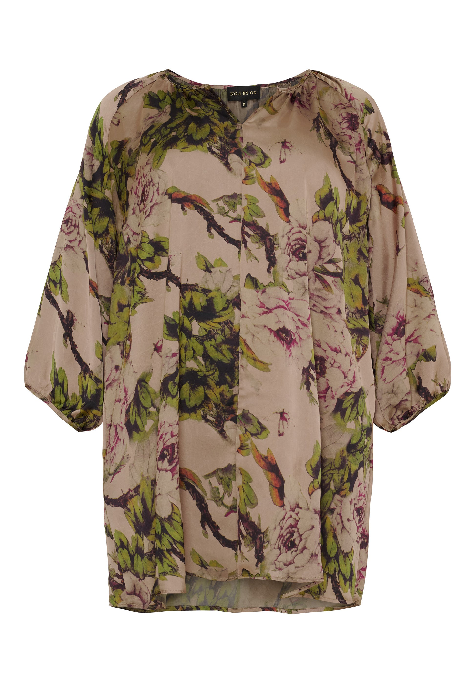 Oplev den perfekte kombination af komfort og stil med denne tunika fra NO. 1 BY OX. Tunikaen er designet i et let og luftigt materiale af 100% polyester satin, der sikrer en behagelig bæreoplevelse hele dagen. Den har en rund halsudskæring med en v-åbning og 3/4 ærmer, der tilføjer et klassisk touch til det moderne design. Den smukke sandfarve med blomsterprint gør tunikaen til et alsidigt valg, der passer til enhver lejlighed.