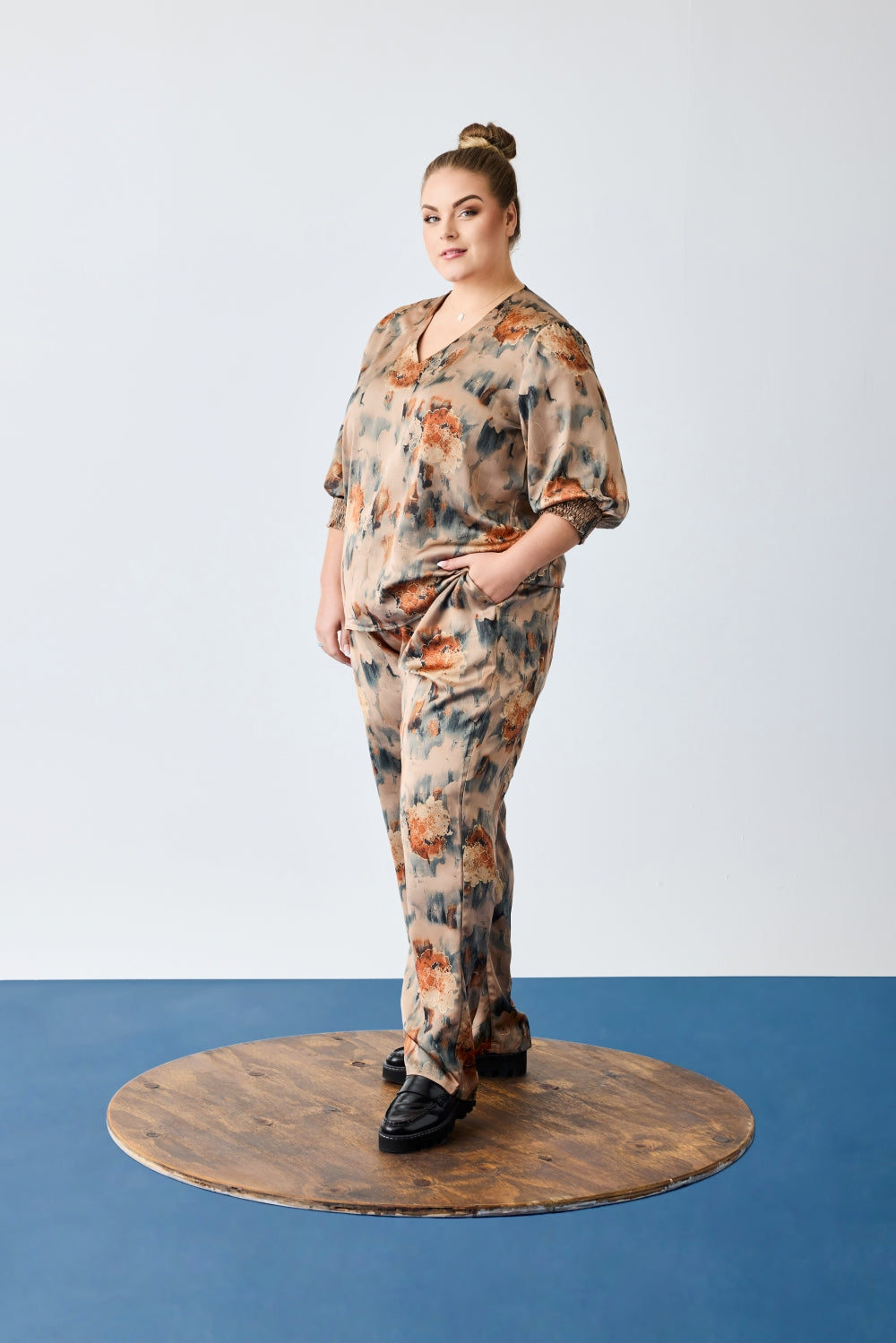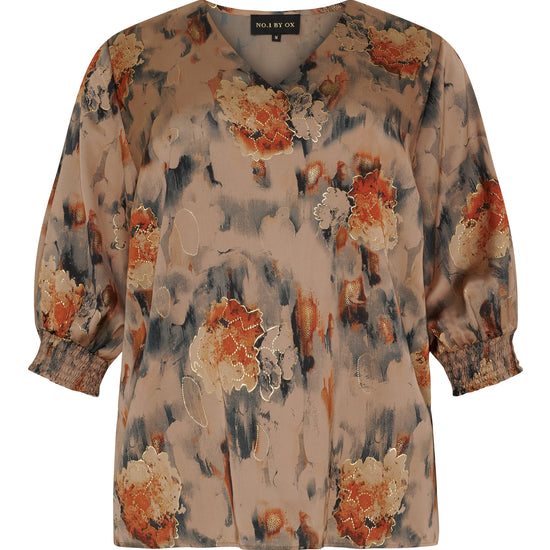 En feminin bluse, der kombinerer komfort med luksus! Blusen er fremstillet i 100% polyester satin og har et smukt print i varme sandfarver med aprikos blomster og diskrete gulddetaljer, der giver et eksklusivt touch. V-udskæringen og de korte ærmer med smock-kanter skaber et moderne og elegant udtryk, mens den regulære pasform sikrer, at blusen sidder behageligt.