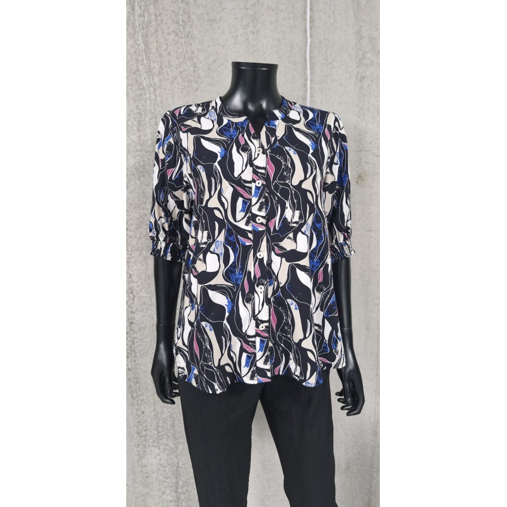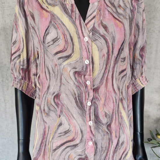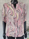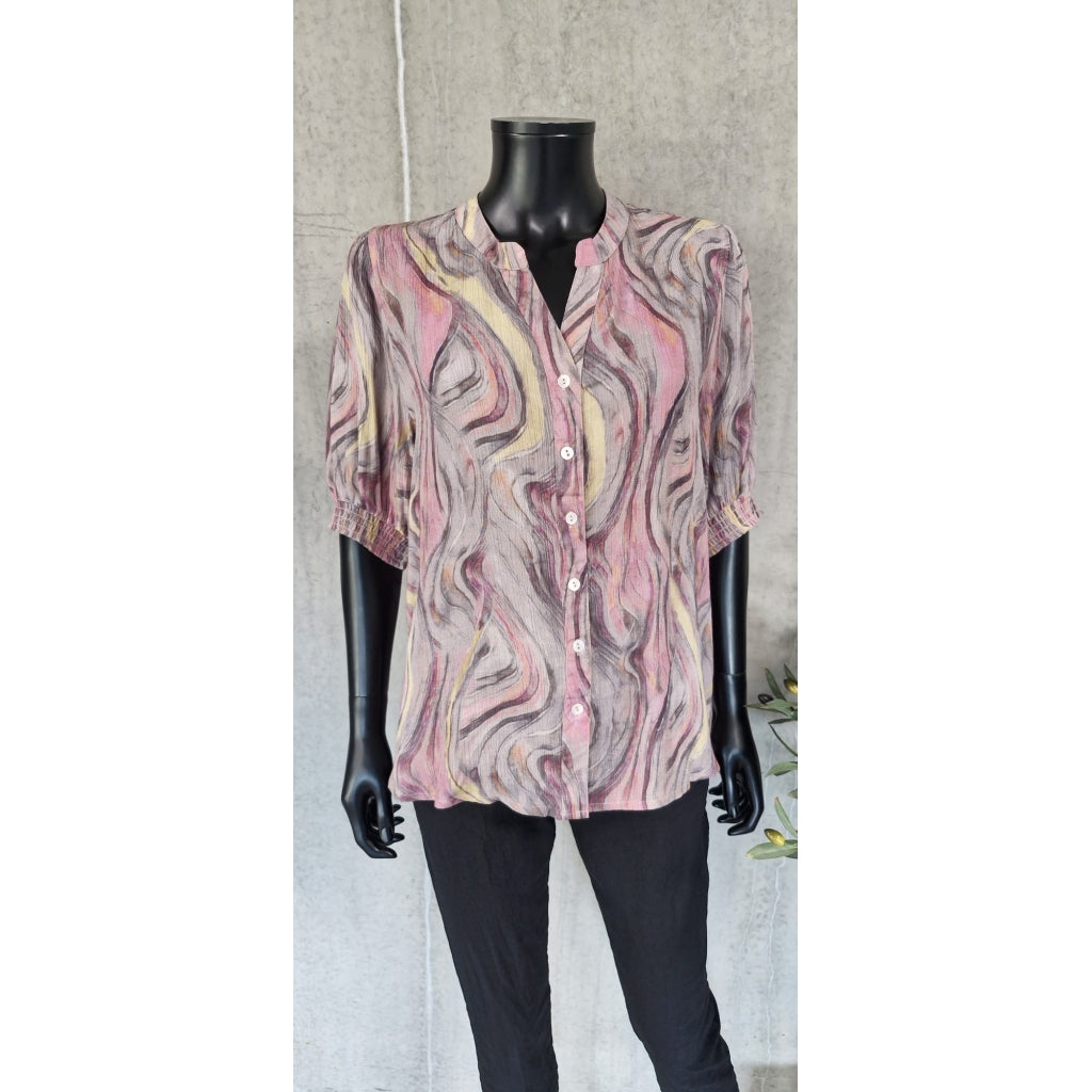 Oplev den perfekte kombination af stil og komfort med denne elegante skjorte fra Vanting. Med sit unikke marmorerede mønster i smukke rosa og sorte nuancer, er denne skjorte en sikker vinder i garderoben. Designet er moderne med en kravefri halsudskæring og en knaplukning, der tilføjer et sofistikeret touch.