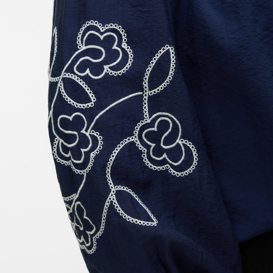 Denne bluse kombinerer et løstsiddende fit med elegant broderi og detaljerede rynker, som tilføjer et feminint og stilfuldt præg. Den har en bundet halsudskæring og lange ærmer med elastiske manchetter, hvilket giver både komfort og et klassisk look. Med V-hals og snor detalje, fremstår blusen som et alsidigt valg, der kan dresses op til både formelle og afslappede anledninger.