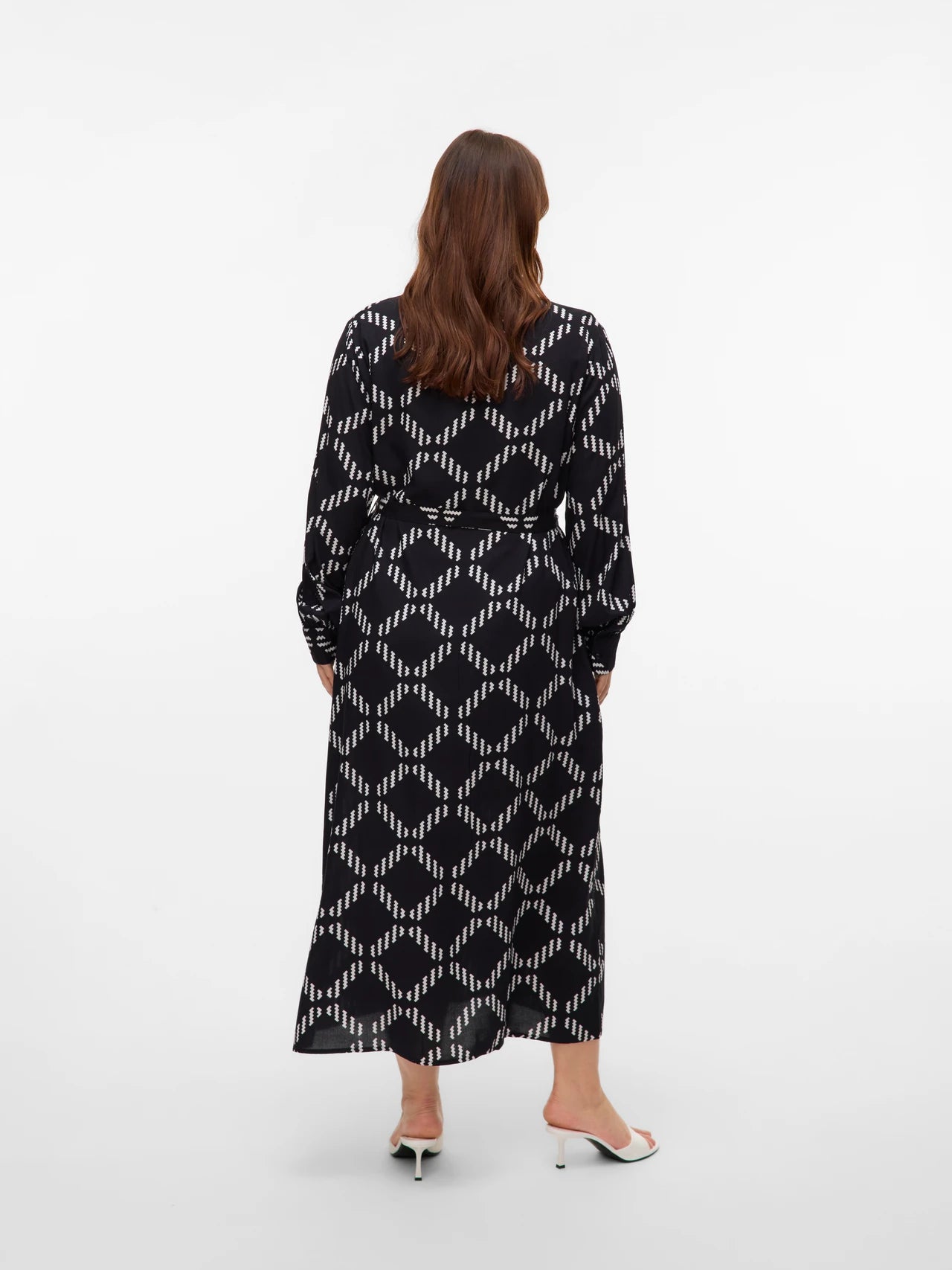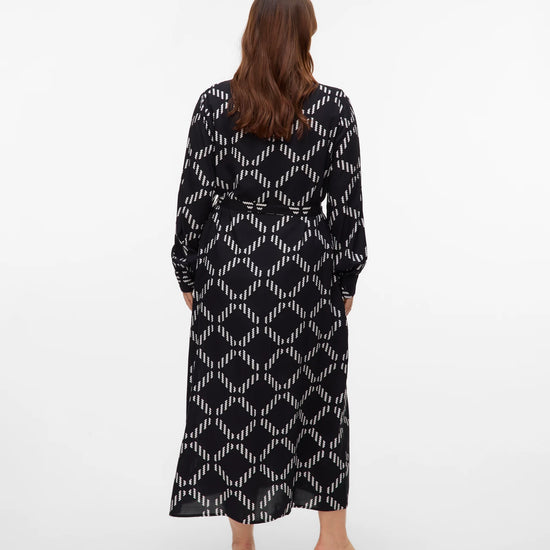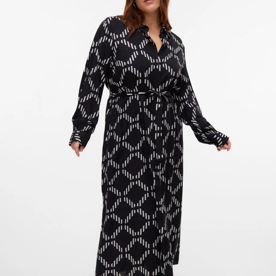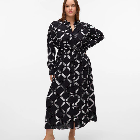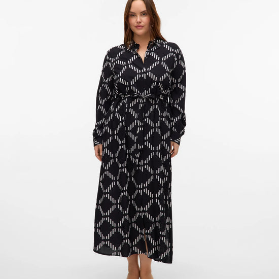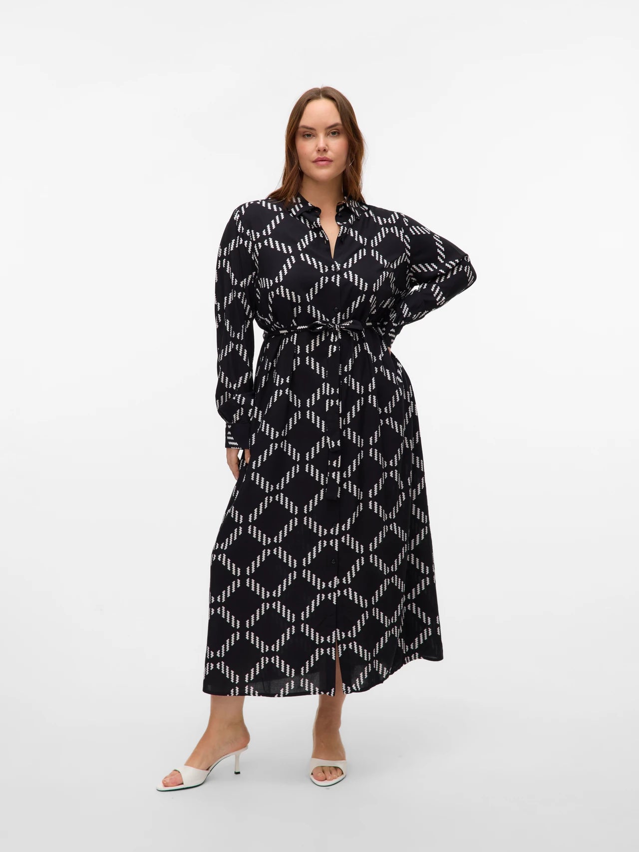 Oplev den sofistikerede charme ved denne kjole fra Vero Moda Curve, der kombinerer stil med bæredygtighed. Kjolen har et flot geometrisk mønster i sort og hvidt, som tilføjer et dynamisk og moderne touch til dit look. Med sin regular fit giver kjolen en flot silhuet, der passer perfekt til både hverdag og festlige anledninger.
