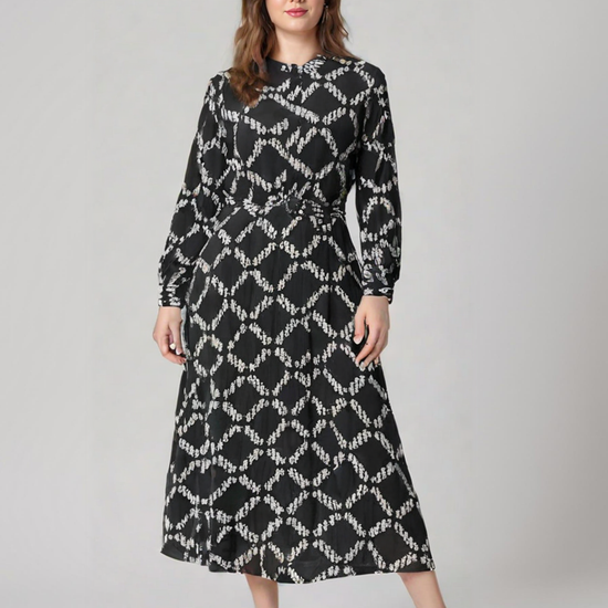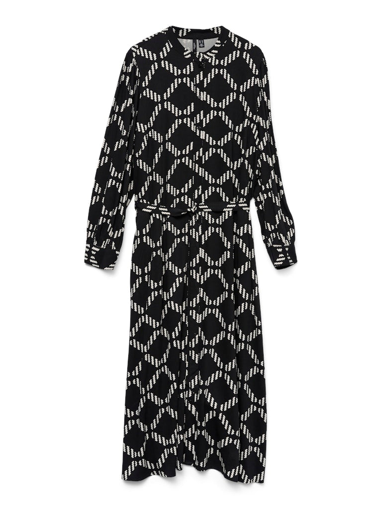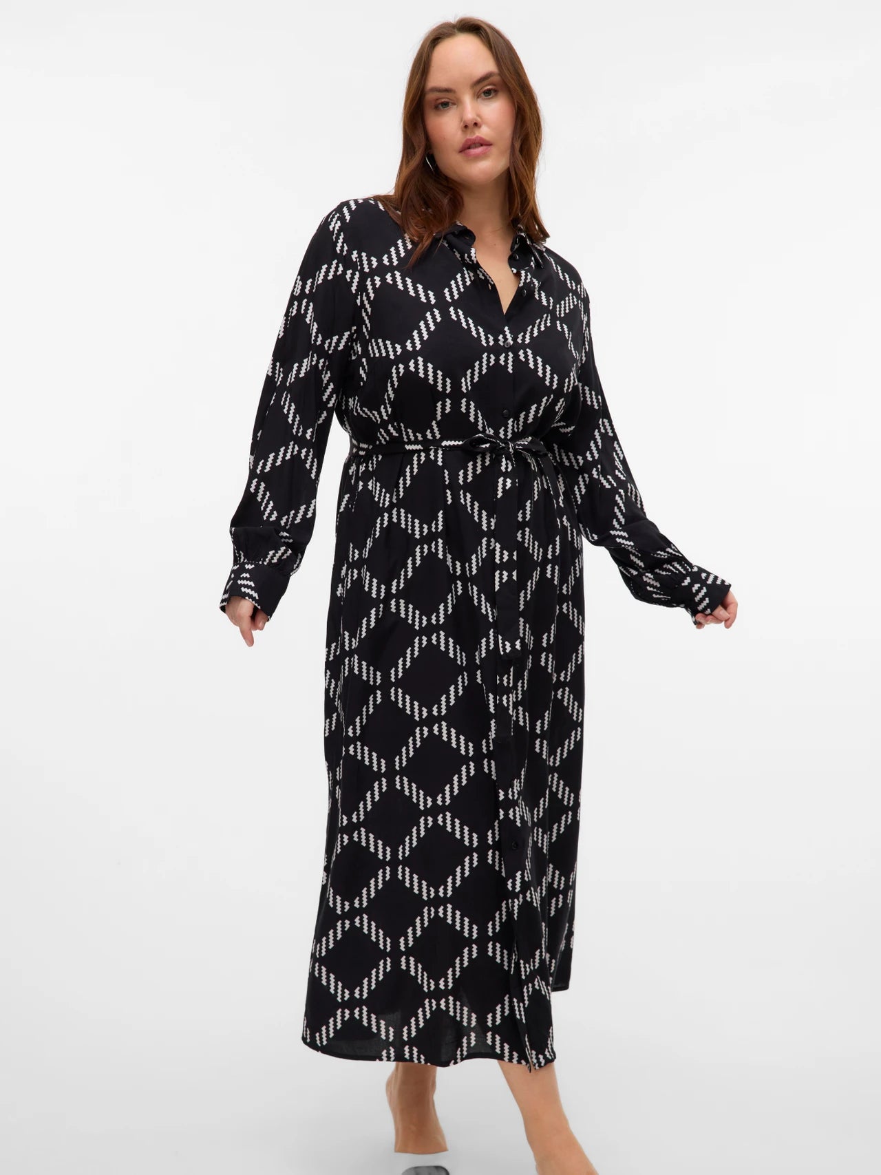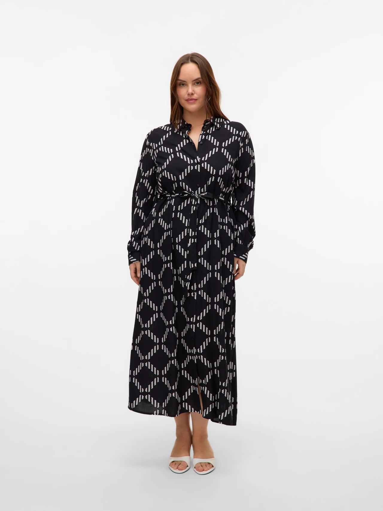 Oplev den sofistikerede charme ved denne kjole fra Vero Moda Curve, der kombinerer stil med bæredygtighed. Kjolen har et flot geometrisk mønster i sort og hvidt, som tilføjer et dynamisk og moderne touch til dit look. Med sin regular fit giver kjolen en flot silhuet, der passer perfekt til både hverdag og festlige anledninger.