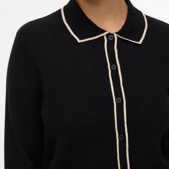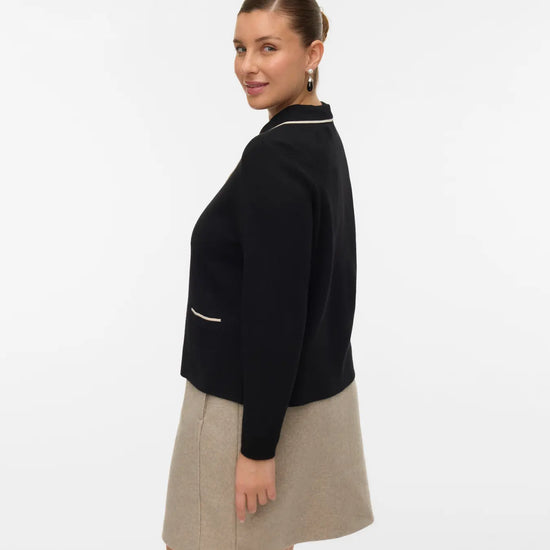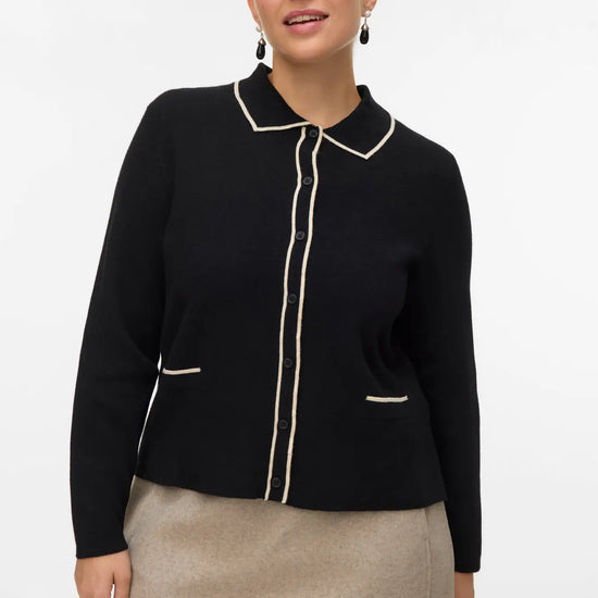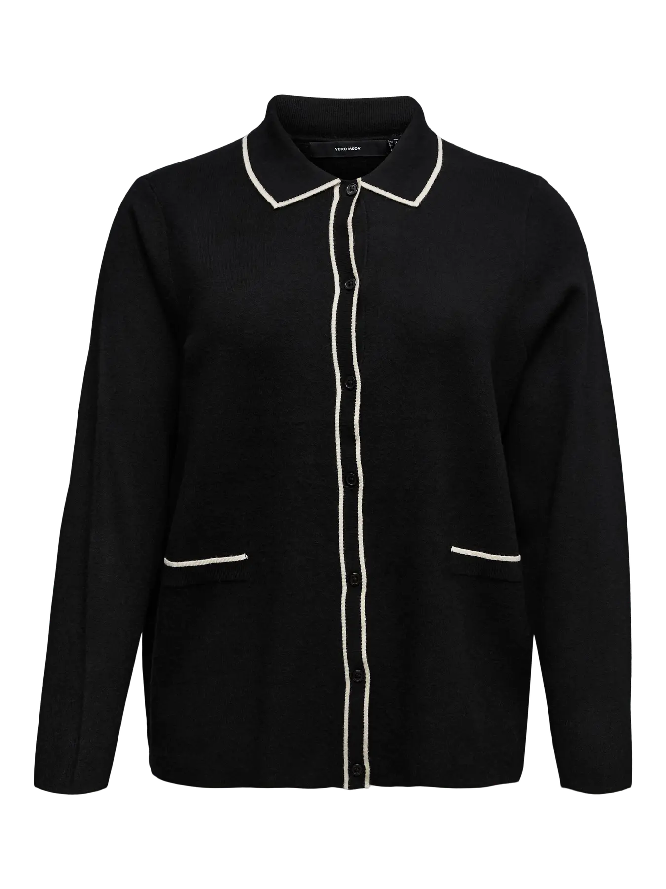 Denne sorte cardigan fra Vero Moda Curve er designet med et klassisk og sofistikeret udtryk, der fremhæves af de elegante, lyse kontrastkanter langs kraven, knaplukningen og de dekorative lomme-detaljer. Modellen har en pæn polokrave og lange ærmer med ribkant, hvilket sikrer en god og behagelig pasform omkring håndleddene. Pasformen er skabt til at smyge sig flot om en kurvet figur uden at stramme, hvilket gør den ideel som et flot ekstra lag i overgangsperioderne eller indendørs.