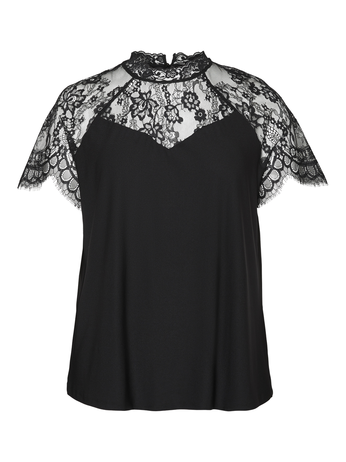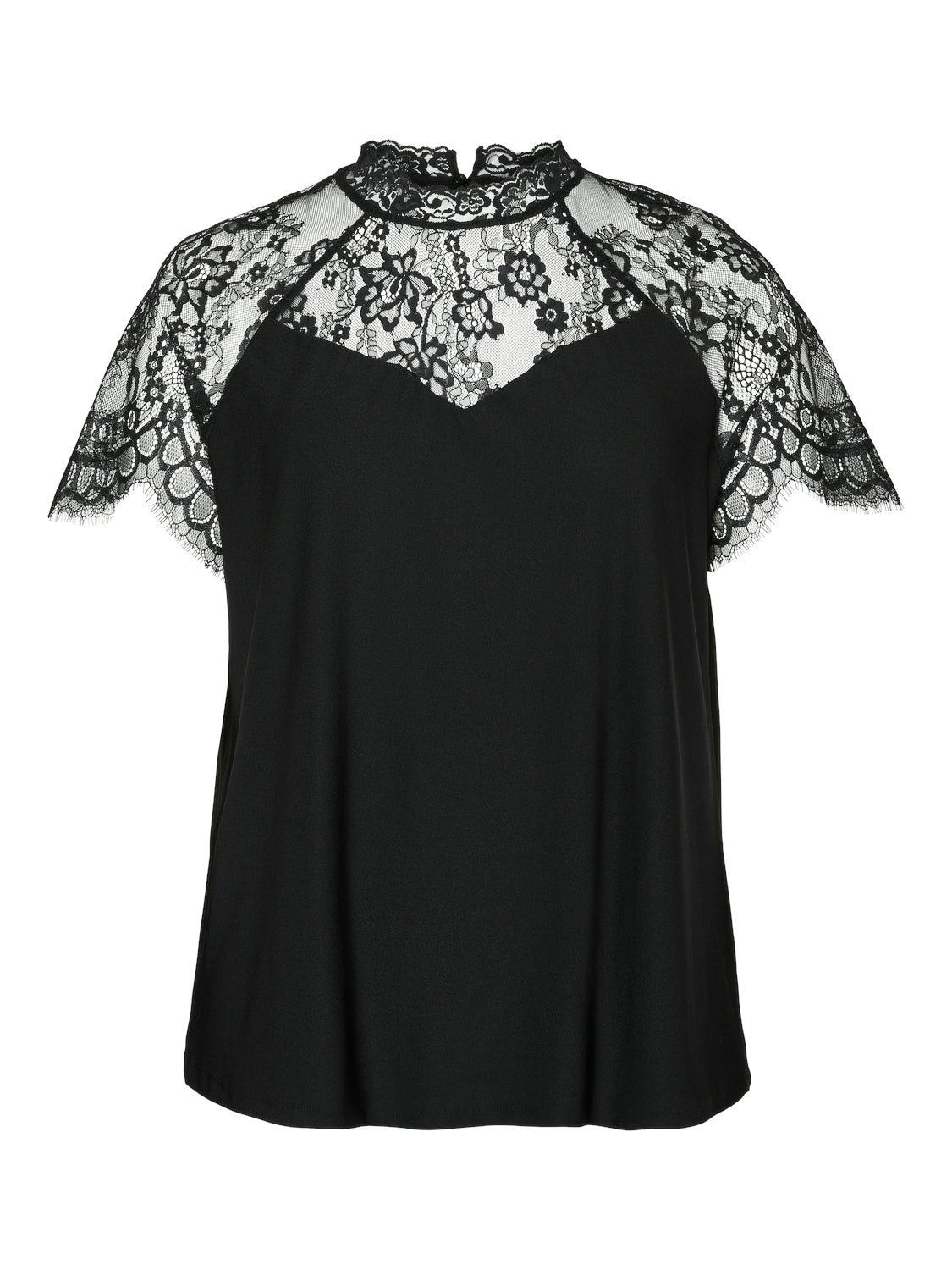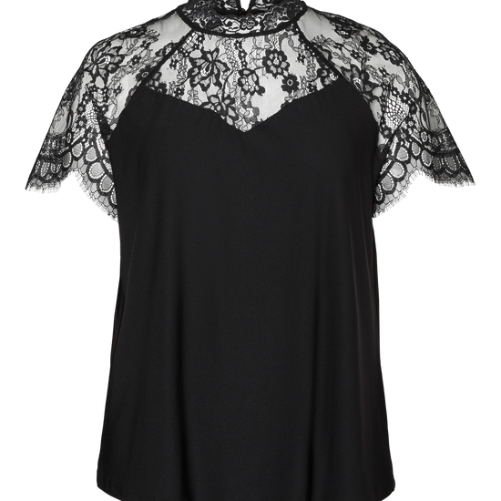 Toppen er designet med gennemsigtigt blondestof, der dækker skuldre og den øvre del af brystet, og fuldendes af en fin kant omkring halsen, som skaber en lille, stående krave. Denne bluse har en løs pasform, der falder flot langs kroppen, og ser flot ud, uanset om den bæres udenpå eller indeni bukser eller nederdel.