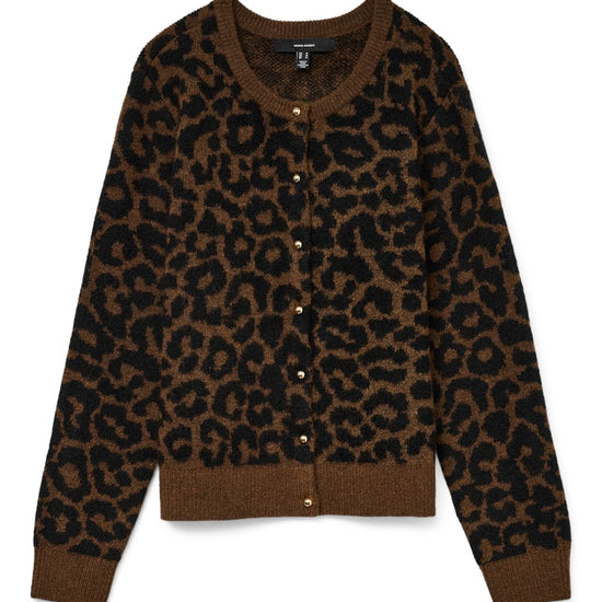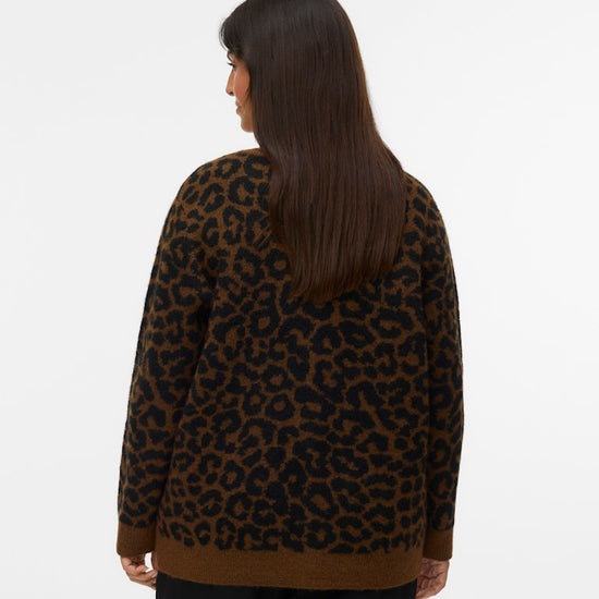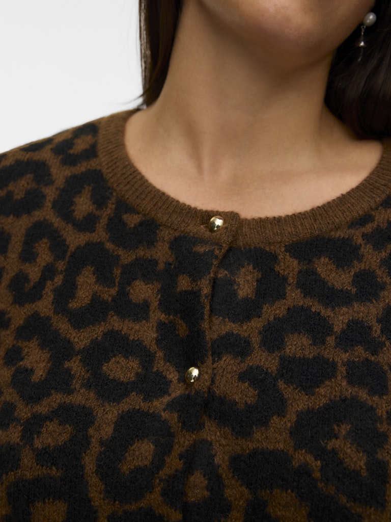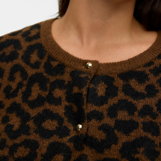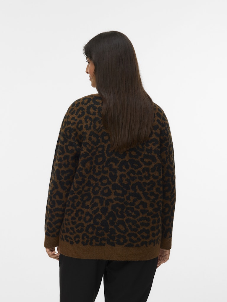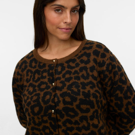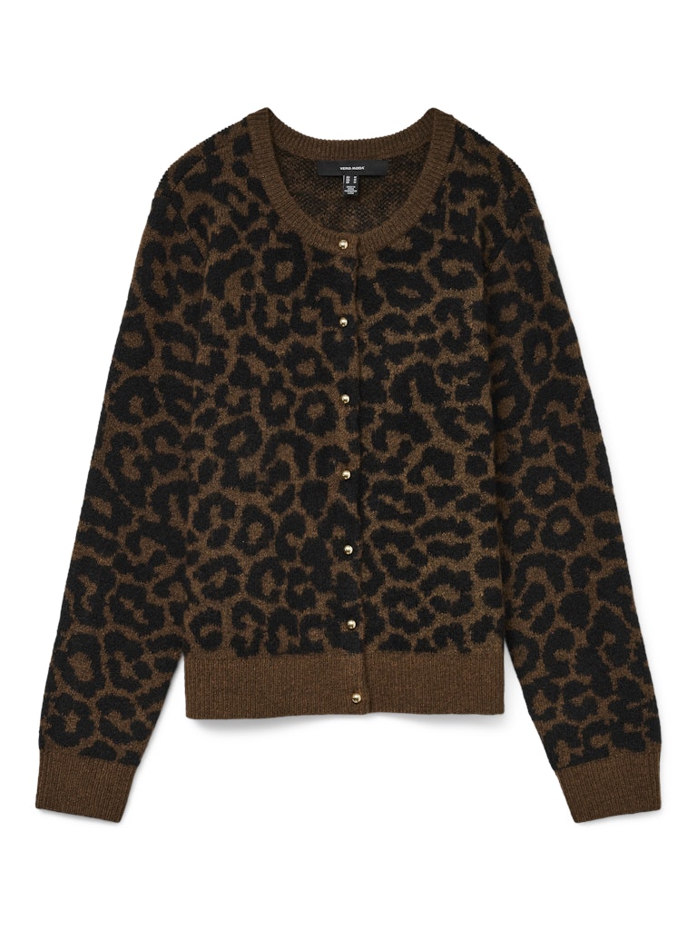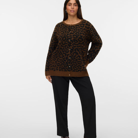 Denne smarte model fra Vero Moda Curve er designet med et iøjnefaldende leopardprint i brune og sorte nuancer, der giver kant til dit outfit. Cardiganen har en rund halsudskæring med en fin rillet kant og lukkes foran med elegante, guldfarvede knapper, som står i flot kontrast til det mørke mønster.