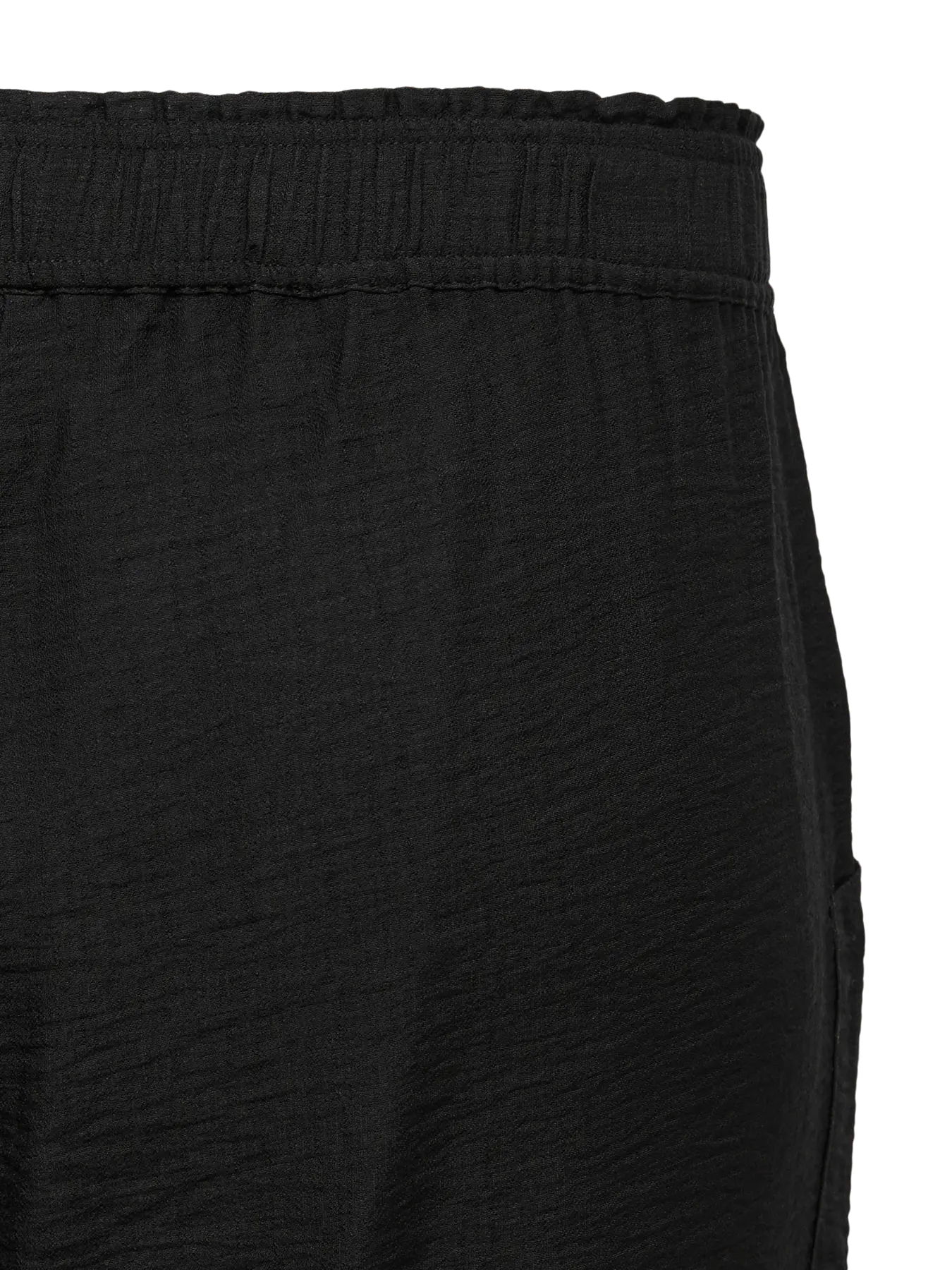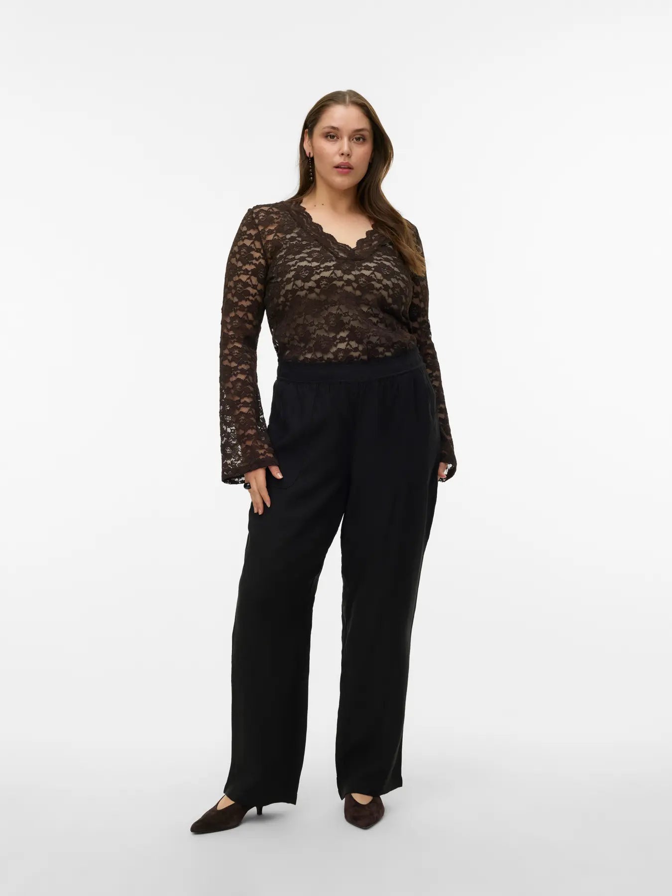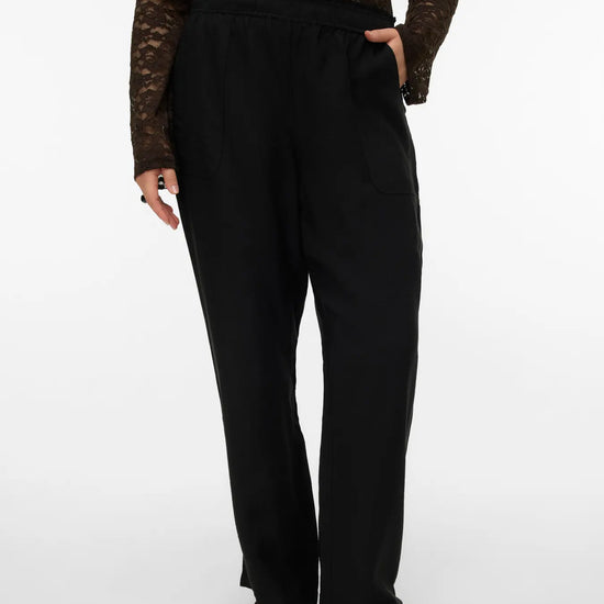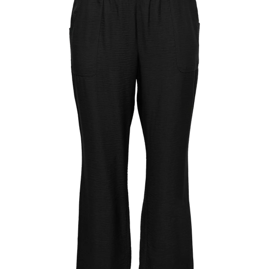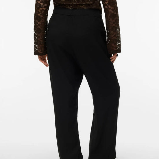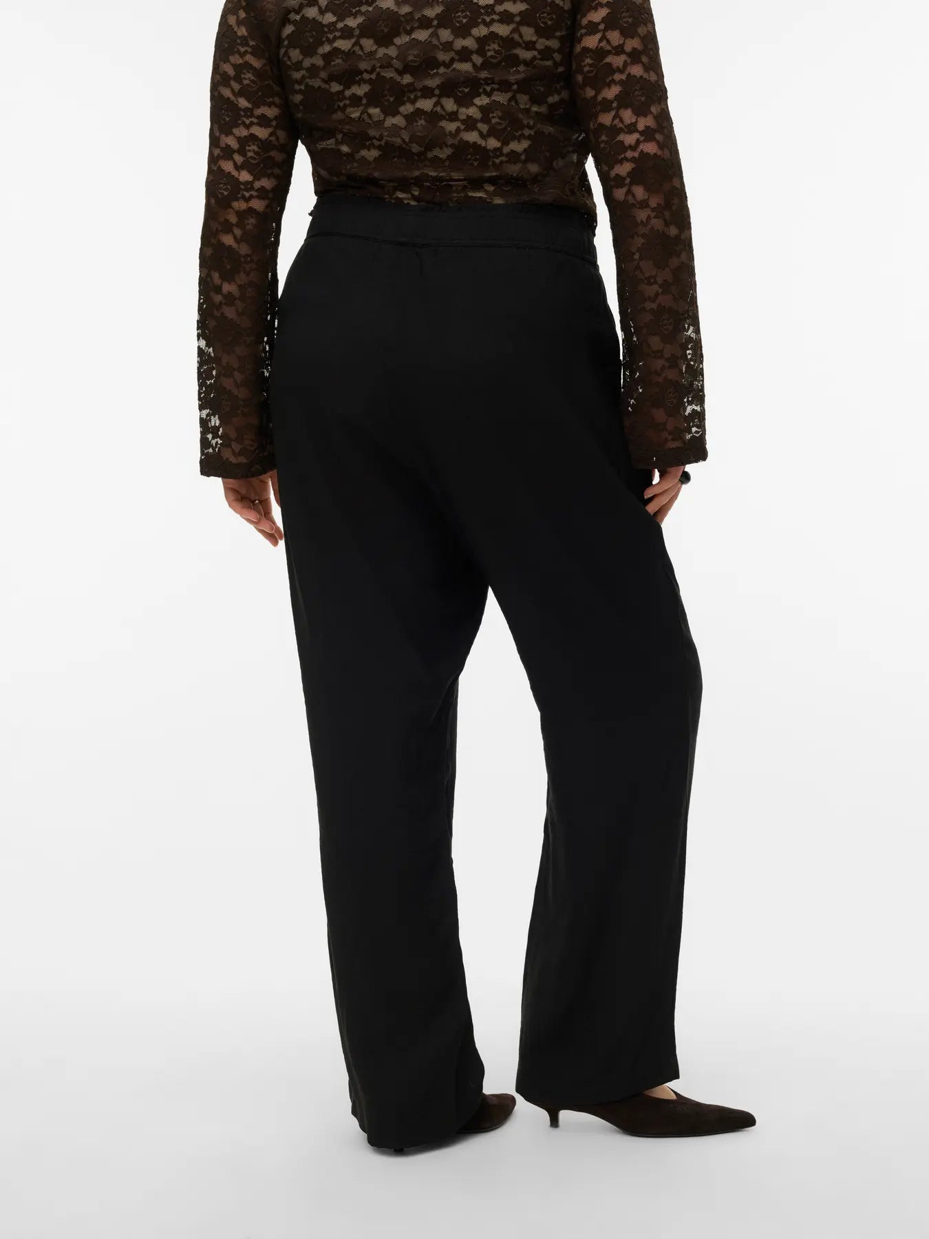 Disse sorte bukser fra Vero Moda Curve er et oplagt valg, hvis du søger en kombination af stil og høj komfort. Modellen byder på en flatterende høj talje med en bred elastikkant, der sikrer en behagelig pasform hele dagen uden at stramme. Bukserne har en lækker løs pasform med lige ben, der falder blødt, og de praktiske sidelommer giver et afslappet og moderne twist til det elegante look.