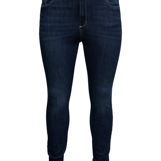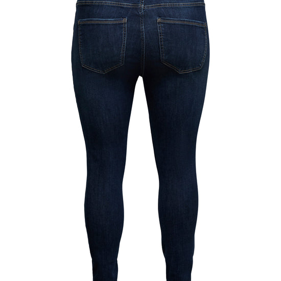 Disse skinny jeans med høj talje er perfekte til kvinder med kurver, der ønsker et tidløst og alsidigt denimlook. Materialet er strækbart, hvilket sikrer en behagelig pasform hele dagen. Jeansene har både baglommer, småpengeområde og forlommer, som giver praktisk funktionalitet. Det mørkeblå denim gør dem lette at style, for eksempel med en oversized skjorte og høje støvler for et chic hverdagslook.