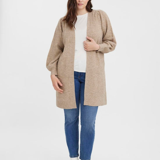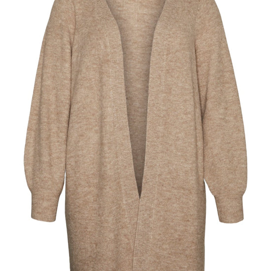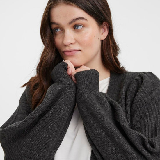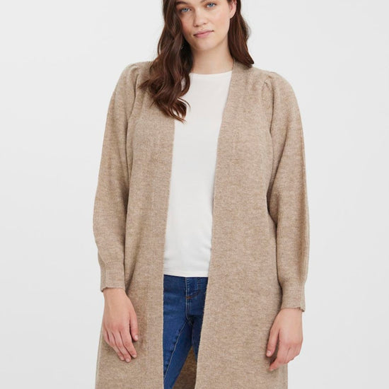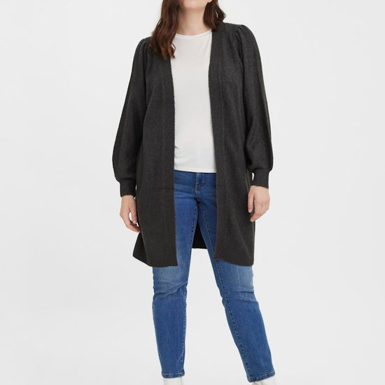 - Lang cardigan med åben front og moderne puf-ærmer.