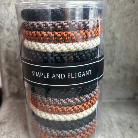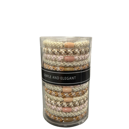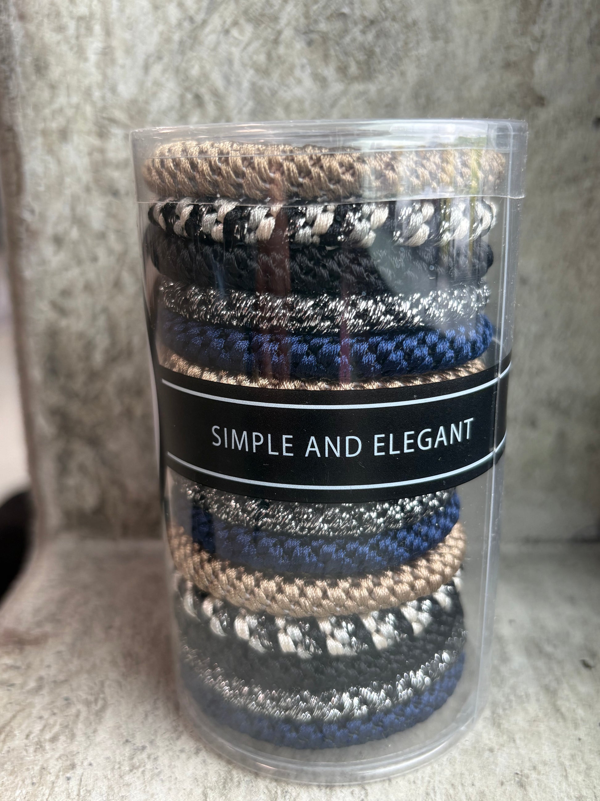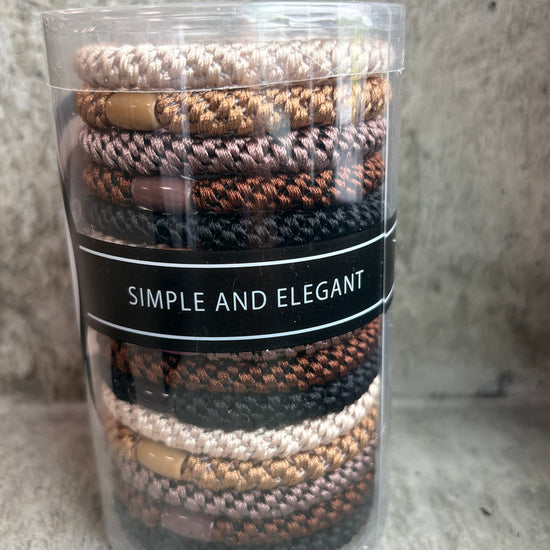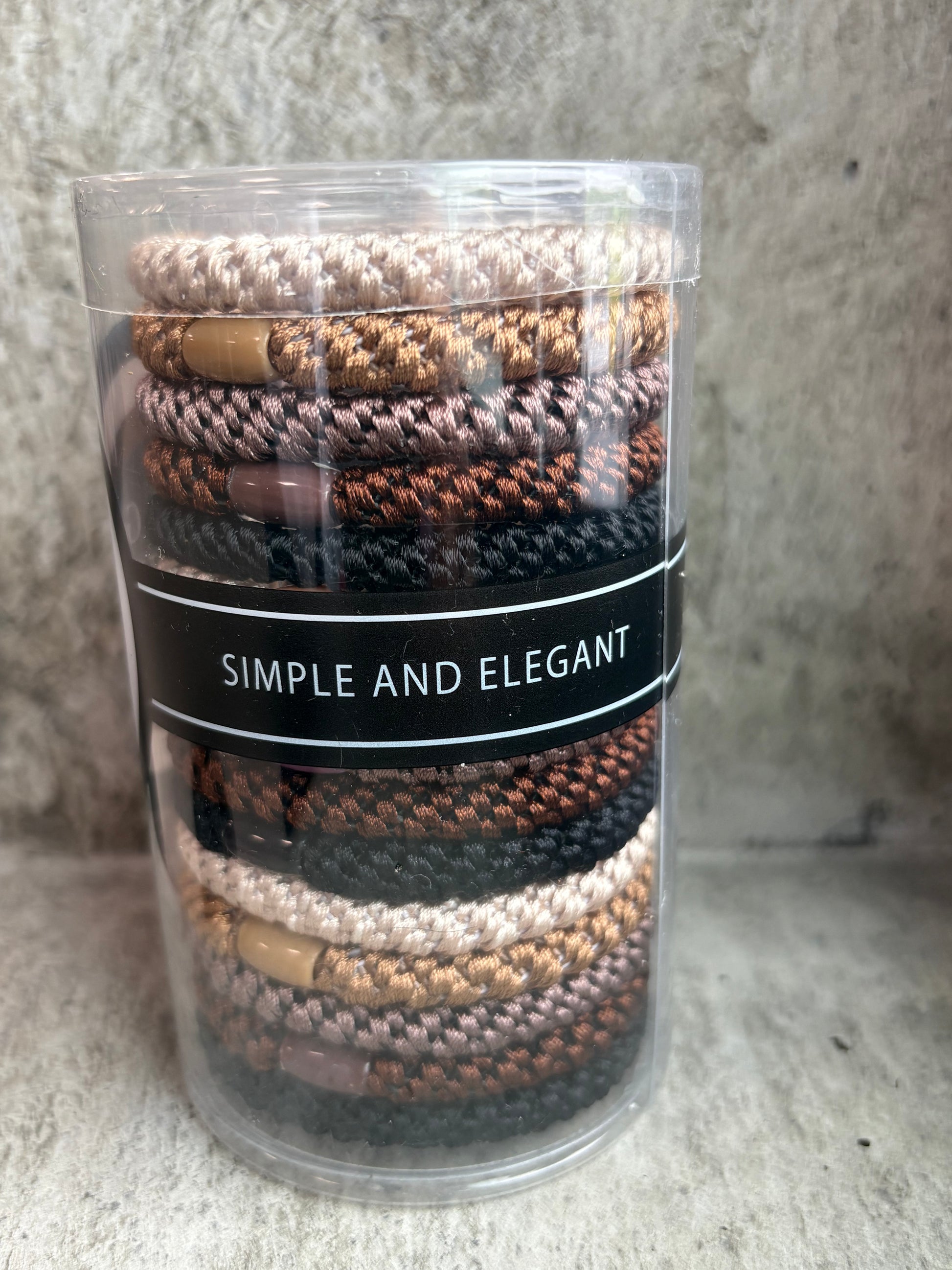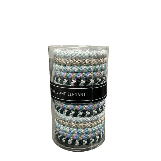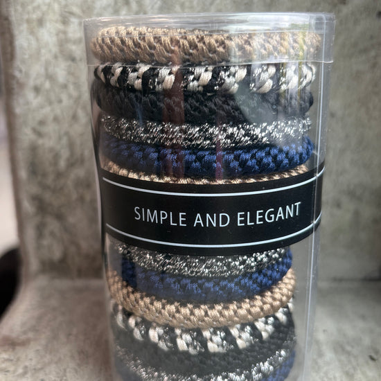 Dette rør fra Vanting indeholder hele 15 forskellige hårelastikker – både ensfarvede og stribede. Du får et bredt udvalg af farver som blå, brun, sort, beige og flere nuancer, så der altid er en elastik, der matcher dit outfit. De bløde, vævede elastikker er uden metaldele, hvilket gør dem ekstra skånsomme mod håret og reducerer risikoen for slid og knæk.
