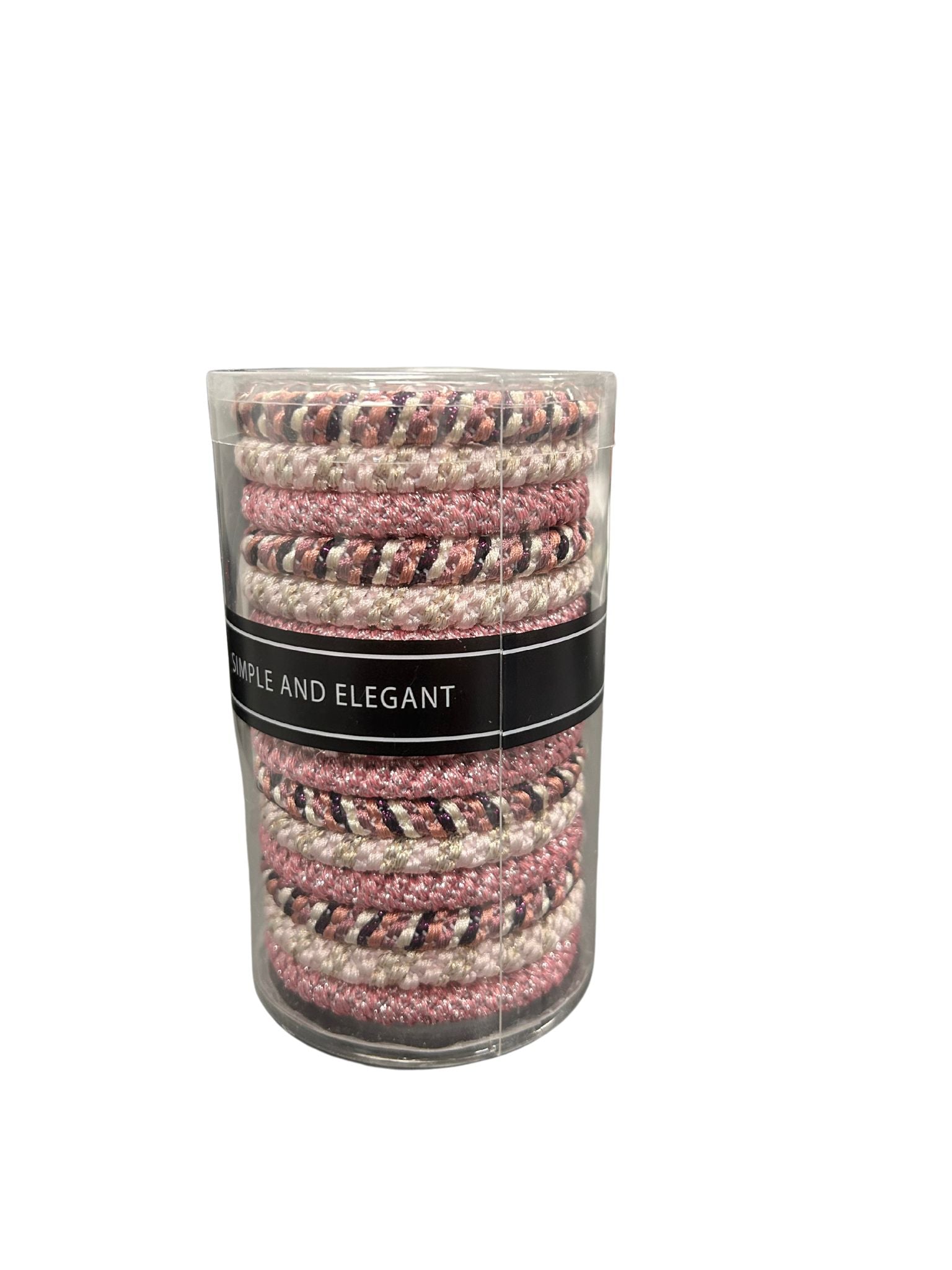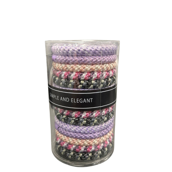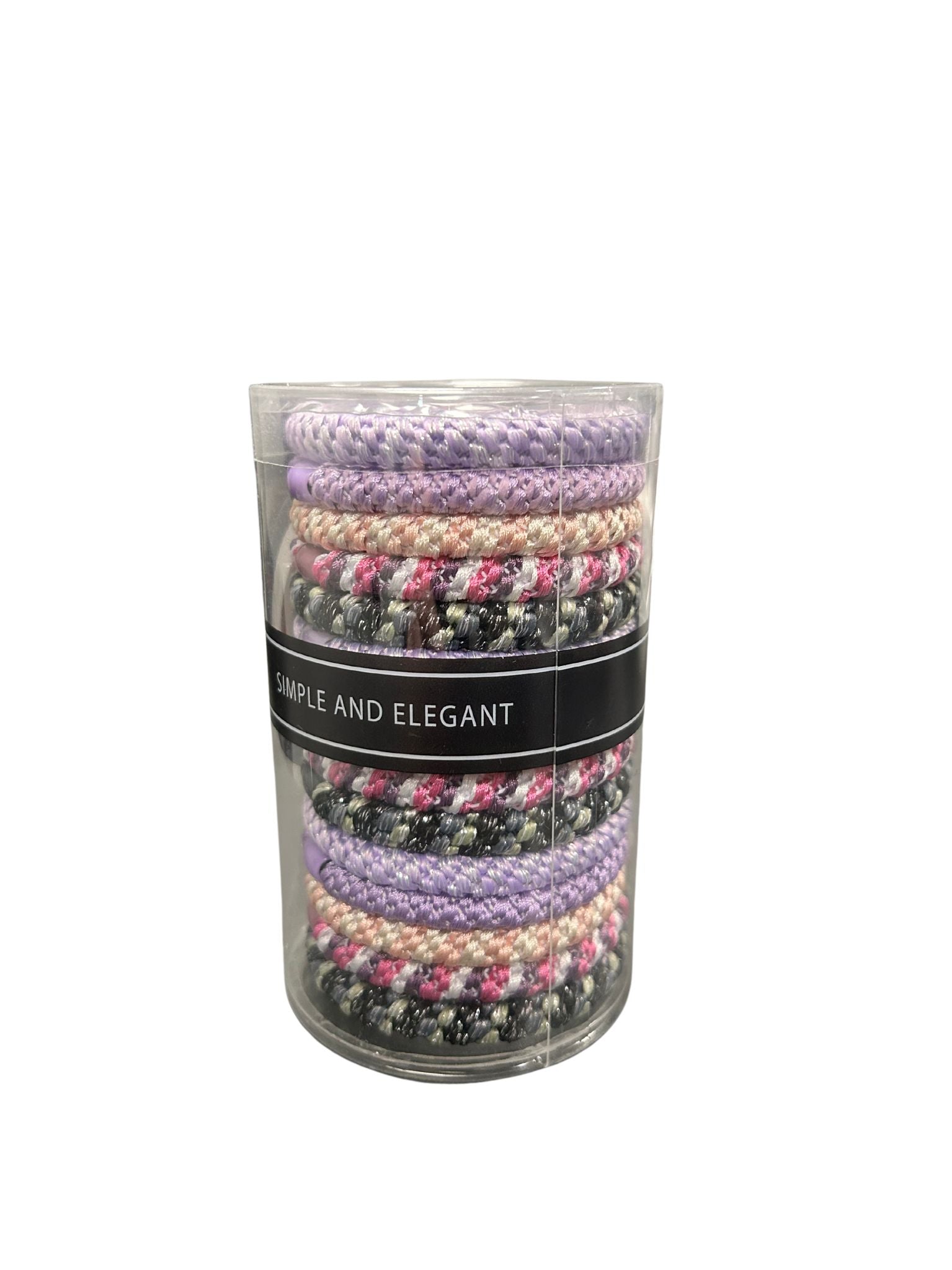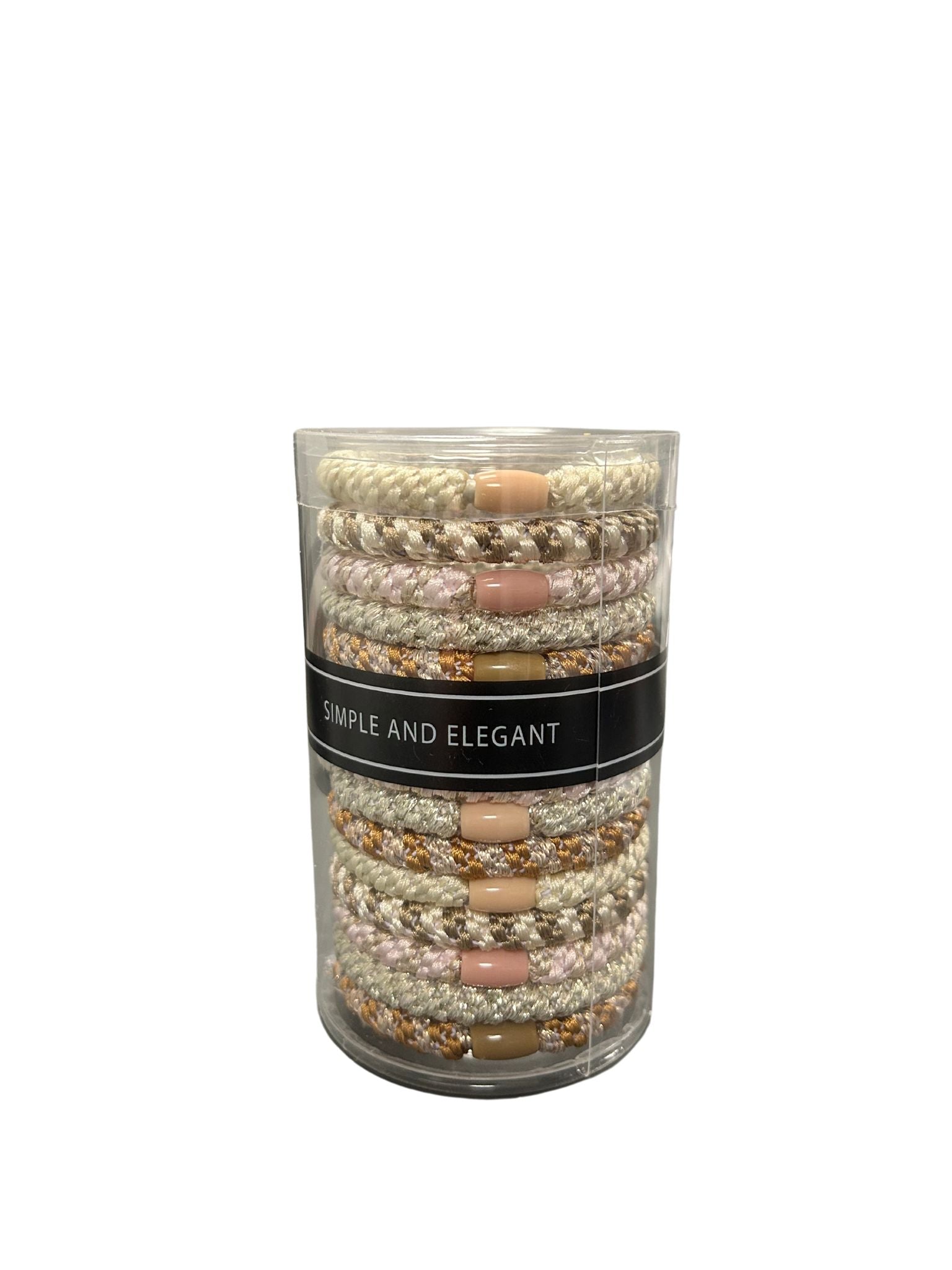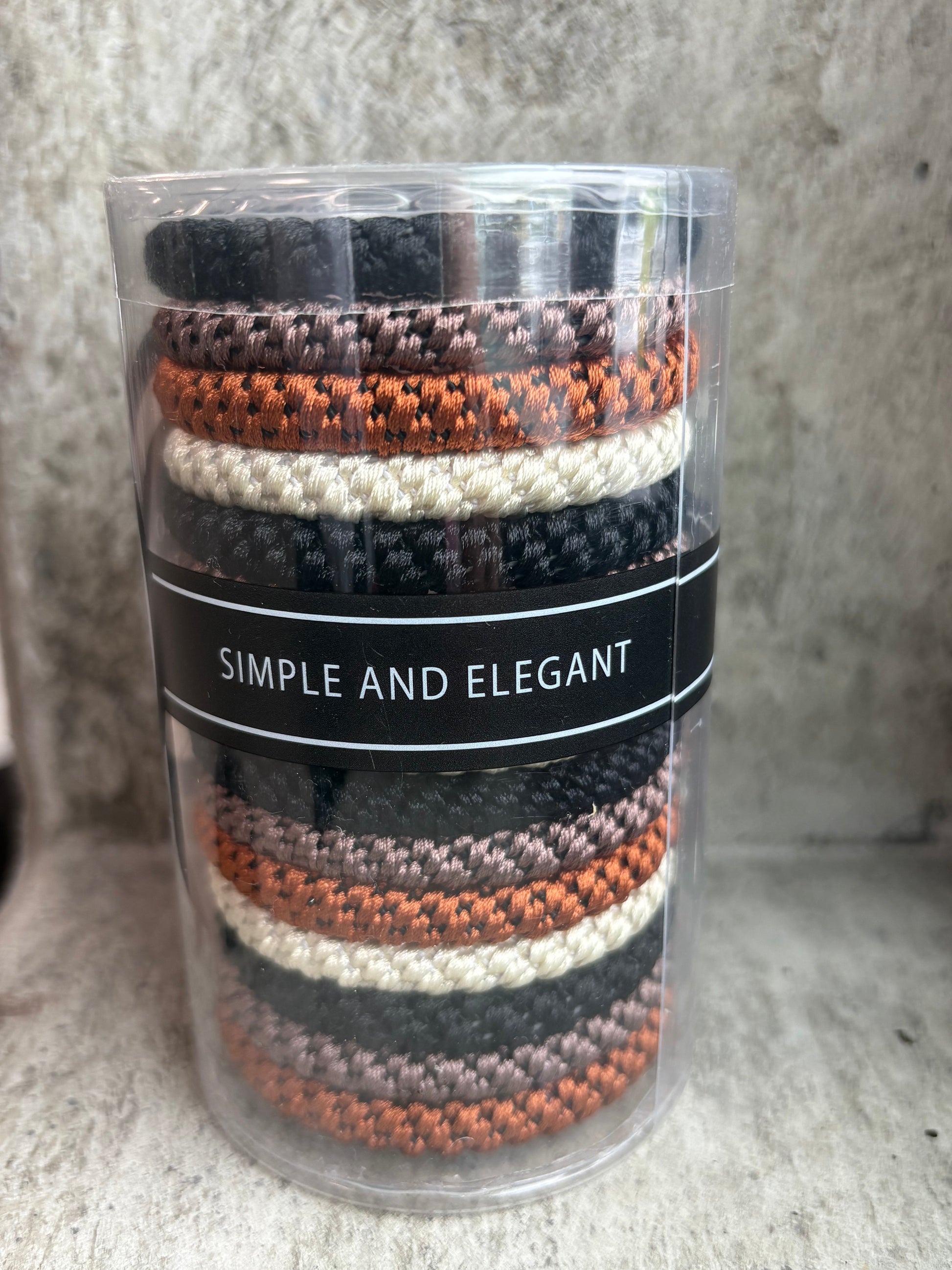 Dette rør fra Vanting indeholder hele 15 forskellige hårelastikker – både ensfarvede og stribede. Du får et bredt udvalg af farver som blå, brun, sort, beige og flere nuancer, så der altid er en elastik, der matcher dit outfit. De bløde, vævede elastikker er uden metaldele, hvilket gør dem ekstra skånsomme mod håret og reducerer risikoen for slid og knæk.