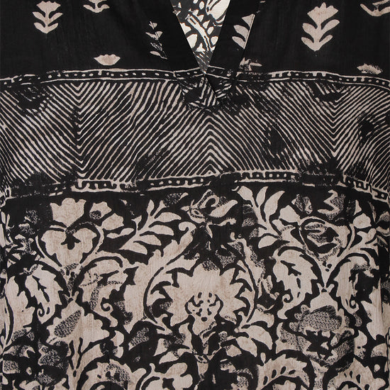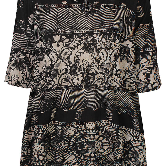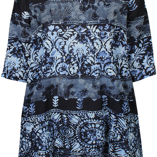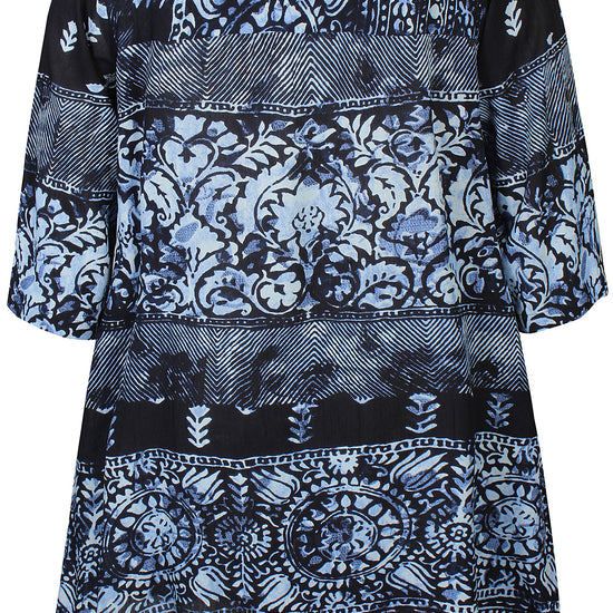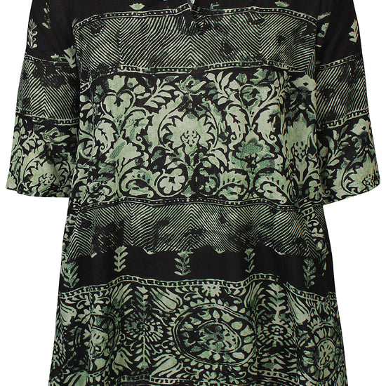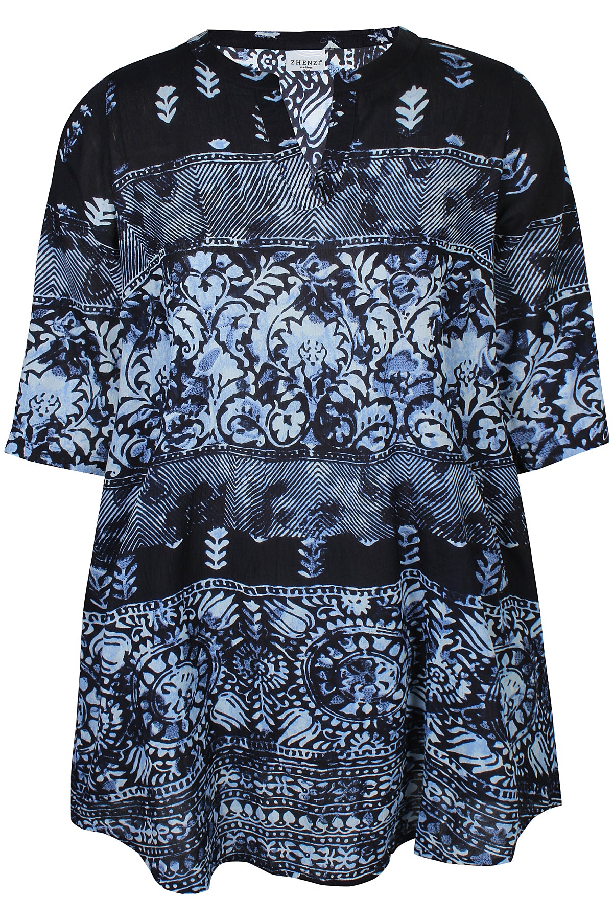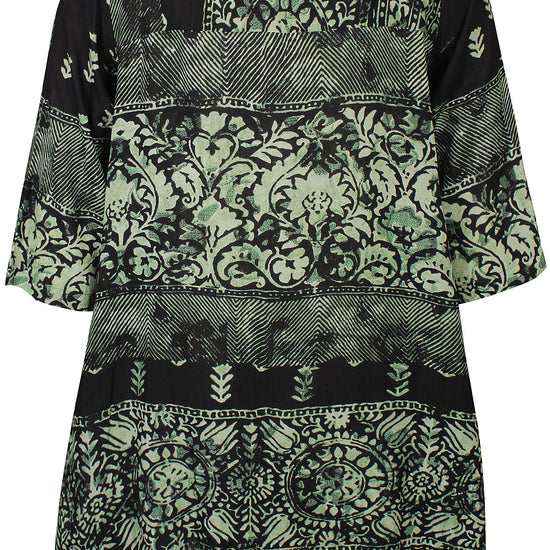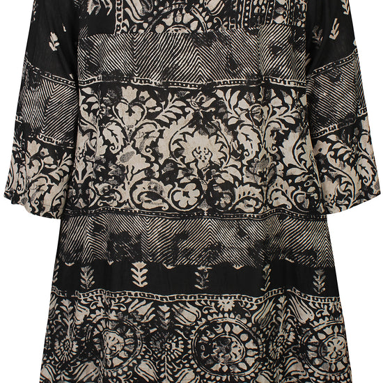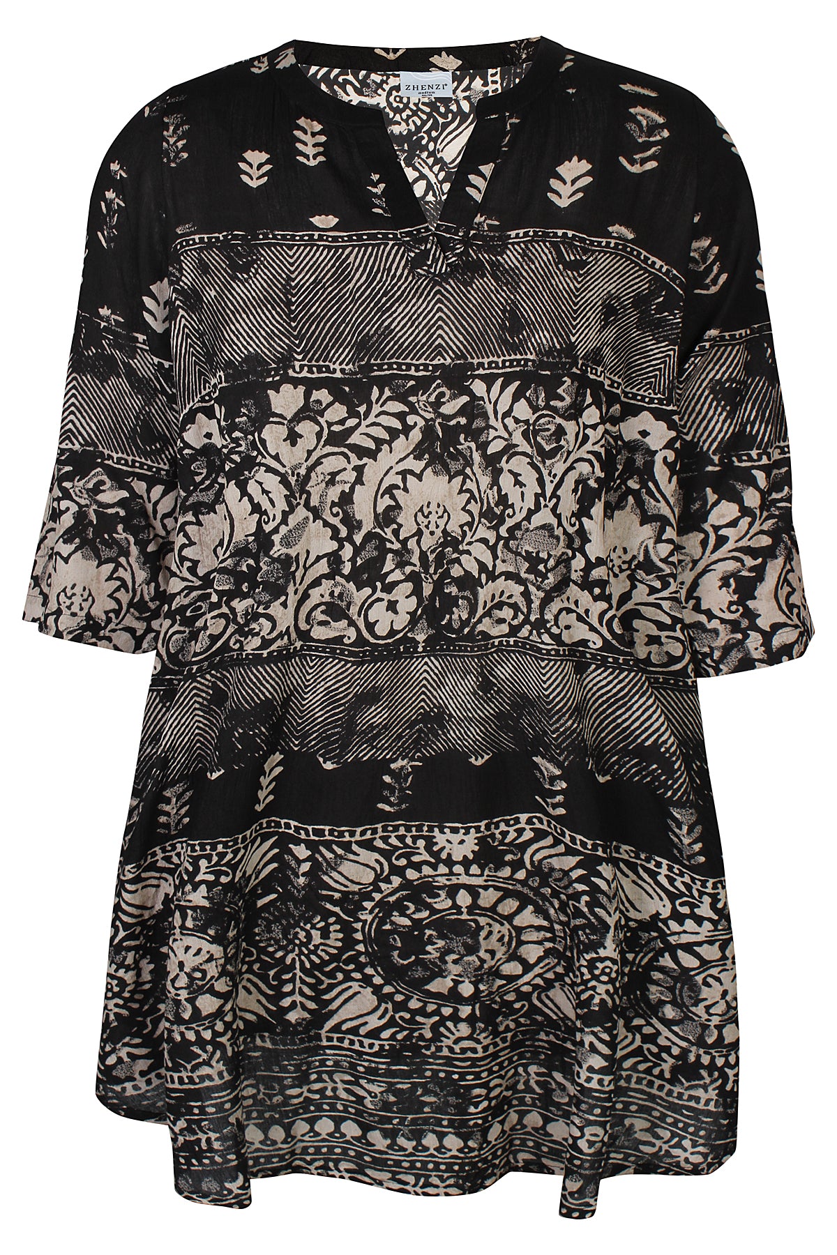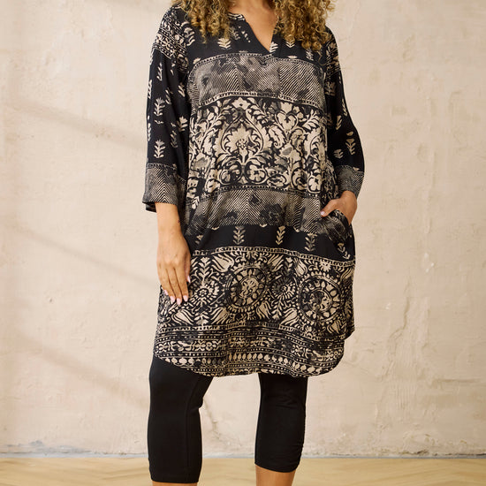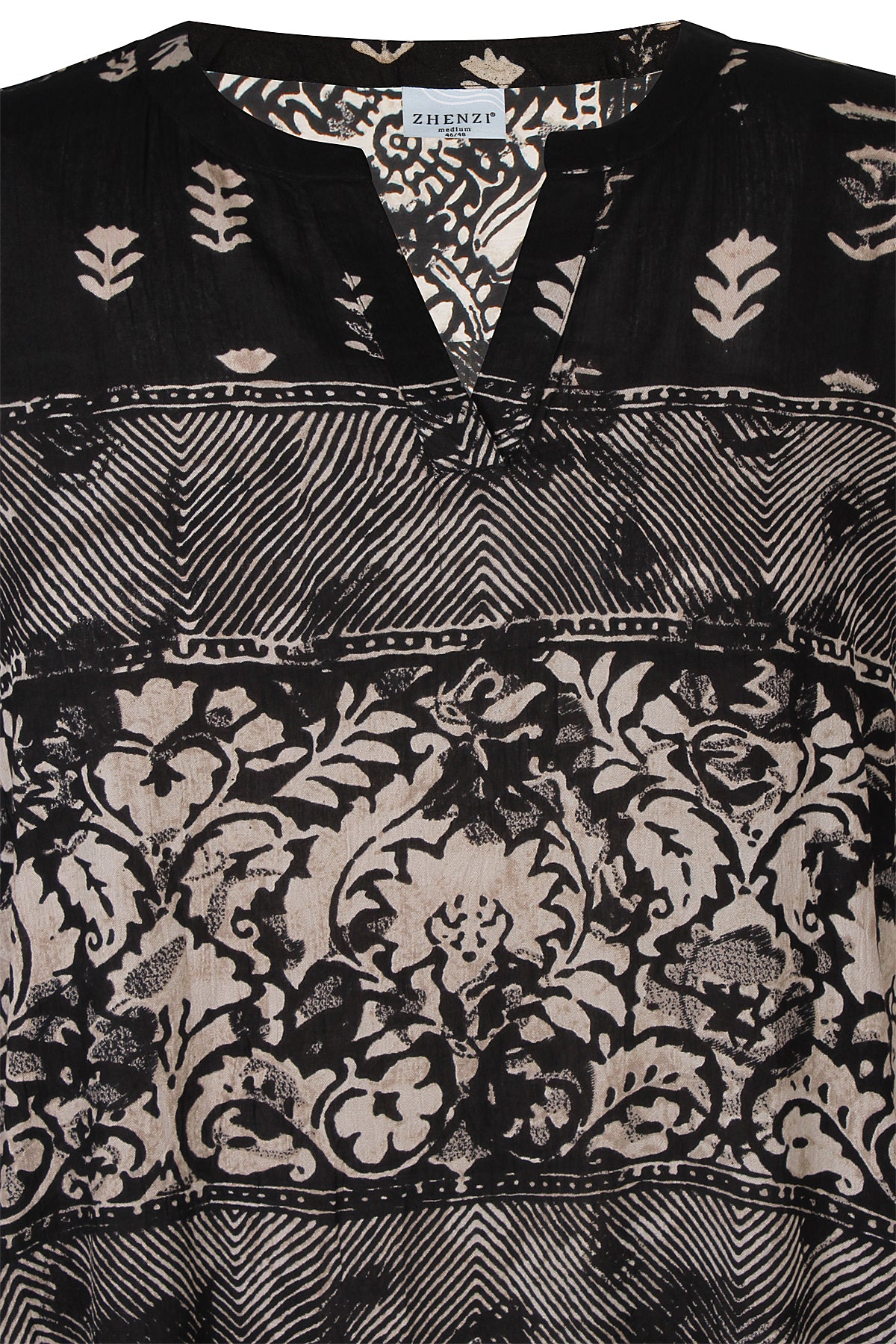 Denne elegante tunika fra Zhenzi er designet med et smukt grafisk mønster, der straks fanger blikket og giver kant til din garderobe. Modellen har en flatterende v-udskæring og 3/4-ærmer, som skaber et let og feminint udtryk perfekt til sæsonen. Kvaliteten er ren viskose, hvilket sikrer, at din nye plus size tunika falder blødt og behageligt omkring kroppen hele dagen.