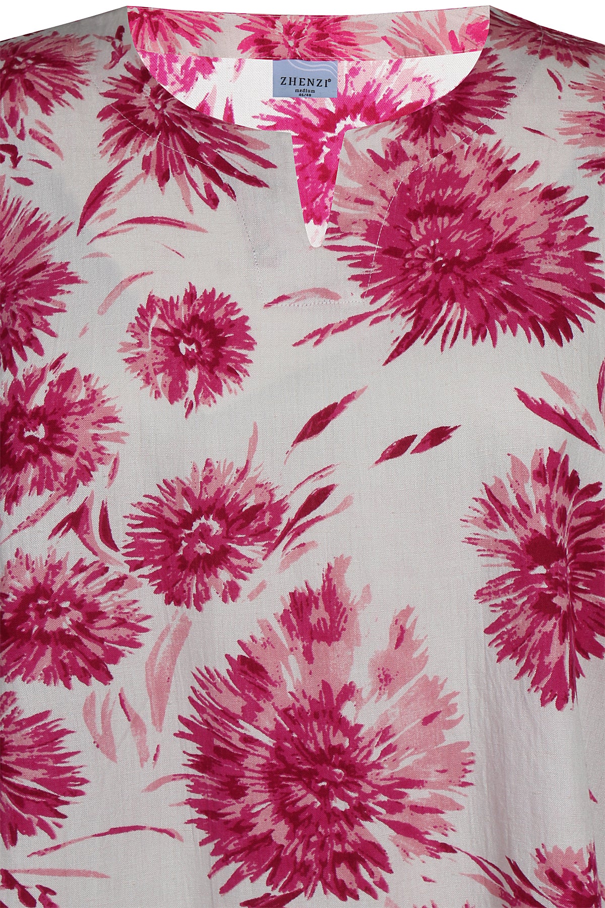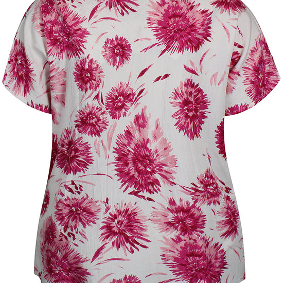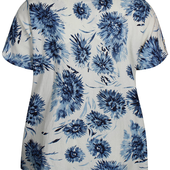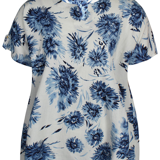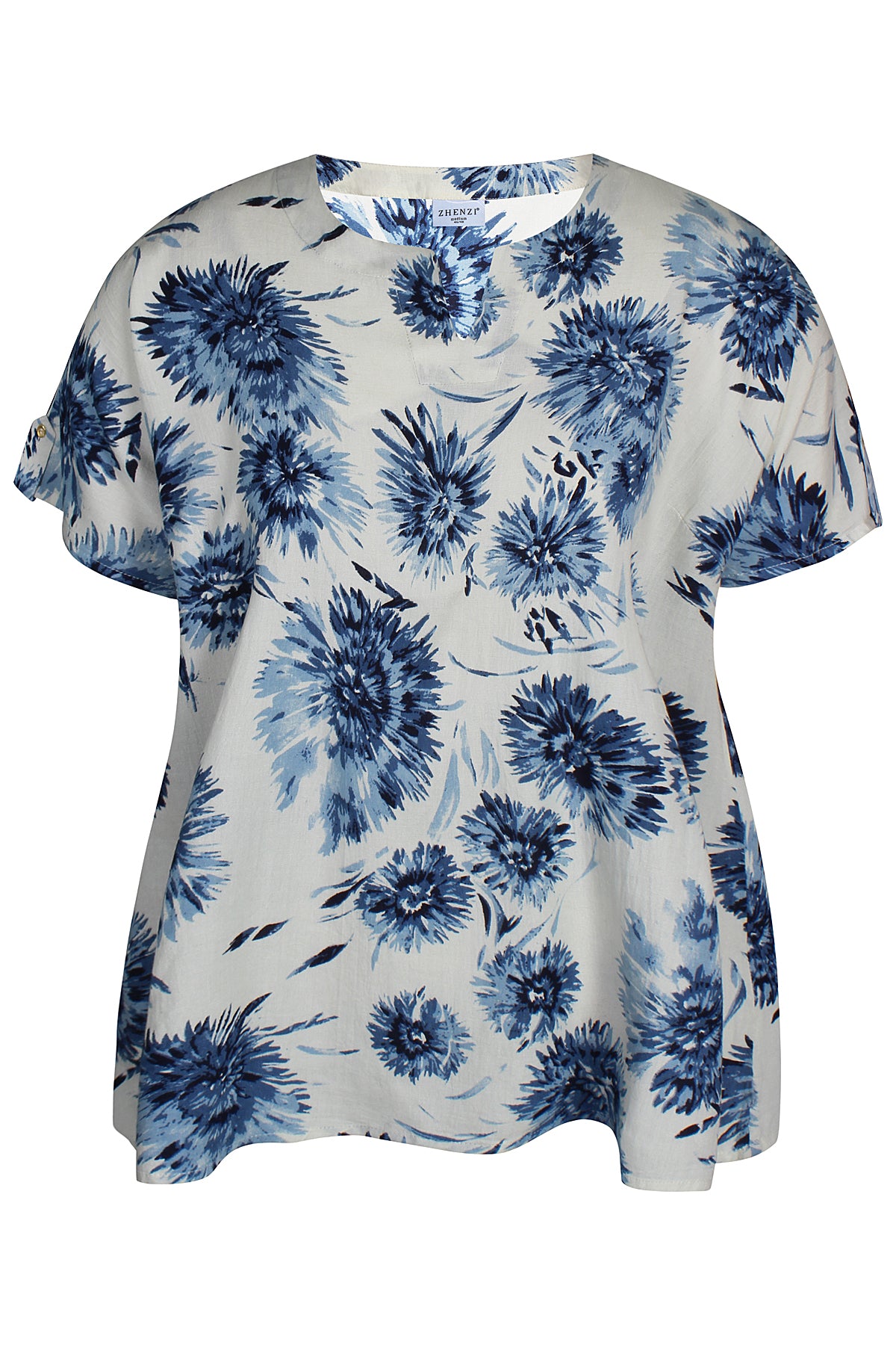 Denne skønne overdel fra Zhenzi er designet med et iøjnefaldende, stort blomsterprint, der tilføjer liv og farve til dit outfit. Blusen har korte ærmer afsluttet med en smart strop og knap-detalje, samt en elegant halsudskæring med et lille v-snit foran. Kvaliteten er en lækker blanding af 20% hør, 50% viskose og 30% bomuld, som føles let og åndbar mod huden.