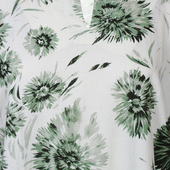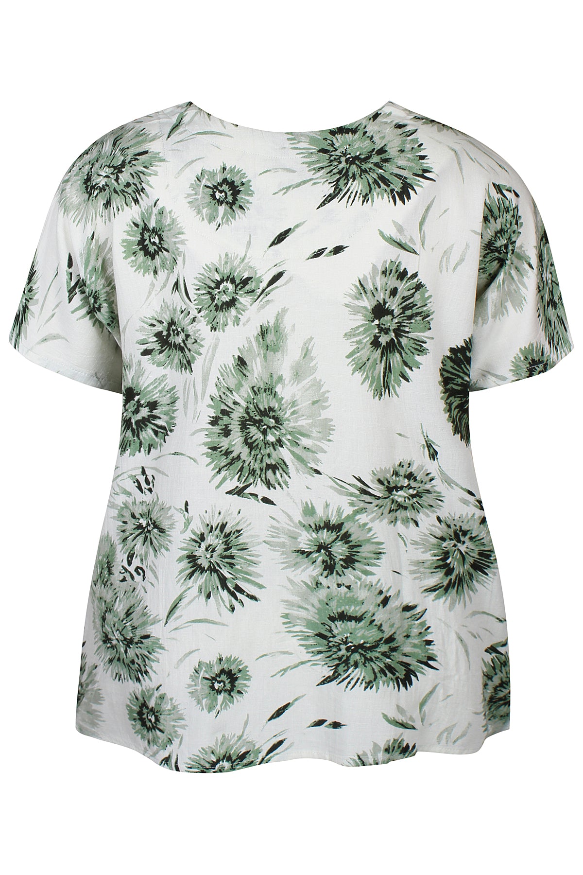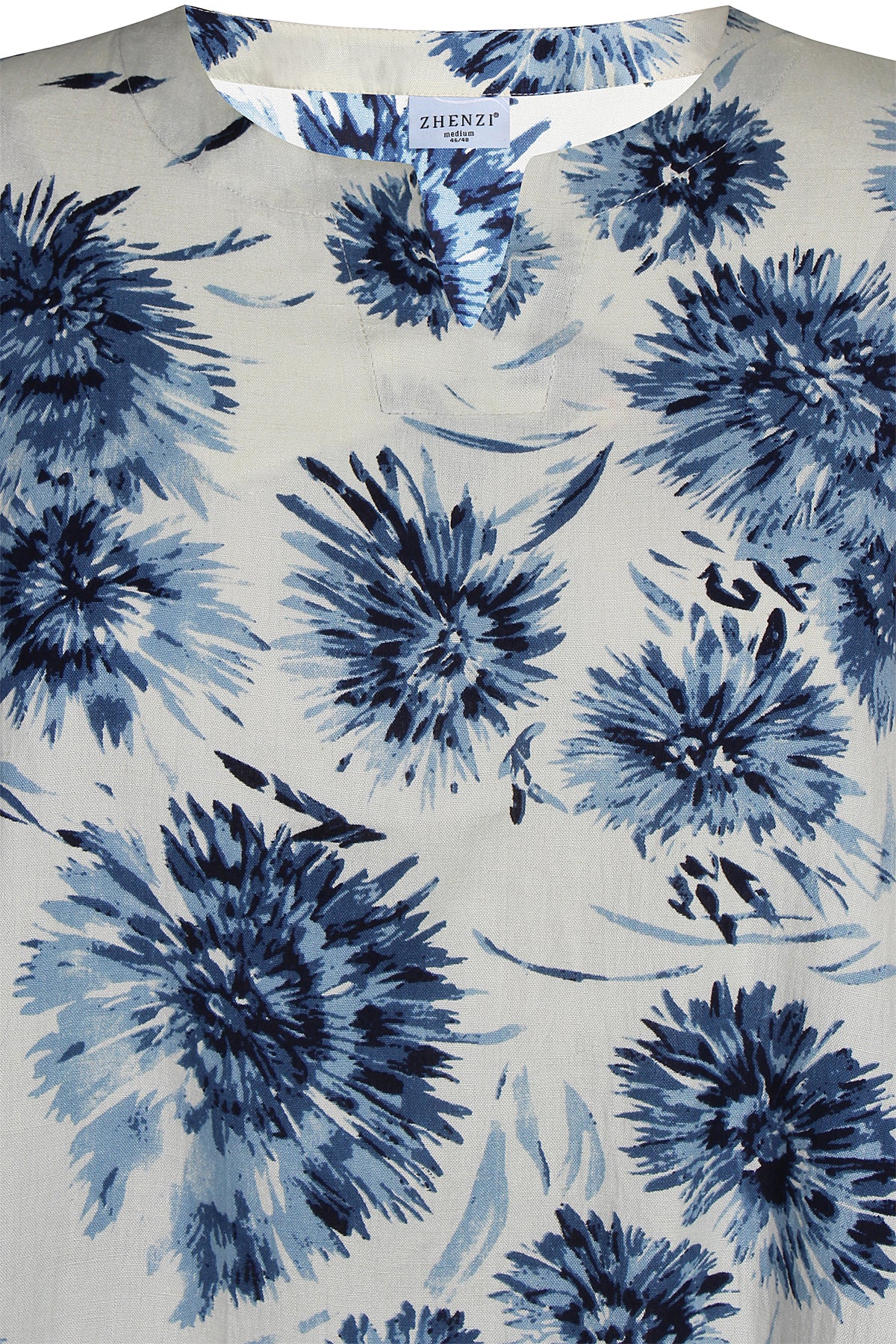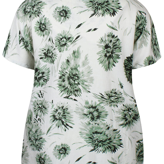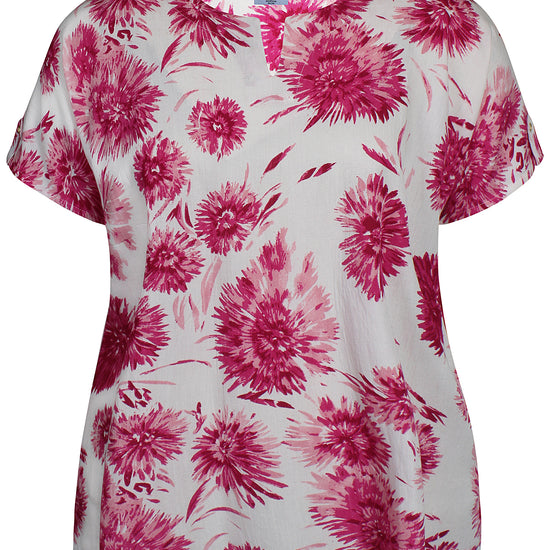 Denne skønne overdel fra Zhenzi er designet med et iøjnefaldende, stort blomsterprint, der tilføjer liv og farve til dit outfit. Blusen har korte ærmer afsluttet med en smart strop og knap-detalje, samt en elegant halsudskæring med et lille v-snit foran. Kvaliteten er en lækker blanding af 20% hør, 50% viskose og 30% bomuld, som føles let og åndbar mod huden.