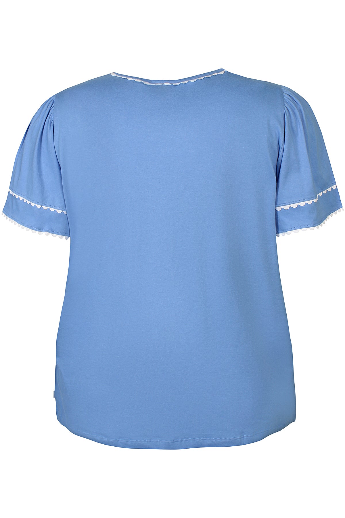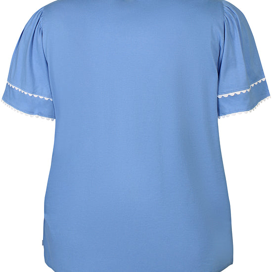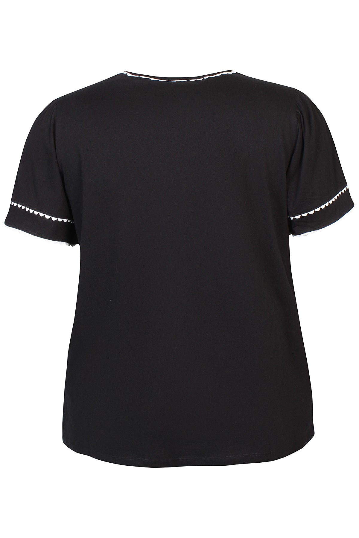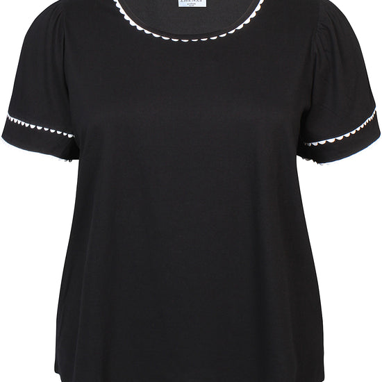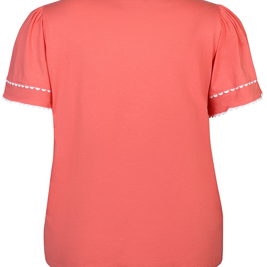 Uanset om du vælger den tidløse sorte, den livlige koral poppy eller den friske cornflower blue, vil du finde en farve, der passer til din stil. De dekorative detaljer på ærmerne og halsudskæringen tilføjer et feminint touch, hvilket gør denne T-shirt til en alsidig tilføjelse til din garderobe. Kombiner den med plus size jeans eller en plus size nederdel for et komplet look.