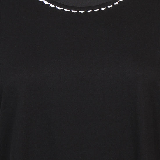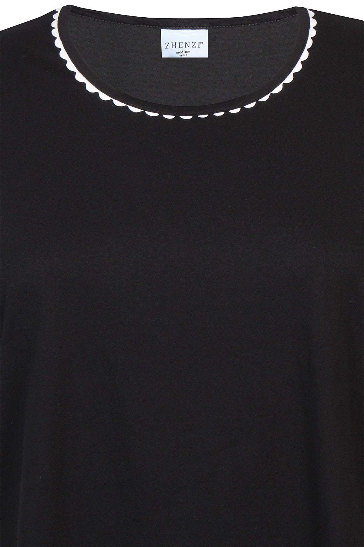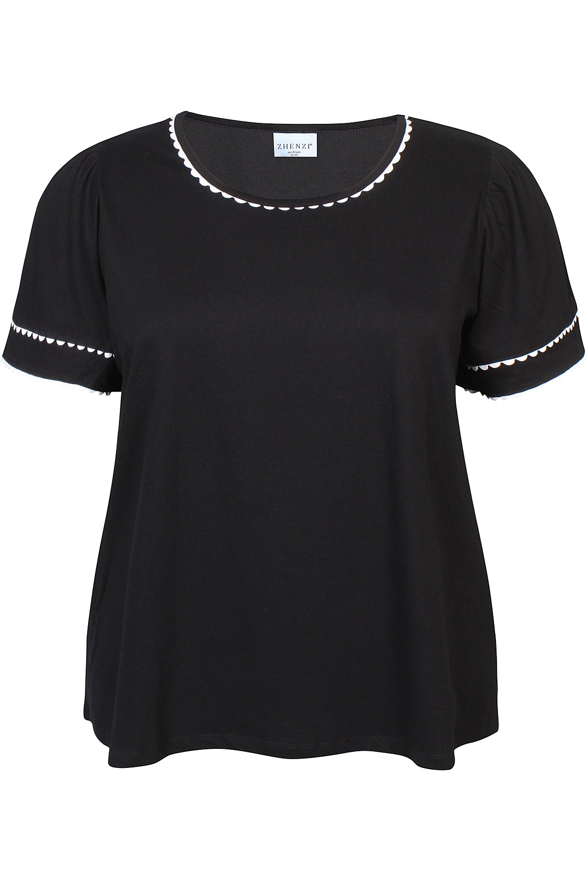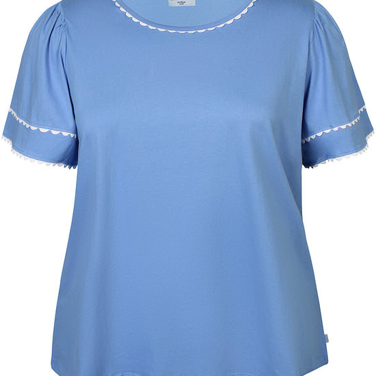 Uanset om du vælger den tidløse sorte, den livlige koral poppy eller den friske cornflower blue, vil du finde en farve, der passer til din stil. De dekorative detaljer på ærmerne og halsudskæringen tilføjer et feminint touch, hvilket gør denne T-shirt til en alsidig tilføjelse til din garderobe. Kombiner den med plus size jeans eller en plus size nederdel for et komplet look.