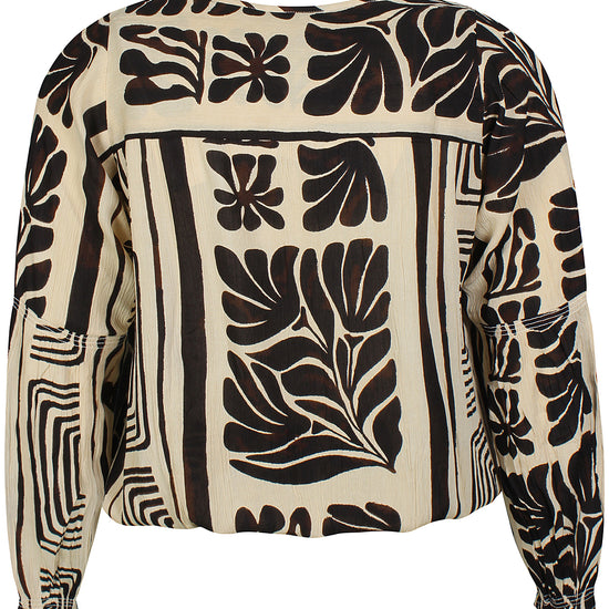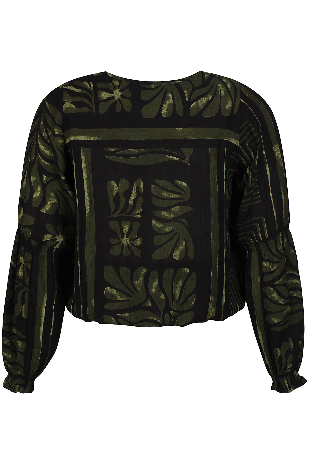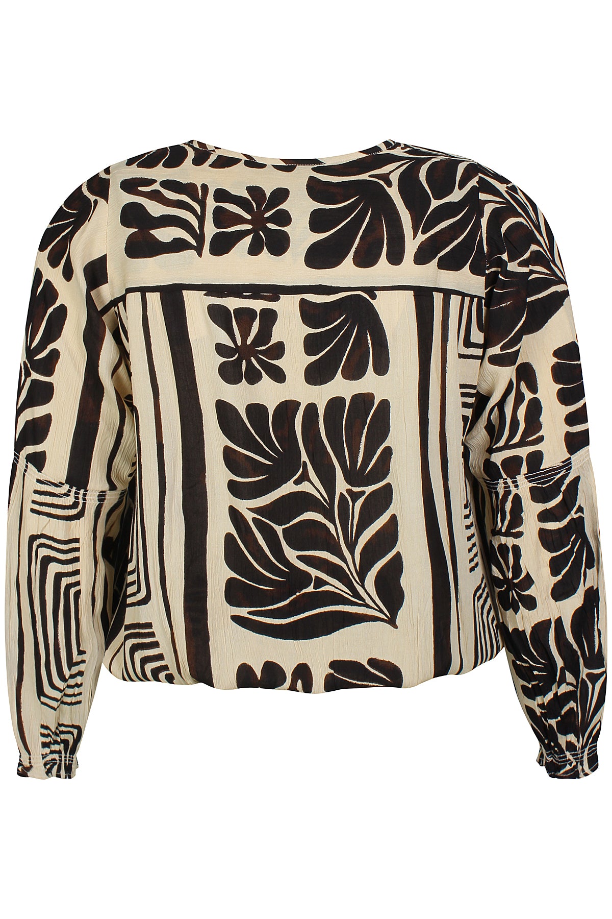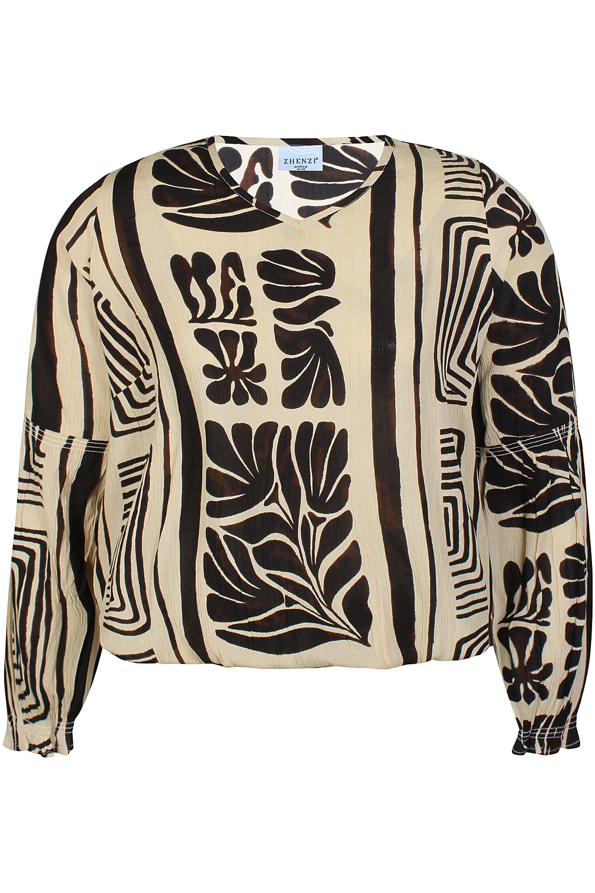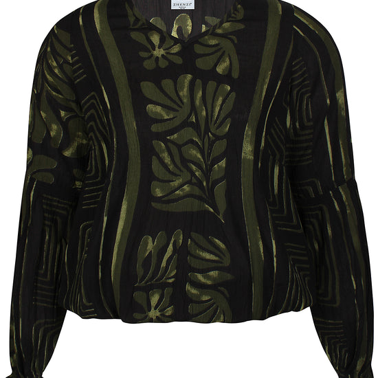 Blusen kommer i to sofistikerede farver: chokolade og army way, der begge tilføjer et strejf af elegance til din garderobe. Det iøjnefaldende mønster med store, abstrakte blade og geometriske figurer skaber et unikt look, der vil fange opmærksomheden. Uanset om du vælger at bære den til hverdag eller til en festlig anledning, vil denne bluse være et stilfuldt valg.
