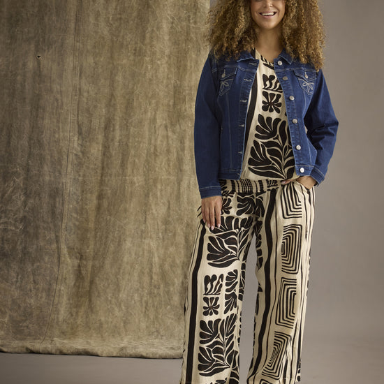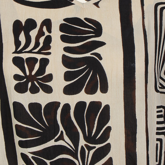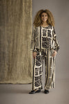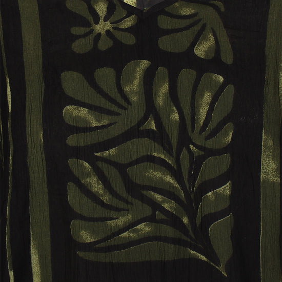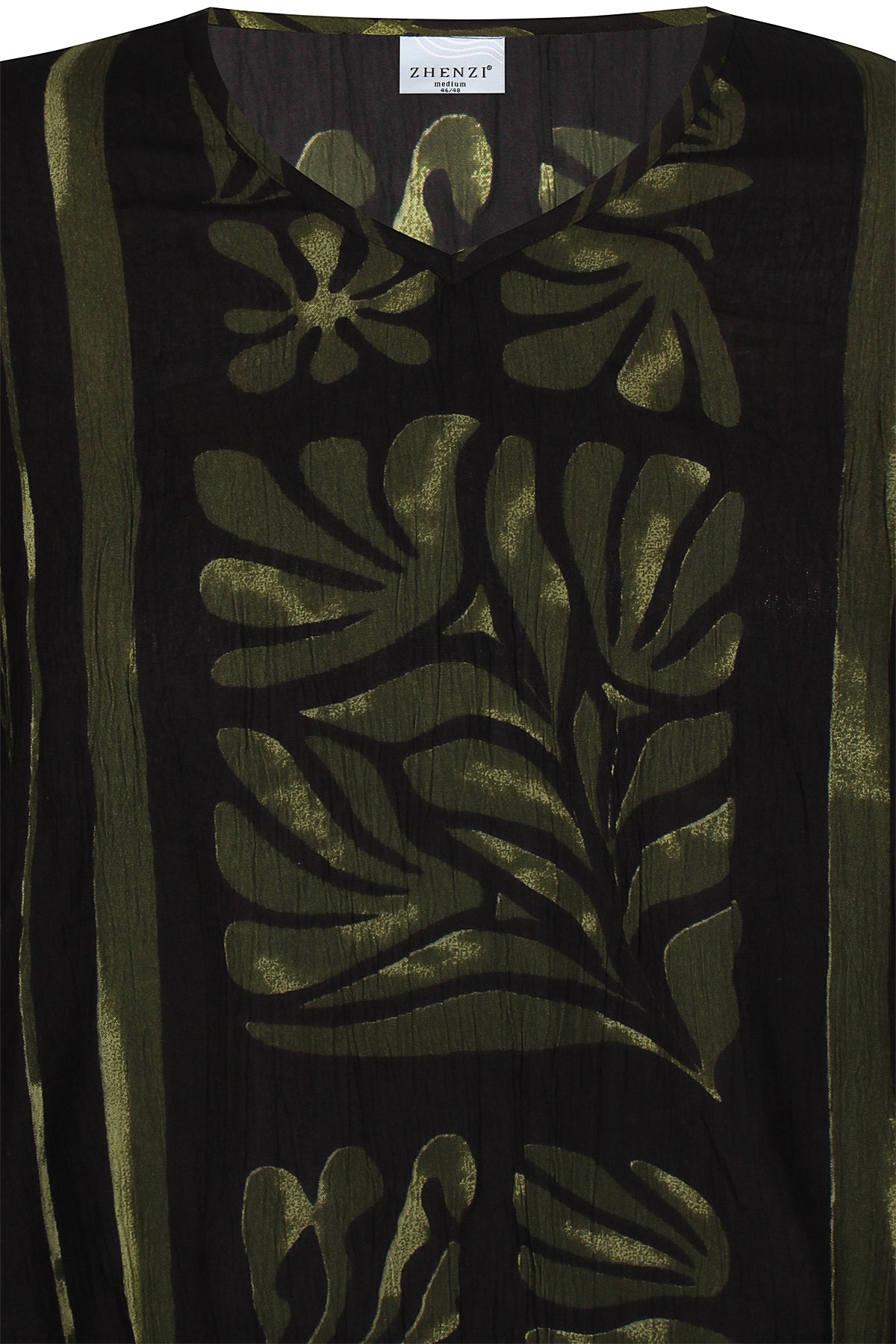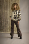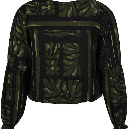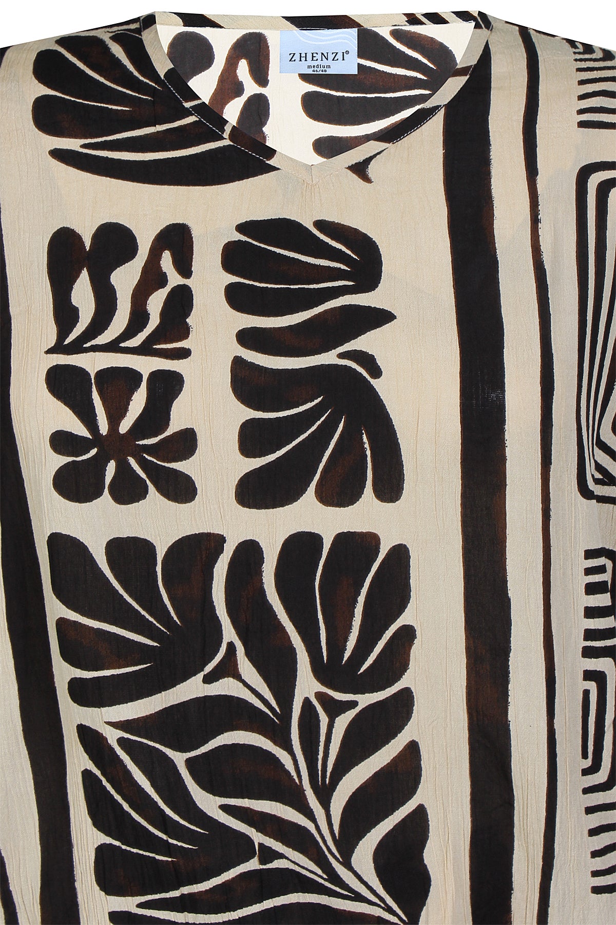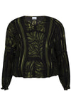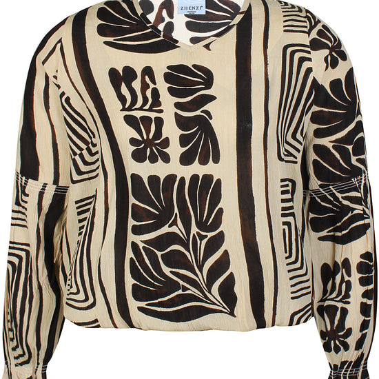 Blusen kommer i to sofistikerede farver: chokolade og army way, der begge tilføjer et strejf af elegance til din garderobe. Det iøjnefaldende mønster med store, abstrakte blade og geometriske figurer skaber et unikt look, der vil fange opmærksomheden. Uanset om du vælger at bære den til hverdag eller til en festlig anledning, vil denne bluse være et stilfuldt valg.