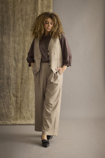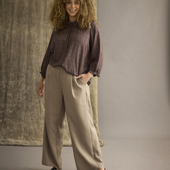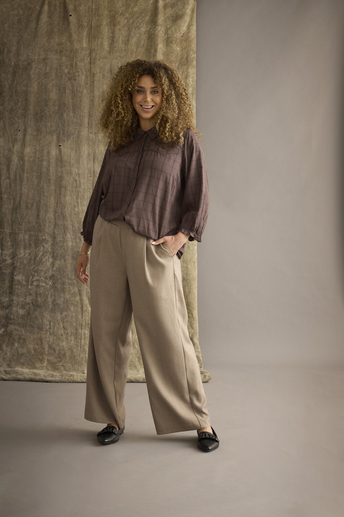 Opdag de stilfulde chokoladefarvede bukser fra Zhenzi, der kombinerer klassisk design med moderne komfort. Disse bukser er skabt til at give dig et elegant look, uanset om du er til en formel begivenhed eller en afslappet dag på kontoret. Med en lige, bred benform og høj talje, fremhæver de din silhuet på smukkeste vis.