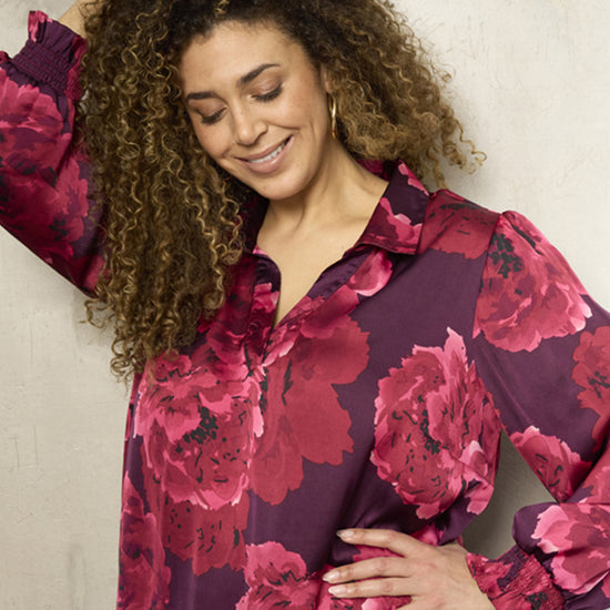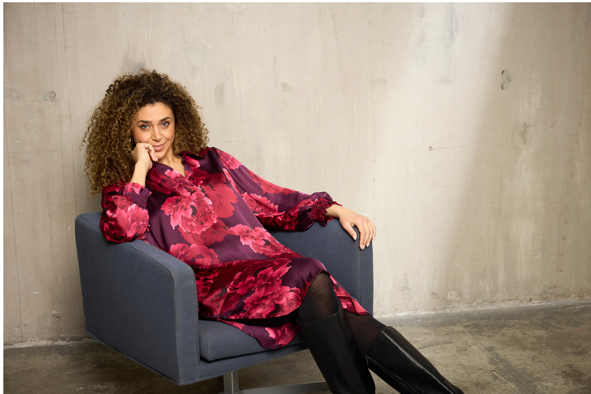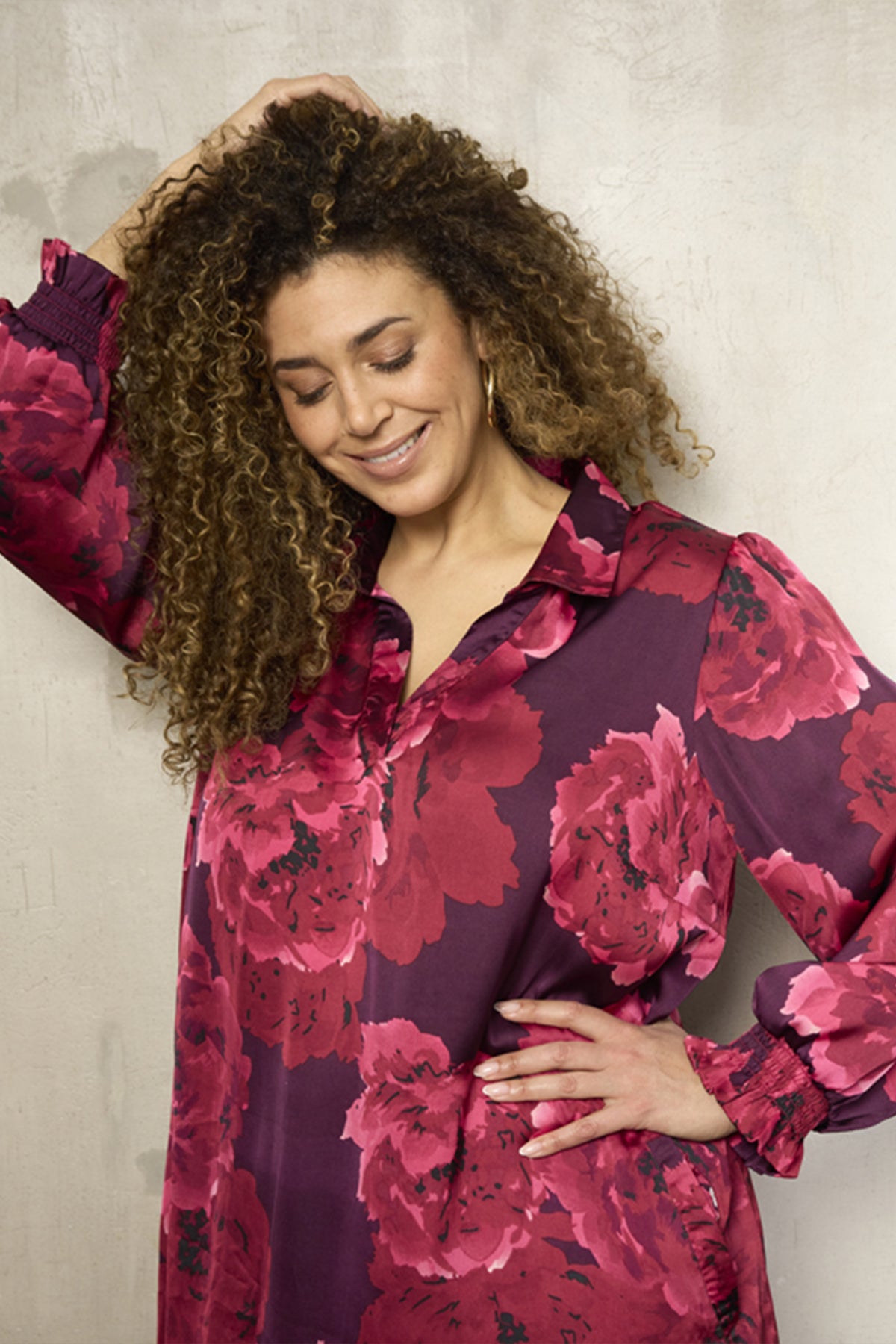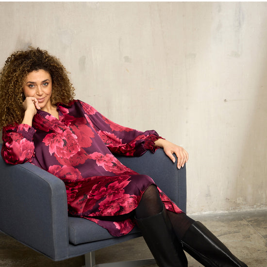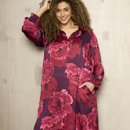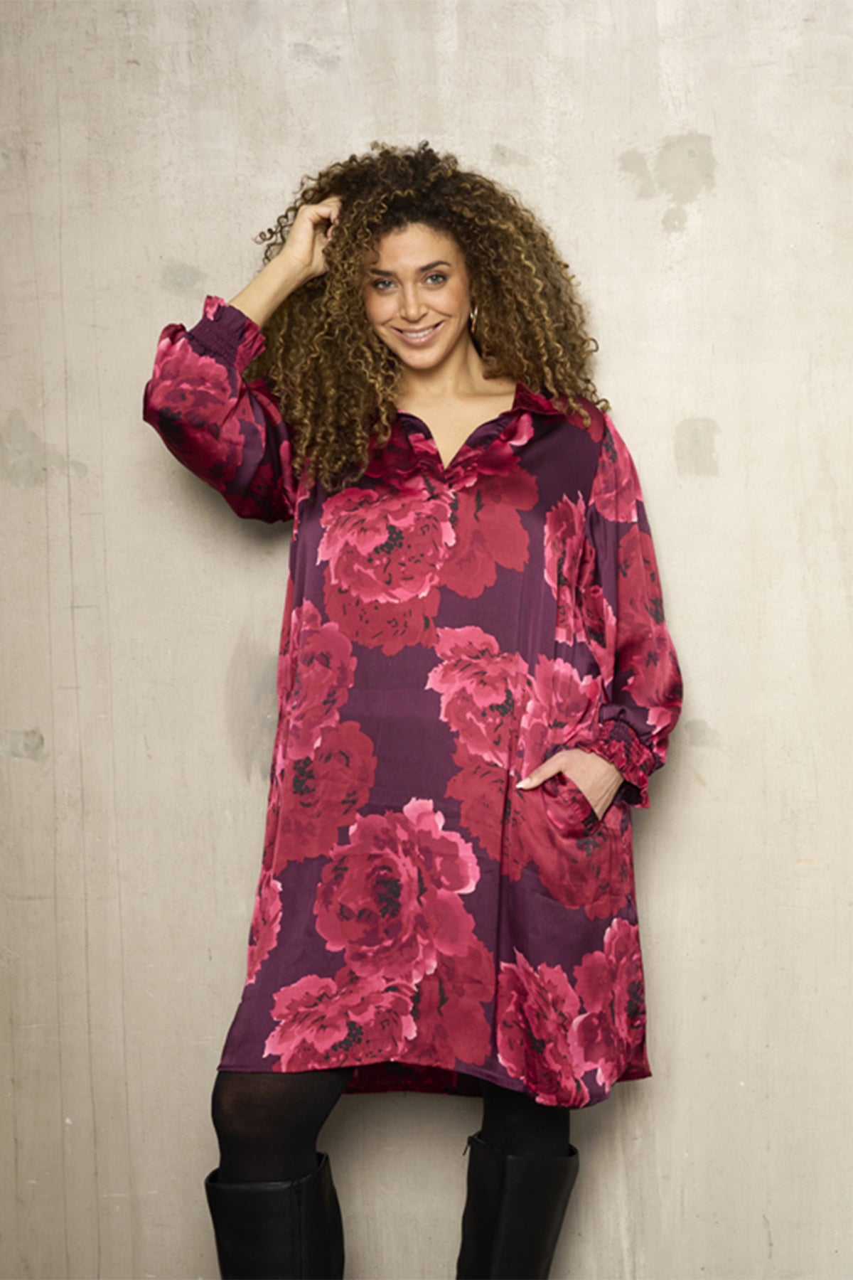Giv garderoben et frisk pust med denne smukke kjole fra Zhenzi. Kjolen er fremstillet i 100% blød viskose og har et løstsiddende, feminint fit, som gør den behagelig at bære hele dagen. Det storblomstrede print i nuancer af maroon, blå og grøn skaber et levende og moderne udtryk.