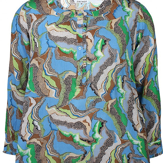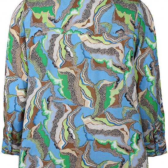 Printet bluse med rund hals med lille flæsedetalje. Knapper foran