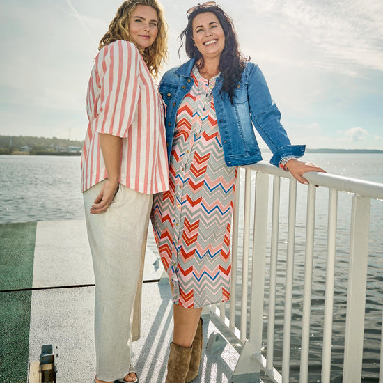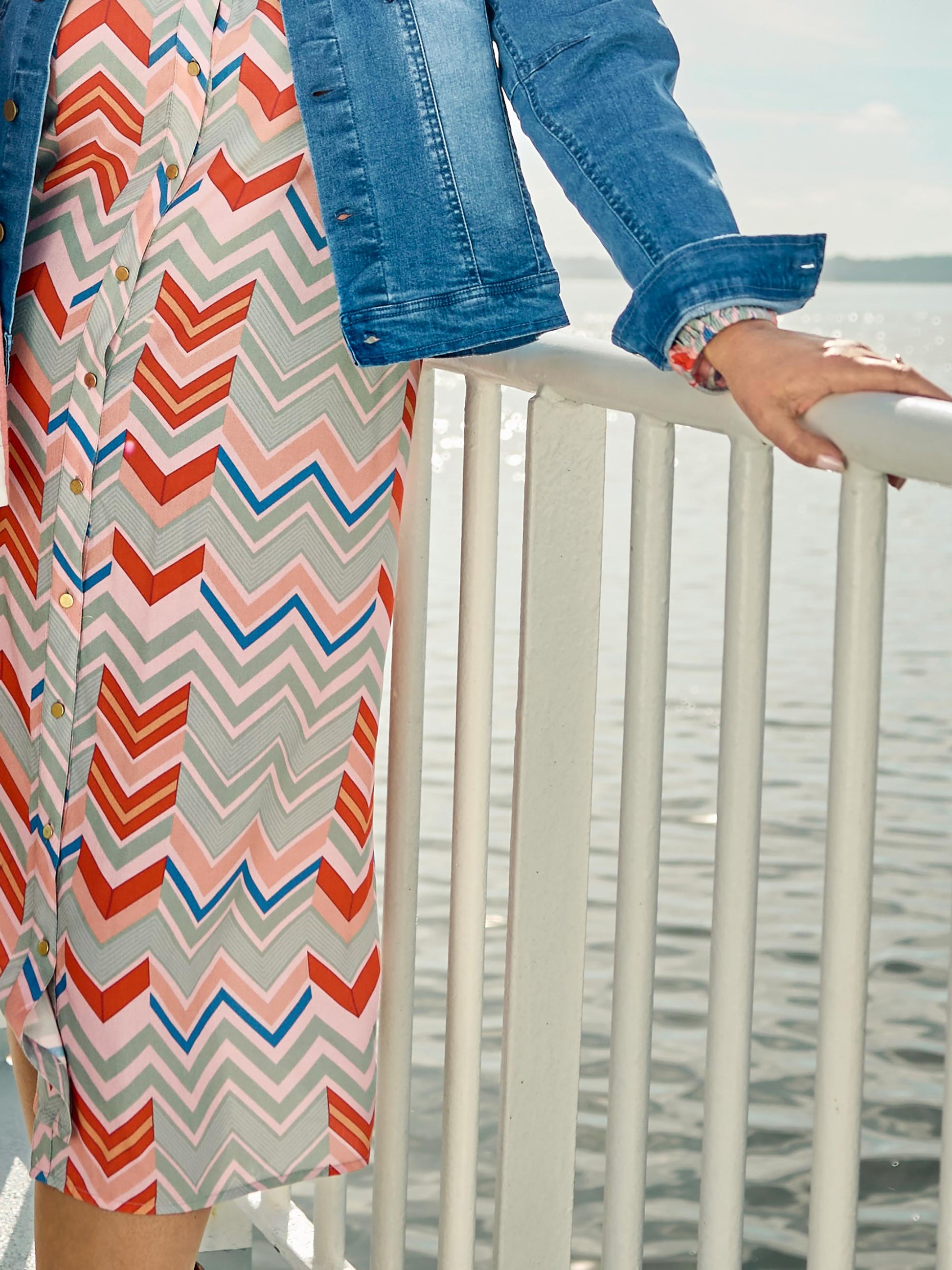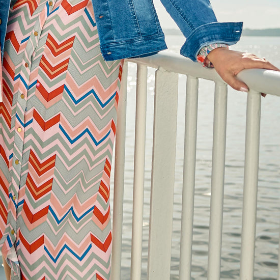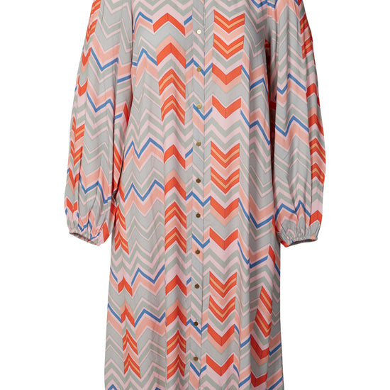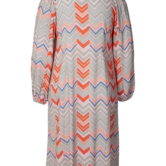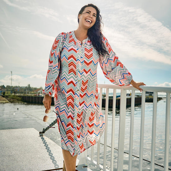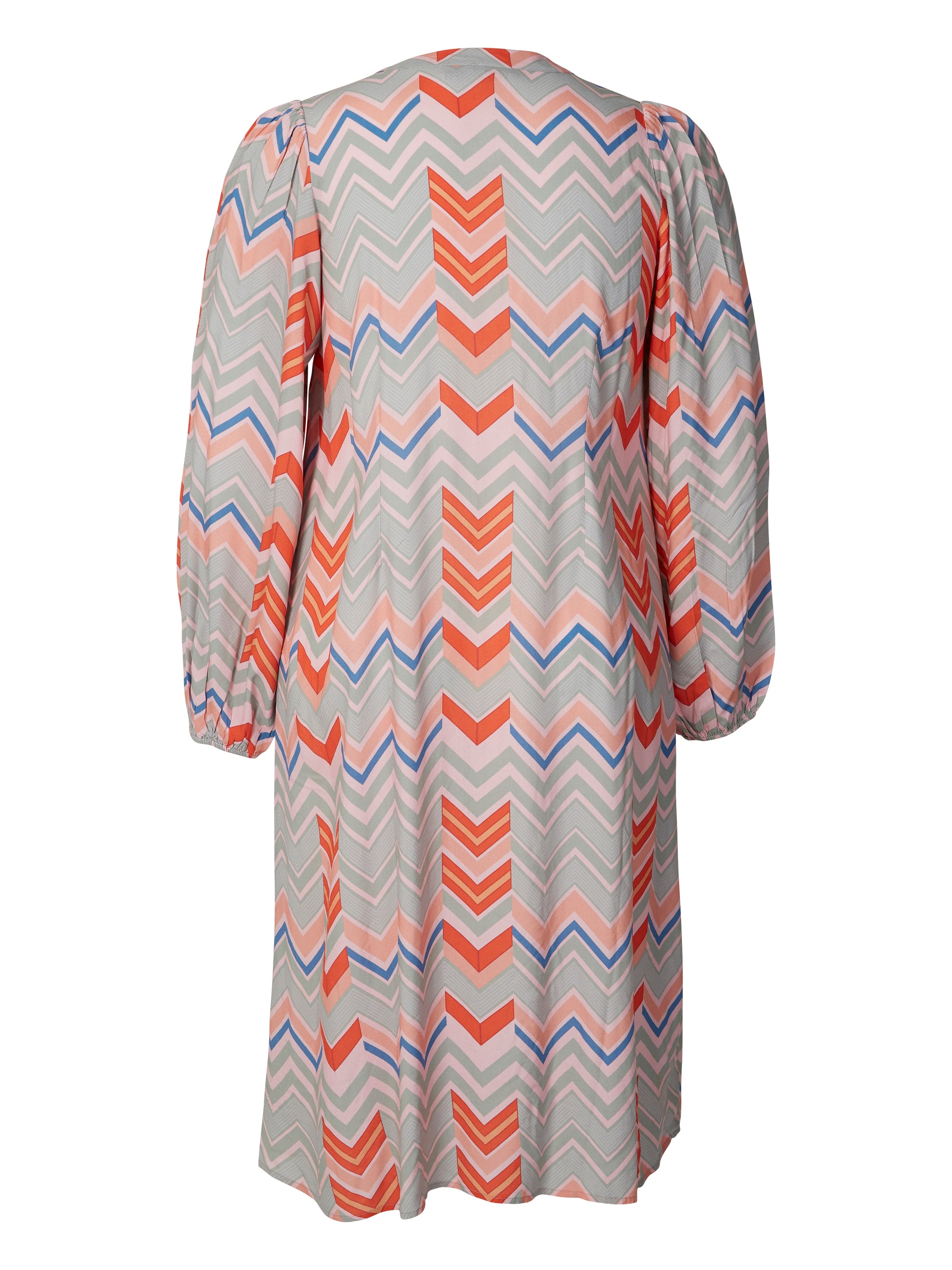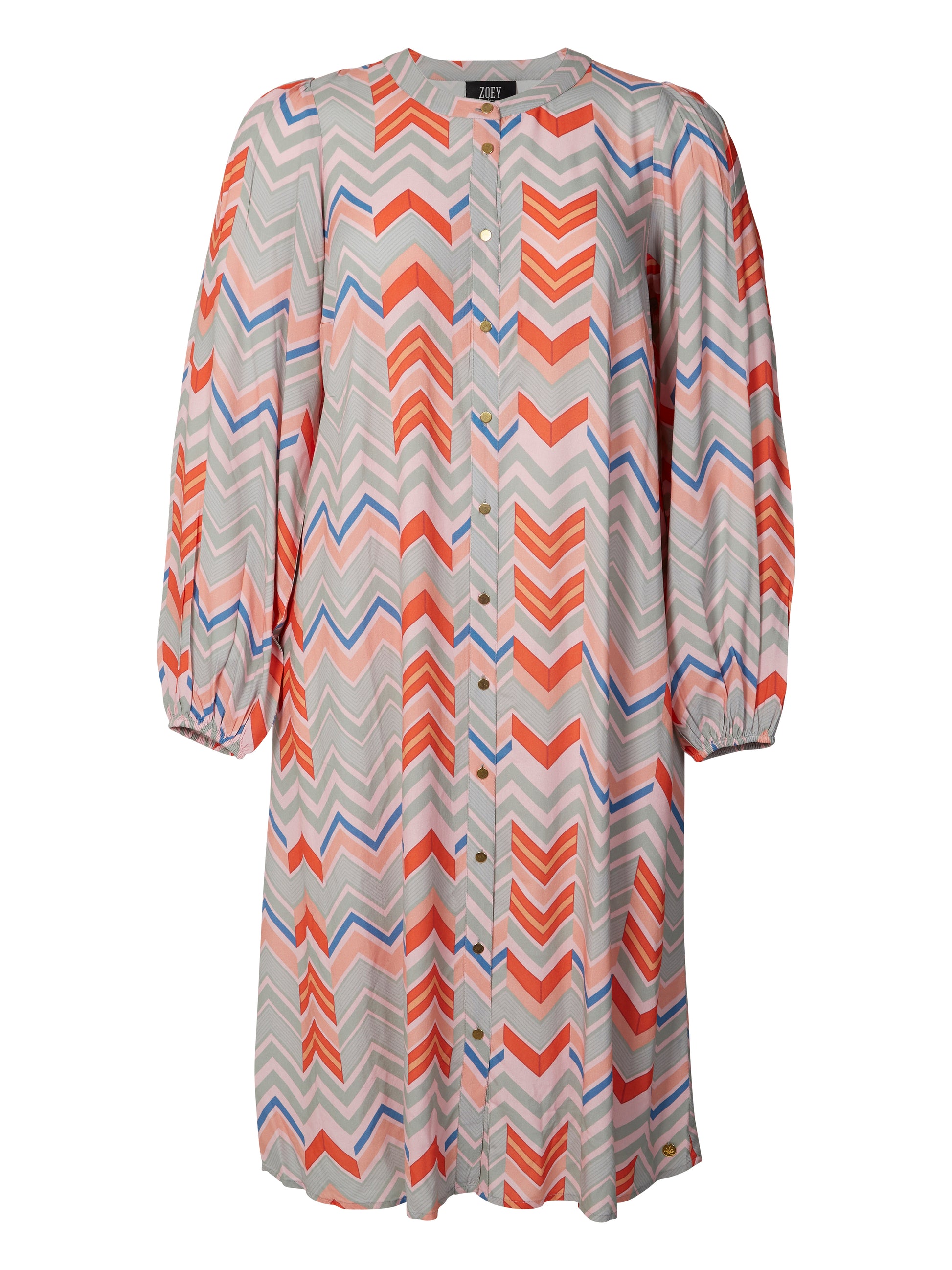 Giv din garderobe et frisk pust med denne kjole fra ZOEY. Kjolen er fremstillet i 100% viskose, som gør den let og behagelig at have på. Det farverige zigzag-mønster i orange, blå, hvid og lysegrå skaber et livligt og moderne udtryk. Passer perfekt til dig, der ønsker både komfort og stil.