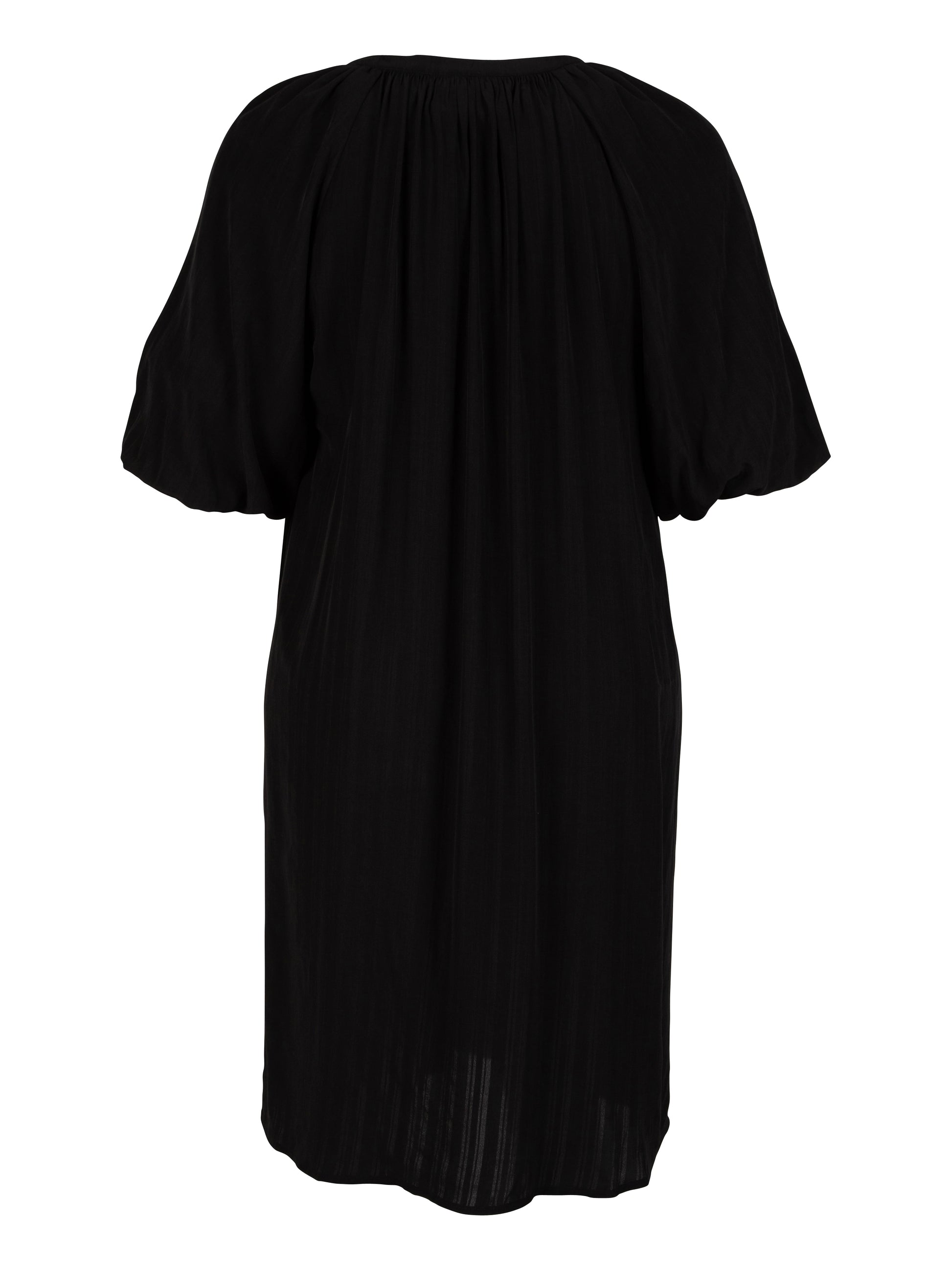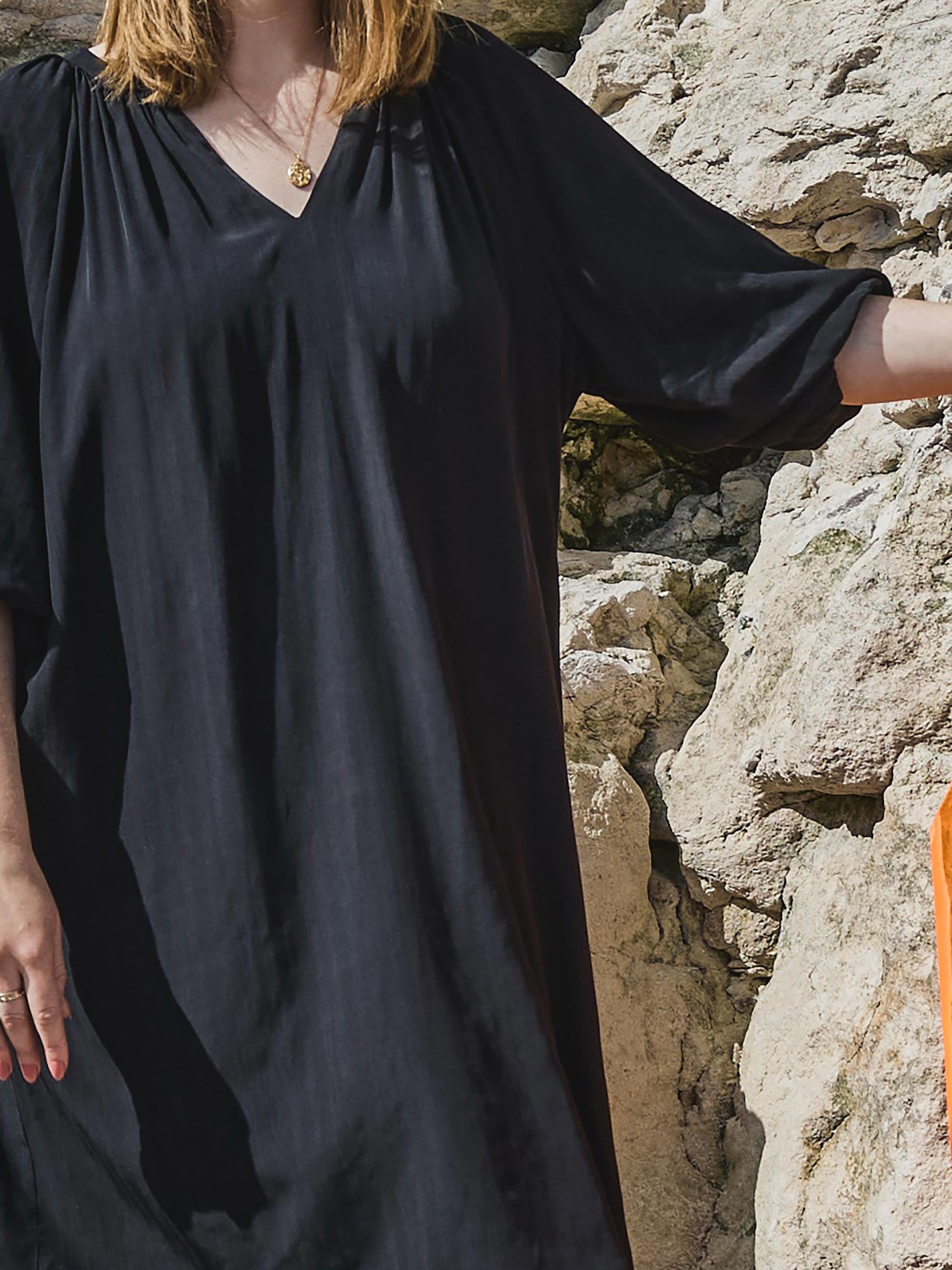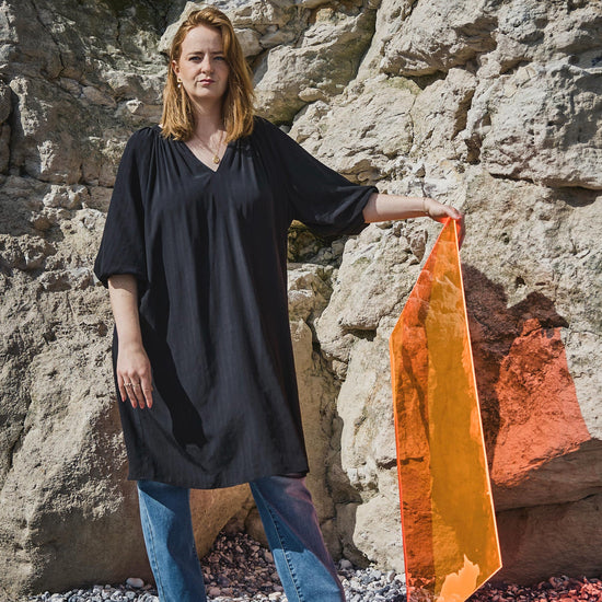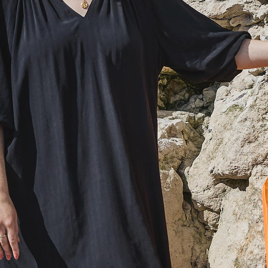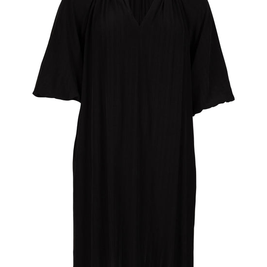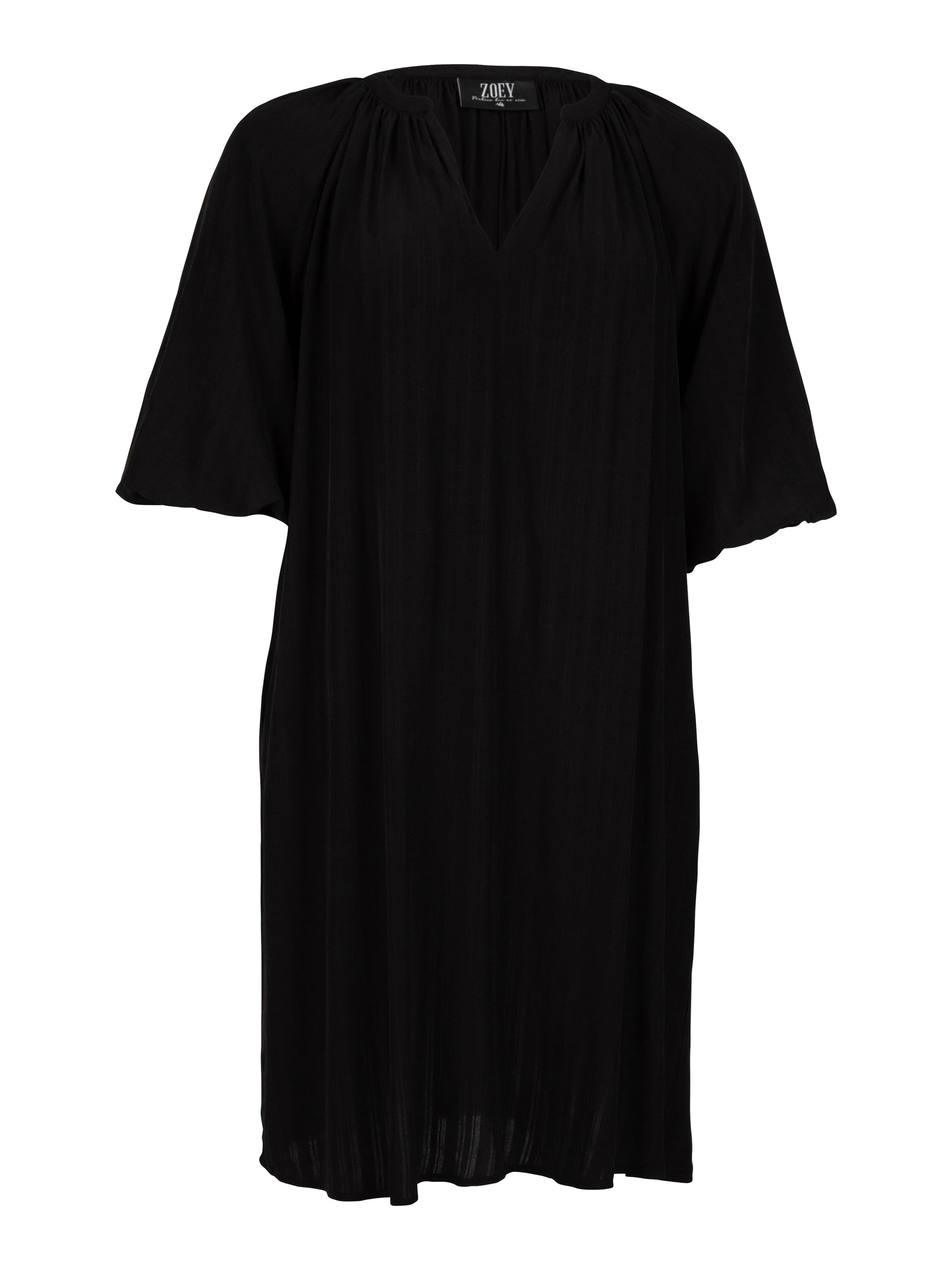 Den sorte kjole fra ZOEY kombinerer komfort og stil med sit løse fit og trekvartlange ærmer. Det lette materiale i 80% viskose og 20% polyester giver en blød, behagelig fornemmelse og et flot fald på kroppen. Kjolen er ideel både alene og over bukser for et afslappet, men moderne udtryk.