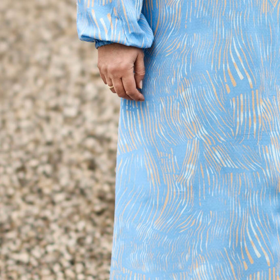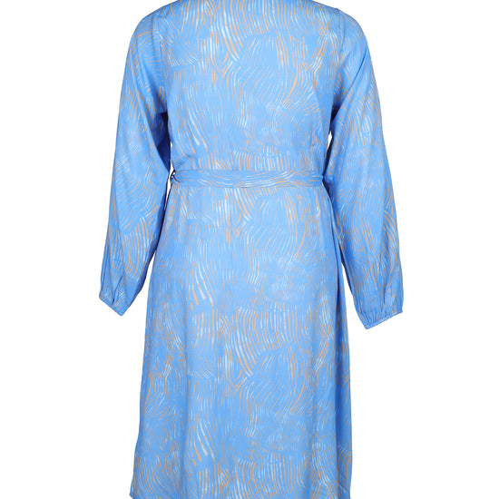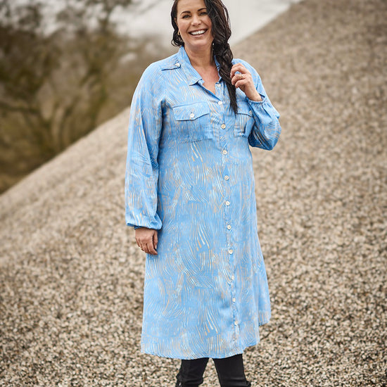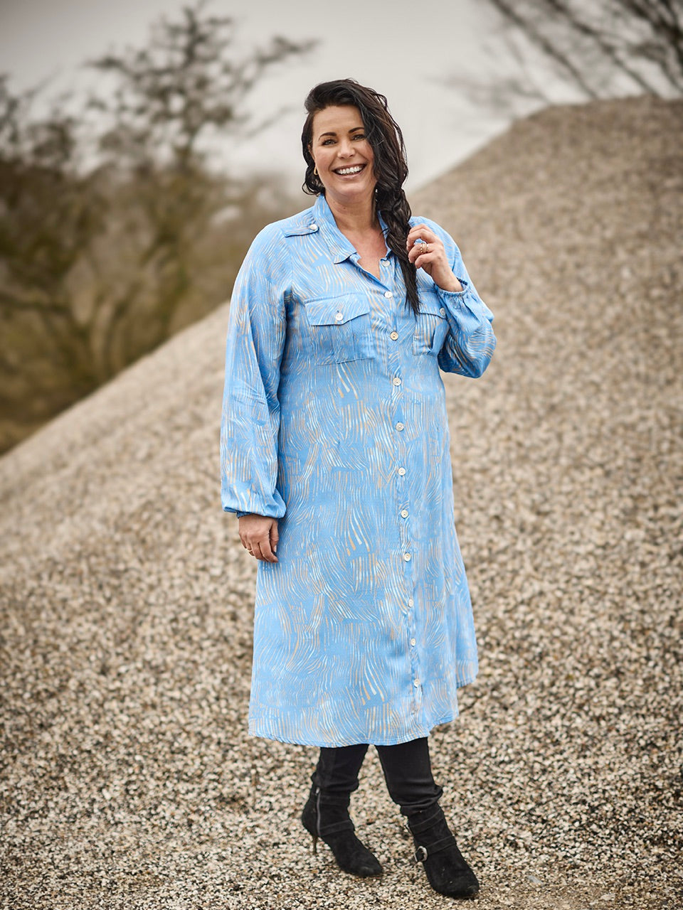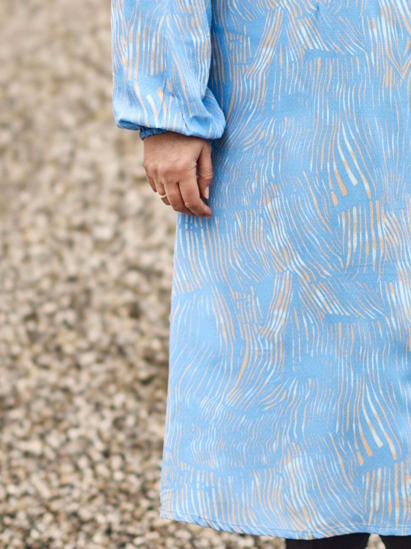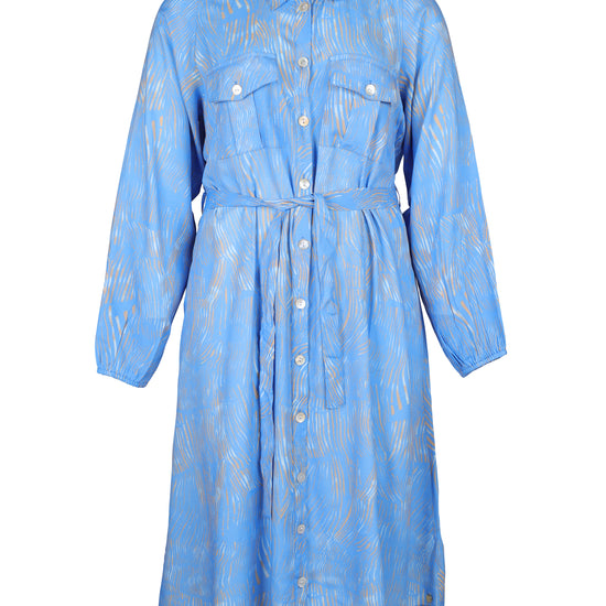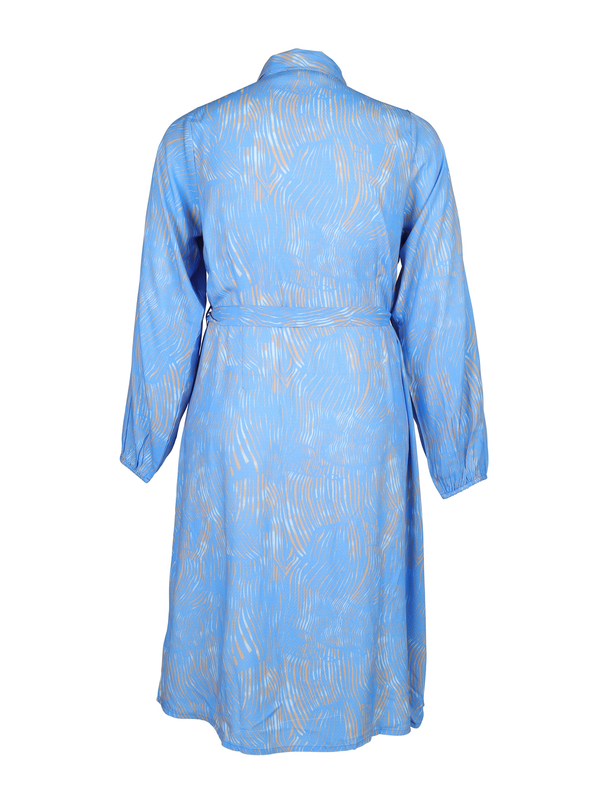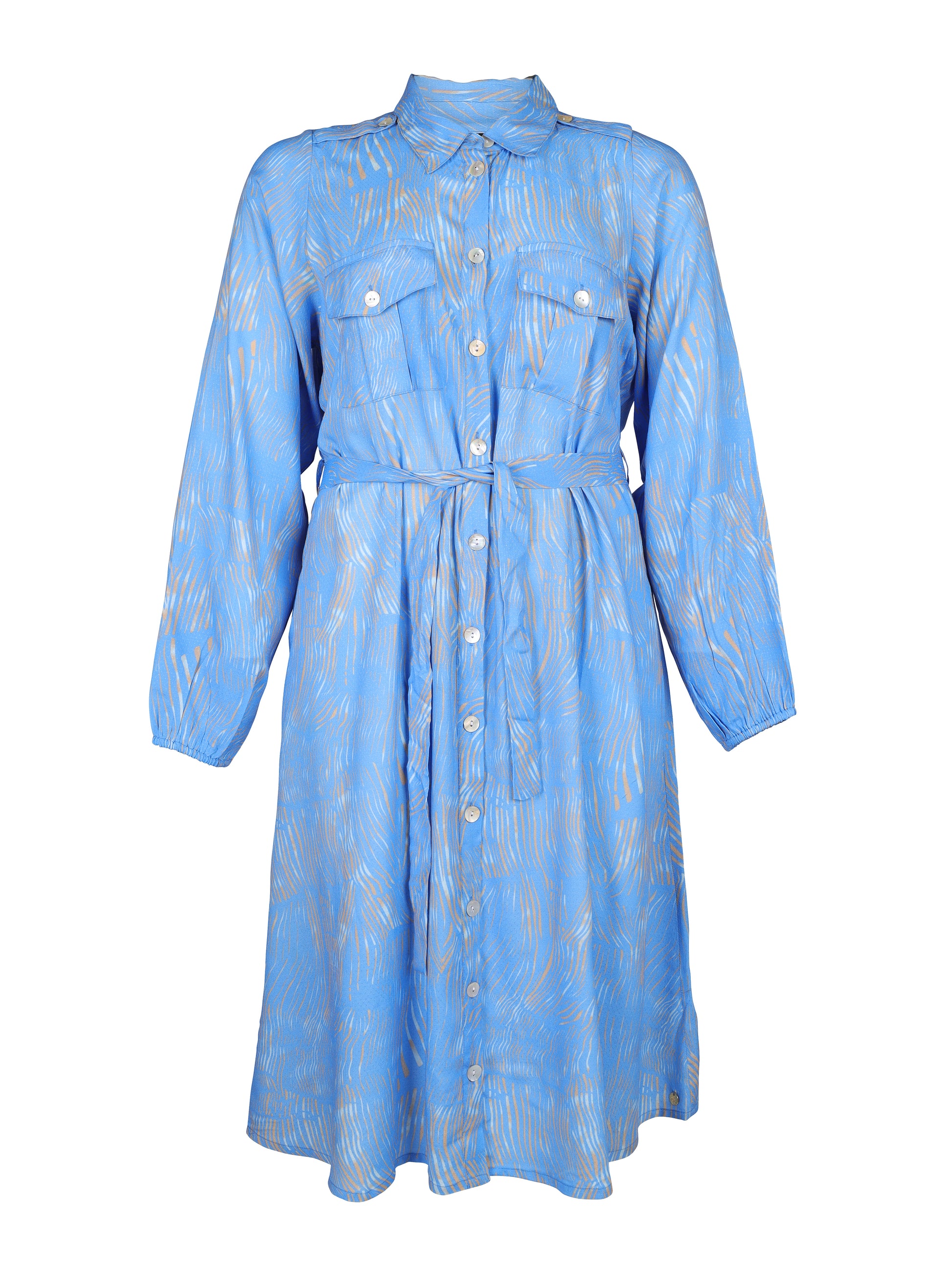 Skab et friskt og feminint look med denne smukke skjortekjole fra ZOEY. Kjolen er lavet i 100% viskose, som giver en blød og behagelig fornemmelse mod huden. Det lyseblå stof med et diskret hvidt mønster gør kjolen oplagt til både hverdag og afslappede anledninger.